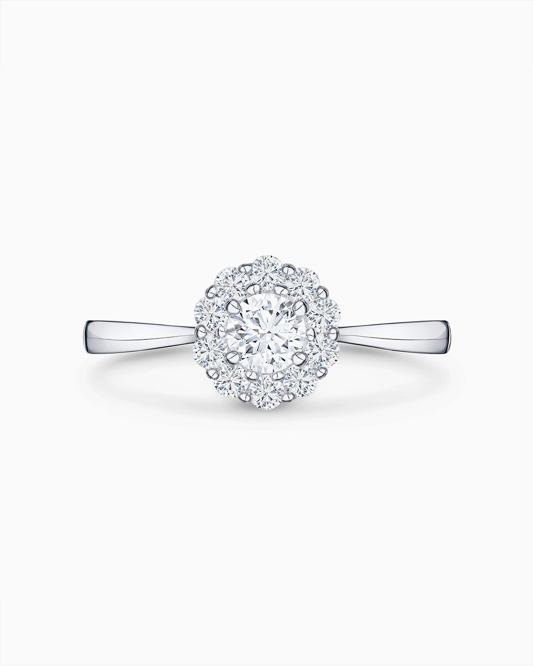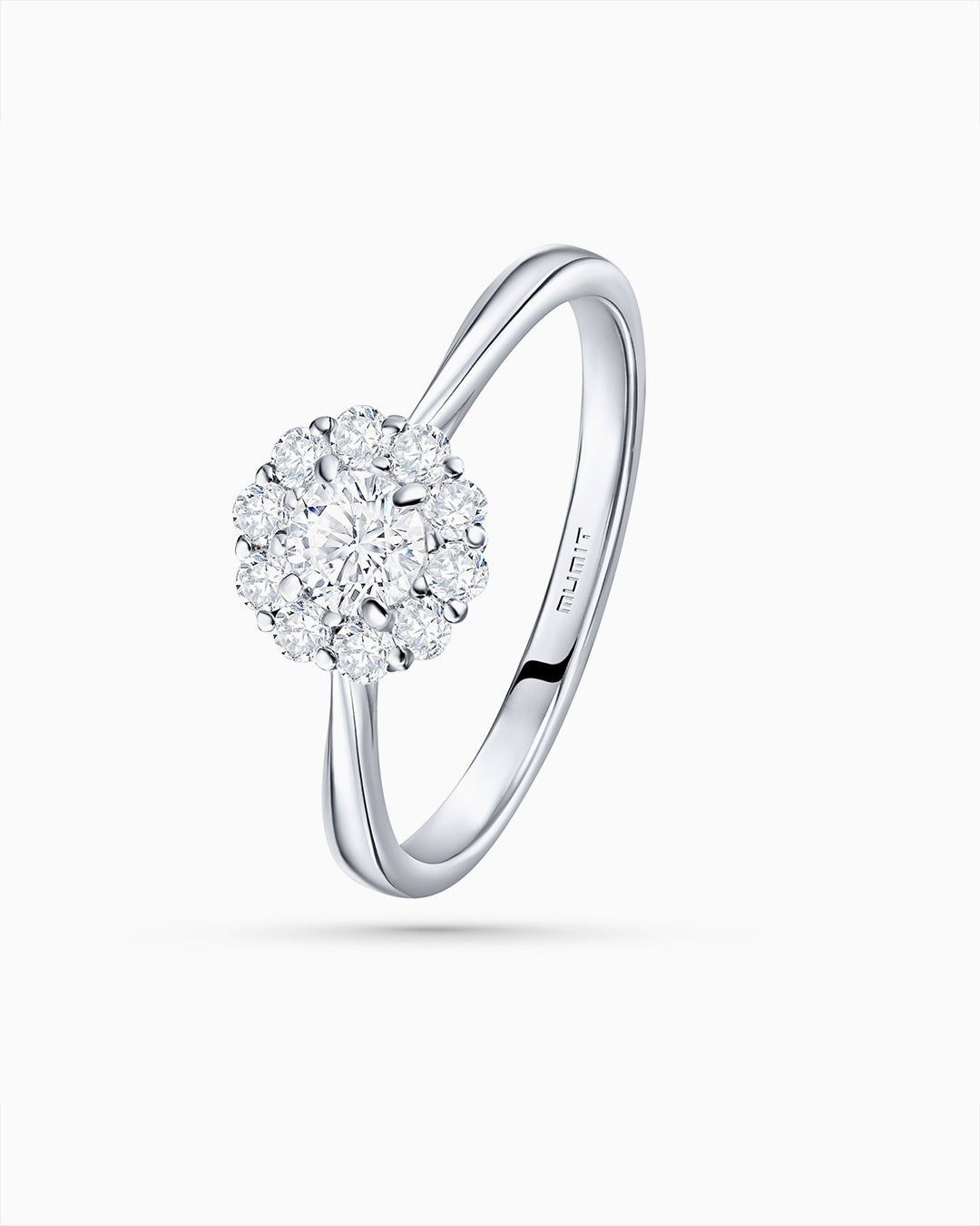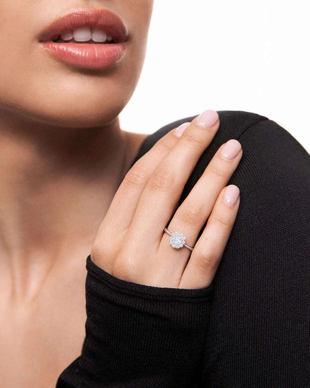 Solitario Rose de diamantes en oro blanco de 18 Kt. La sortija Rose es una joya diseñada para ensalzar la belleza y la luz de los diamantes que le dan vida. Su montura es una reinterpreptación del solitario tradicional, cuya innovación consiste en la suspensión de los diamantes en el aire produciendo un despliegue de brillo inigualable. En el centro de la pieza se encuentra un imponente diamante central de talla brillante de 0,30 quilates ensalzado a través de un halo de diamantes que evoca el florecimiento de una flor eterna. Una sortija diseñada para simbolizar un amor romántico y brillante, como el despliegue de luz que crea la montura al abrazar el dedo. El solitario de compromiso Rose está disponible en tres versiones adicionales de 0,35, 0,65 y 0,75 quilates.