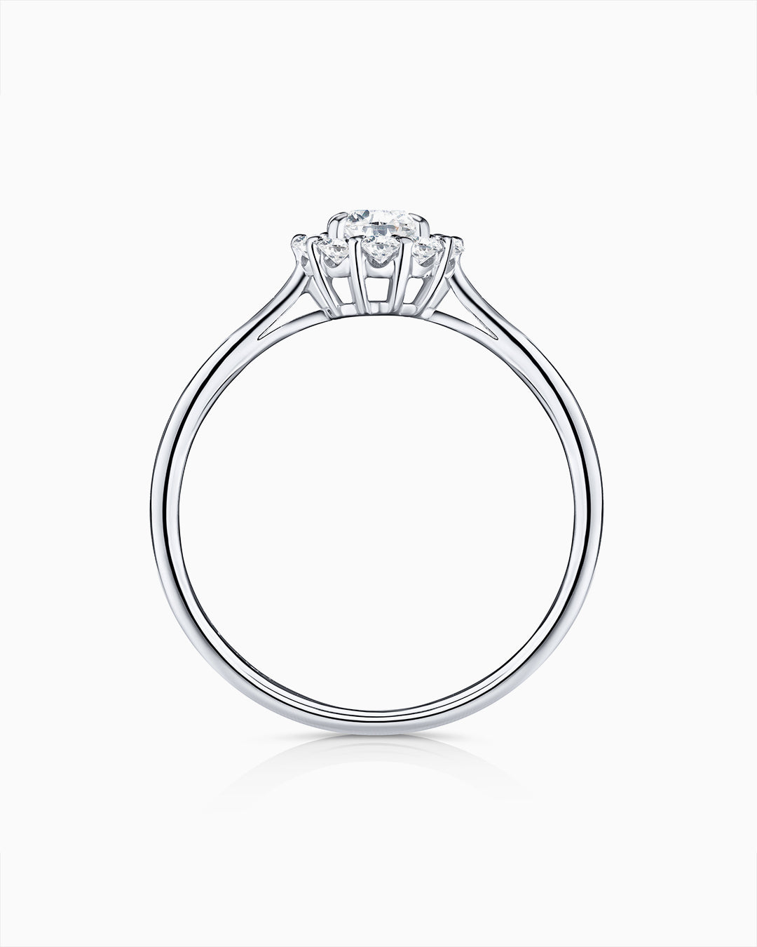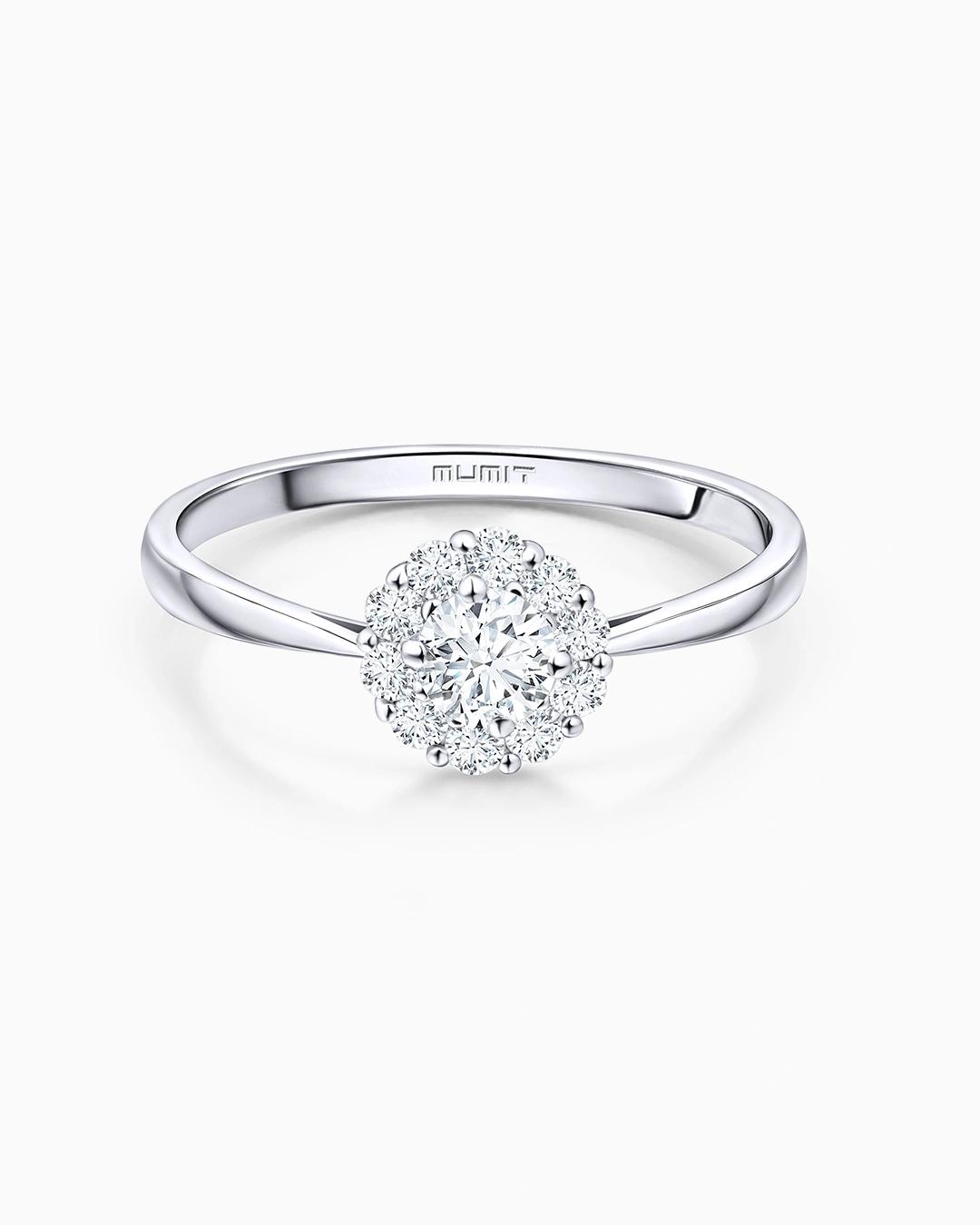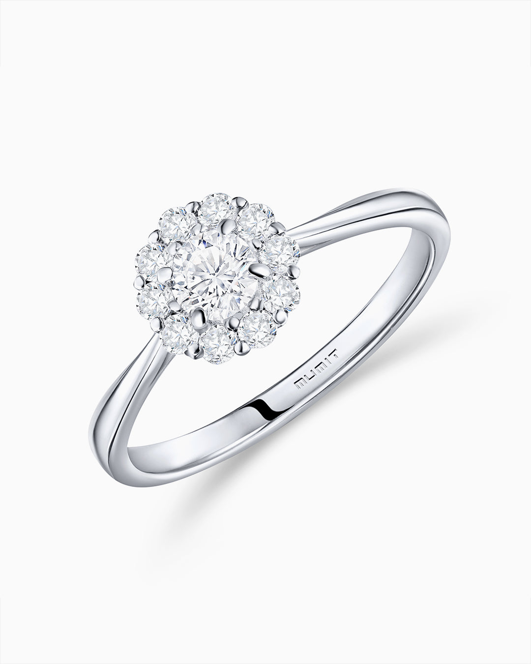 Solitario Rose de diamantes en oro blanco de 18 Kt. La sortija Rose es una joya diseñada para ensalzar la belleza y la luz de los diamantes que le dan vida. Su montura es una reinterpreptación del solitario tradicional, cuya innovación consiste en la suspensión de los diamantes en el aire produciendo un despliegue de brillo inigualable. En el centro de la pieza se encuentra un imponente diamante central de talla brillante de 0,30 quilates ensalzado a través de un halo de diamantes que evoca el florecimiento de una flor eterna. Una sortija diseñada para simbolizar un amor romántico y brillante, como el despliegue de luz que crea la montura al abrazar el dedo. El solitario de compromiso Rose está disponible en tres versiones adicionales de 0,35, 0,65 y 0,75 quilates.