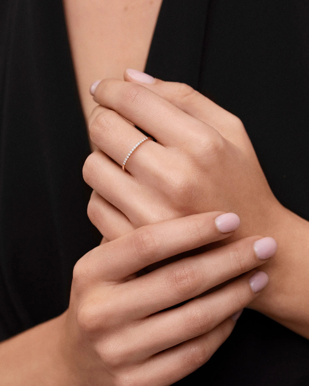 Alianza Alina de diamantes engastada en oro rosa de 18 Kt. Alina, brillante y hermosa como su nombre indica, es una alianza minimalista y versátil perfecta para el día a día. El elegante pavé de diamantes de corte brillante con un quilataje de 0,12 que la adorna refleja preciosos juegos de luz desde cualquier ángulo. Una joya que iluminará el rostro de una forma mágica con sus destellos eternos, convirtiéndose en una compañera para toda la vida. Gracias a sus líneas finas y depuradas, es perfecta tanto para combinar con otras sortijas de la colección como para deslumbrar por sí misma. Está diseñada en en oro blanco, rosa o amarillo para que cada mujer pueda encontrar la Alina que la representa. La alianza Alina está disponible en oro blanco y oro amarillo de 18 Kt y en dos versiones adicionales de oro blanco con 0,15 y 0,23 quilates.