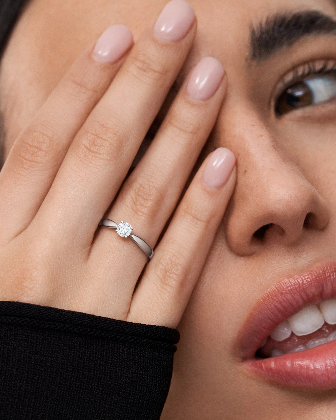 Solitario Claire de diamante central de 0,30 ct elaborado en oro blanco de 18 Kt. El diseño de esta exclusiva sortija destaca por un brazo que se va afinando proporcionalmente hacia la parte central con el objetivo de ensalzar la belleza del espectacular diamante de 0,30 quilates que lo corona. De líneas suaves y redondeadas, Claire representa la delicadeza y la ternura de todos los recuerdos más especiales de una historia de amor. Por otro lado, su ingeniosa estructura simboliza la fuerza de una promesa eterna gracias a la estabilidad de su base, convirtiéndola a su vez en una sortija cómoda para el día a día. Claire es el solitario con el que siempre has soñado adaptado a las necesidades de la estética contemporánea. El solitario Claire está disponible en cinco versiones adicionales de 0,15, 0,20, 0,25, 0,40 y 0,50 quilates.