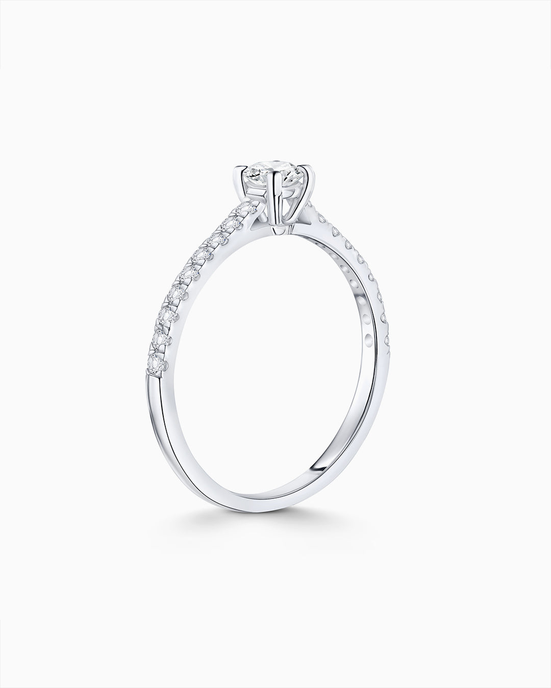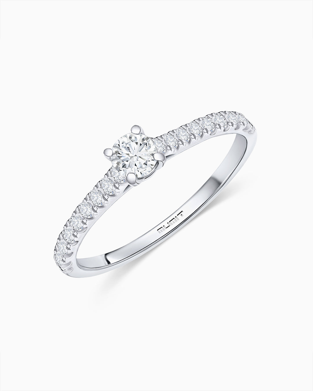 Solitario Odette de diamantes elaborado en oro blanco de 18 Kt. Inspirado en el impresionante juego de luces y sombras del famoso ballet El lago de los cisnes, el diseño de nuestro exclusivo solitario Odette busca ensalzar al máximo la luz que reflejan sus exquisitos diamantes. Sencillo y elegante, destaca por los deslumbrantes destellos del solitario central de 0,20 quilates, intensificados gracias al delicado pavé de diamantes que recorre su brazo generando un espectáculo de brillo inigualable. Esta poética joya es la elección más acertada para una declaración de amor que quedará grabada para siempre en nuestra mente, un símbolo duradero con el que dará comienzo una preciosa nueva etapa como pareja. Da el 'sí, quiero' más sofisticado de la mano de Mumit. El solitario Odette está disponible en una versión adicional de 0,50 quilates.