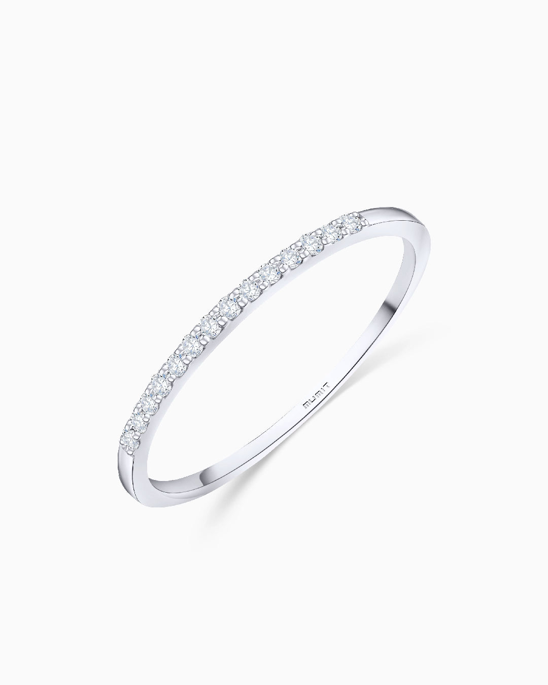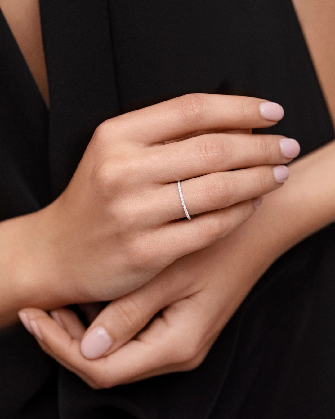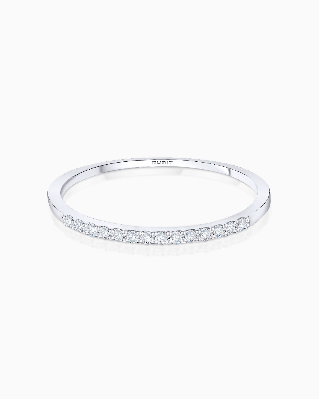 Alianza Alina de diamantes engastada en oro blanco de 18 Kt. Alina, brillante y hermosa como su nombre indica, es una alianza minimalista y versátil perfecta para el día a día. El elegante pavé de diamantes de corte brillante con un quilataje de 0,12 que la adorna refleja preciosos juegos de luz desde cualquier ángulo. Una joya que iluminará el rostro de una forma mágica con sus destellos eternos, convirtiéndose en una compañera para toda la vida. Gracias a sus líneas finas y depuradas, es perfecta tanto para combinar con otras sortijas de la colección como para deslumbrar por sí misma. Está diseñada en en oro blanco, rosa o amarillo para que cada mujer pueda encontrar la Alina que la representa. La alianza Alina está disponible en oro amarillo y oro rosa de 18 Kt y en dos versiones adicionales de oro blanco con 0,15 y 0,23 quilates.