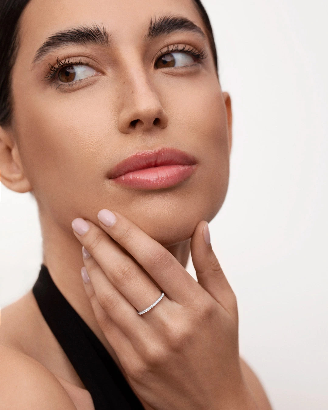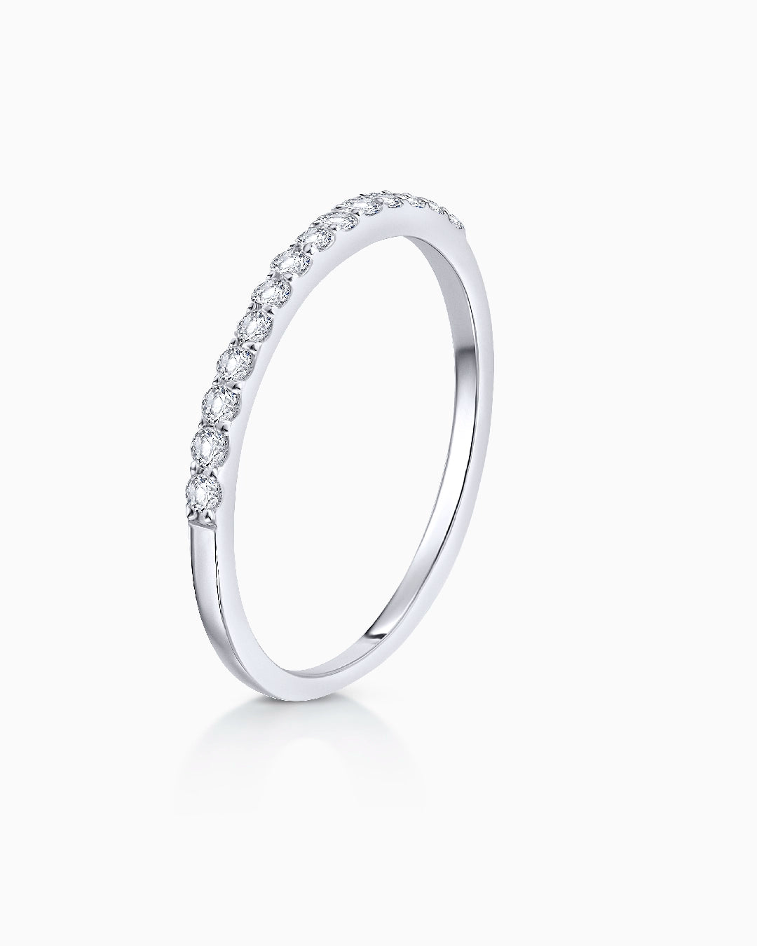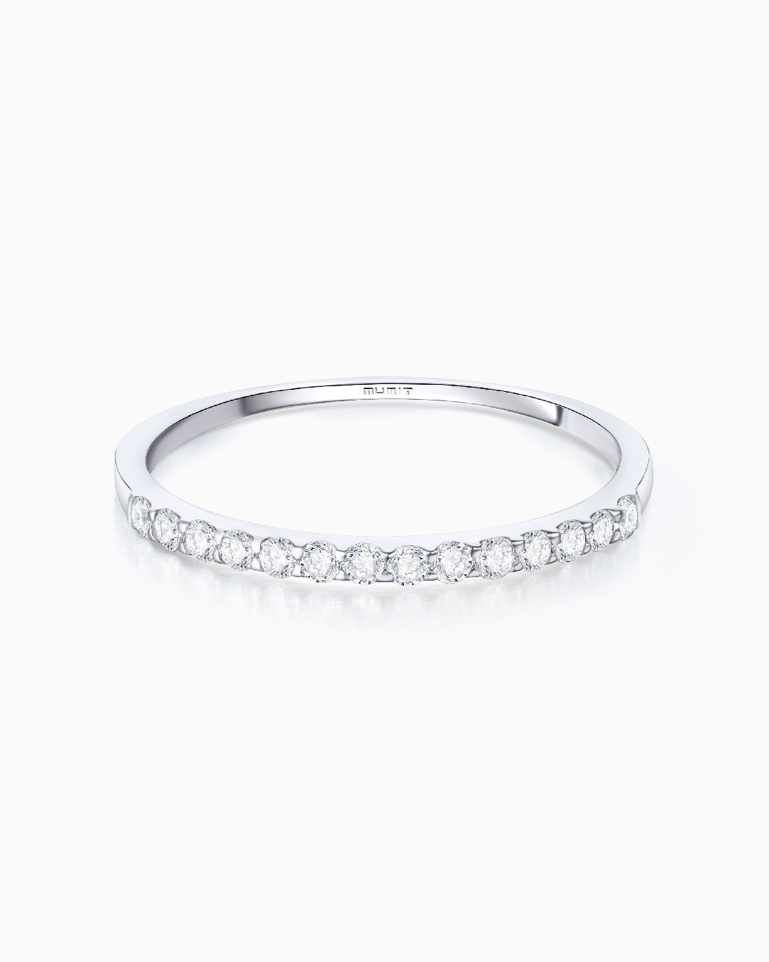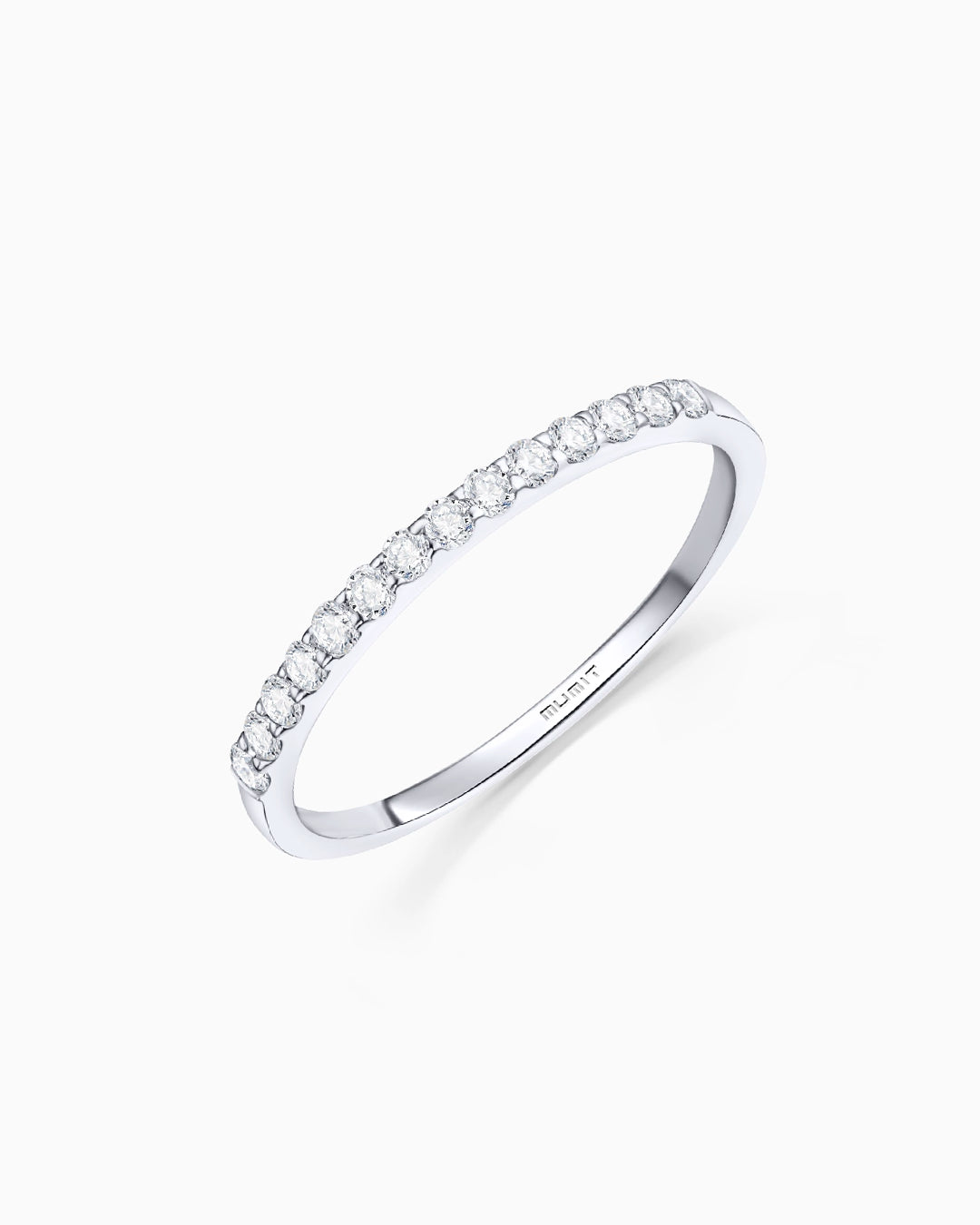 Alianza Alina de diamantes engastada en oro blanco de 18 Kt. Alina, brillante y hermosa como su nombre indica, es una alianza minimalista y versátil perfecta para el día a día. El elegante pavé de diamantes de corte brillante con un quilataje de 0,23 que la adorna refleja preciosos juegos de luz desde cualquier ángulo. Una joya que iluminará el rostro de una forma mágica con sus destellos eternos, convirtiéndose en una compañera para toda la vida. Gracias a sus líneas finas y depuradas, es perfecta tanto para combinar con otras sortijas de la colección como para deslumbrar por sí misma. Está diseñada en en oro blanco, rosa o amarillo para que cada mujer pueda encontrar la Alina que la representa. La alianza Alina está disponible en dos versiones adicionales con 0,12 y 0,15 quilates.