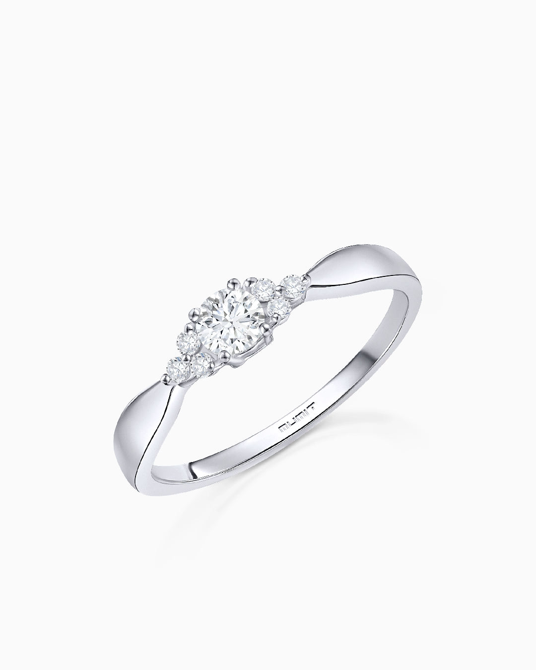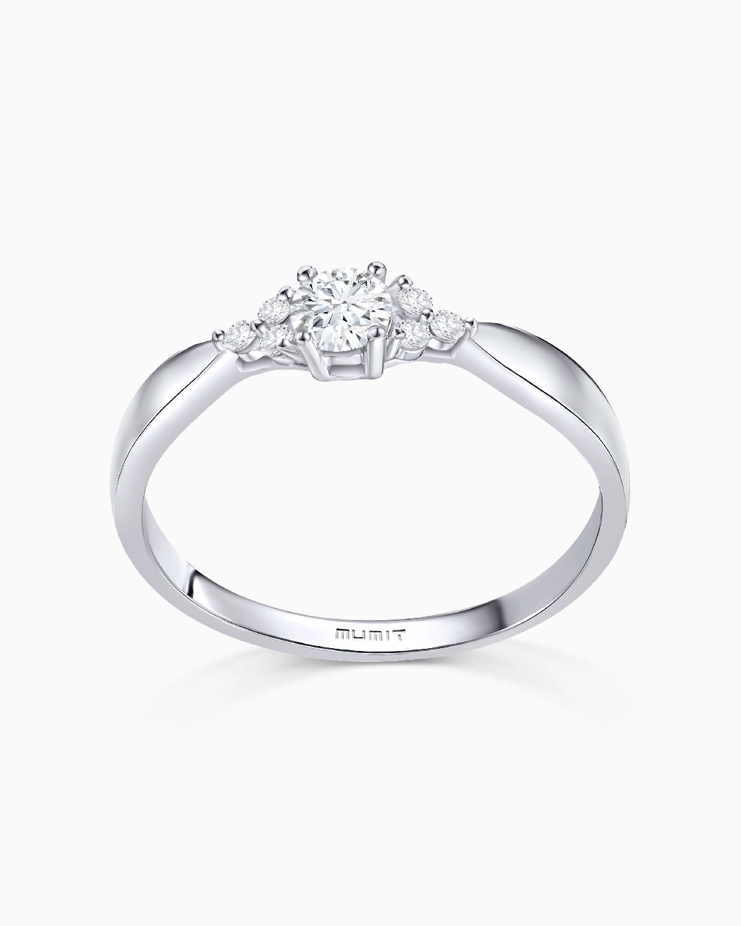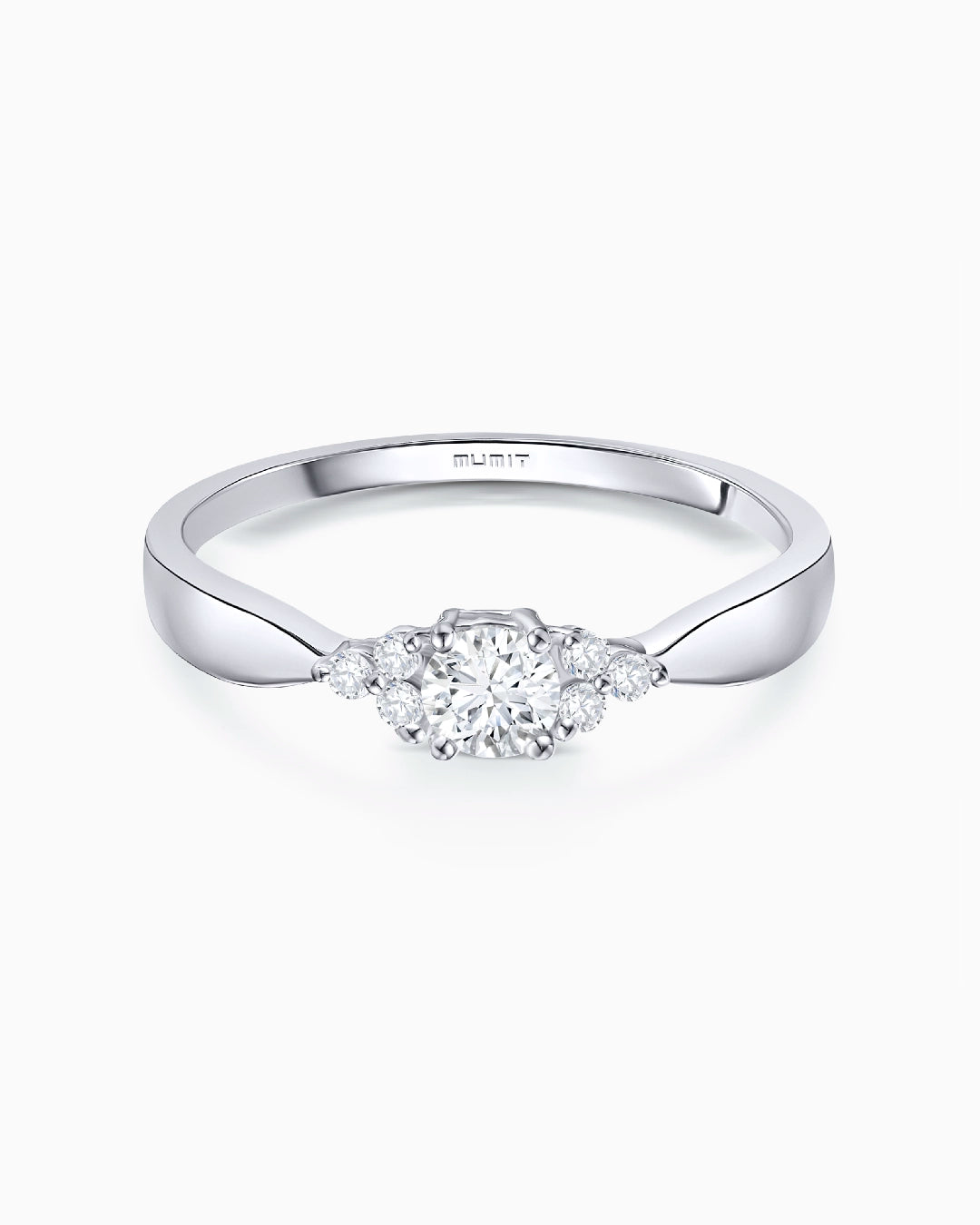 Sortija Lyra de diamantes elaborada en oro blanco de 18 Kt. Lyra, inspirada por la constelación que le da nombre y que ilumina el firmamento, es una exclusiva sortija que irradia una luz incontenible por donde va. Su sólida montura que sostiene un espectacular conjunto de diamantes se va estrechando hacia el centro de la sortija para ensalzarlos y, simultáneamente, generar las estilizadas proporciones que la distinguen. Esta reinterpretación del tresillo tradicional presenta tres diamantes adicionales a cada lado del solitario central de 0,20 quilates, originando una auténtica galaxia de destellos infinitos. Lyra es una sortija cautivadora con un diseño atemporal que no dejará indiferente a nadie.