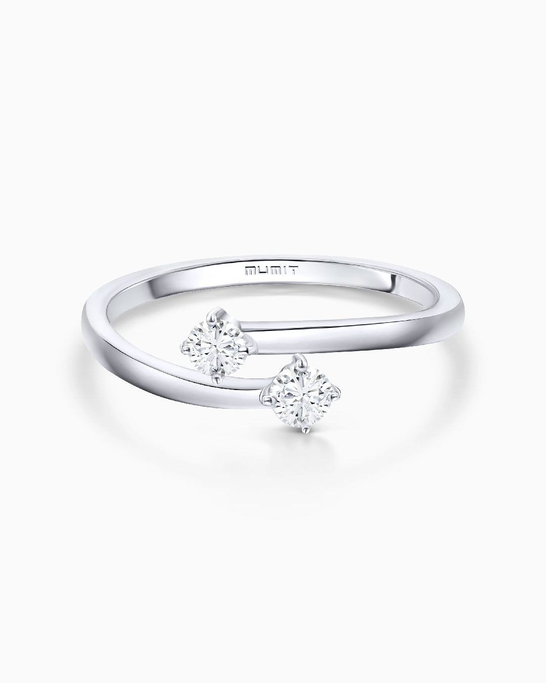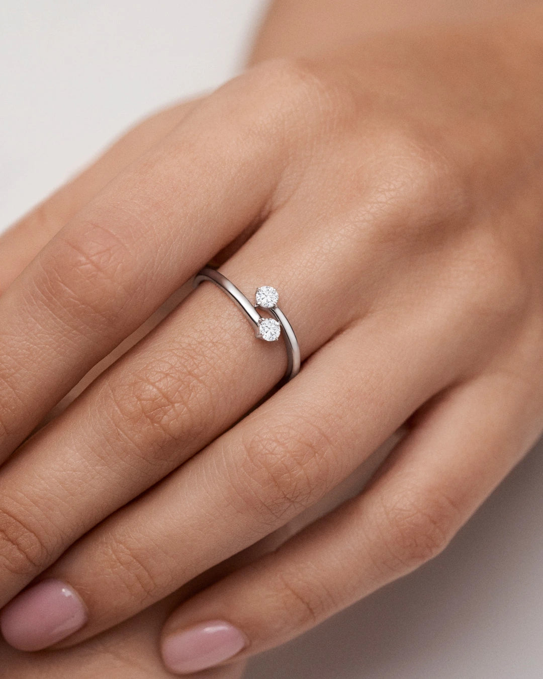 Sortija Paris & Helen de diamantes elaborada en oro blanco de 18 Kt. Esta sortija de espíritu vanguardista fue diseñada para simbolizar la naturaleza inseparable del amor verdadero, inspirada por una de las parejas de enamorados más conocida de la historia. Su estética depurada y minimalista es una reinterpretación del clásico anillo 'Tú y yo', reflejada en un juego de líneas oblicuas que se aproximan sin llegar a juntarse. De esta forma, sus espectaculares diamantes de talla brillante permanecen unidos a pesar de la distancia, sostenidos por una atracción tan magnética e irresistible como la romántica historia de amor del príncipe Paris y Helena de Troya que le da nombre. Una joya áltamente simbólica que resulta perfecta para el día a día gracias a un diseño equilibrado y una silueta depurada. La sortija Paris & Helen está disponible en dos versiones adicionales de 0,18 y 0,40 quilates.