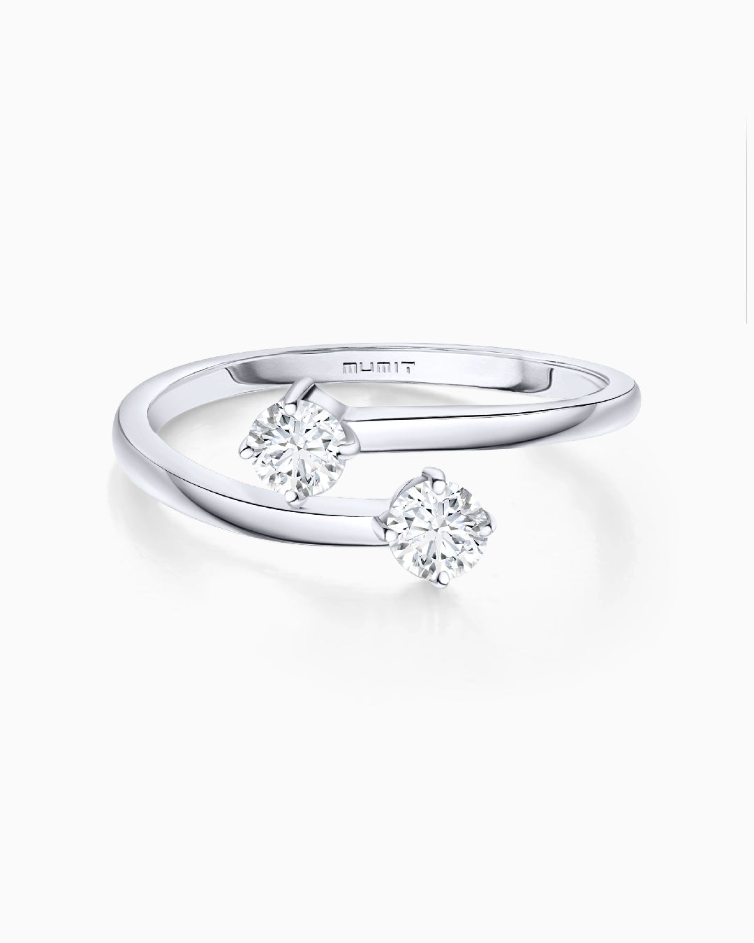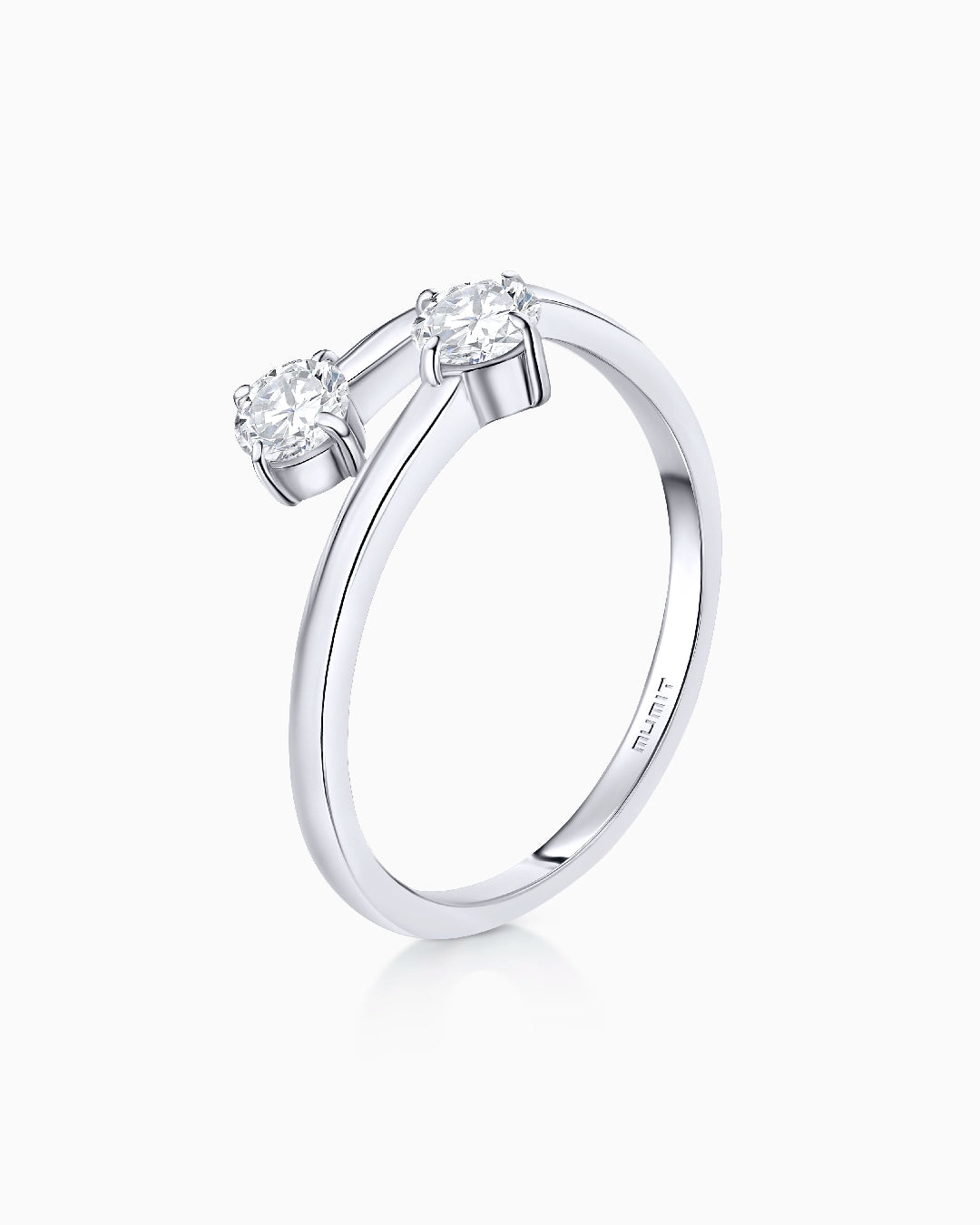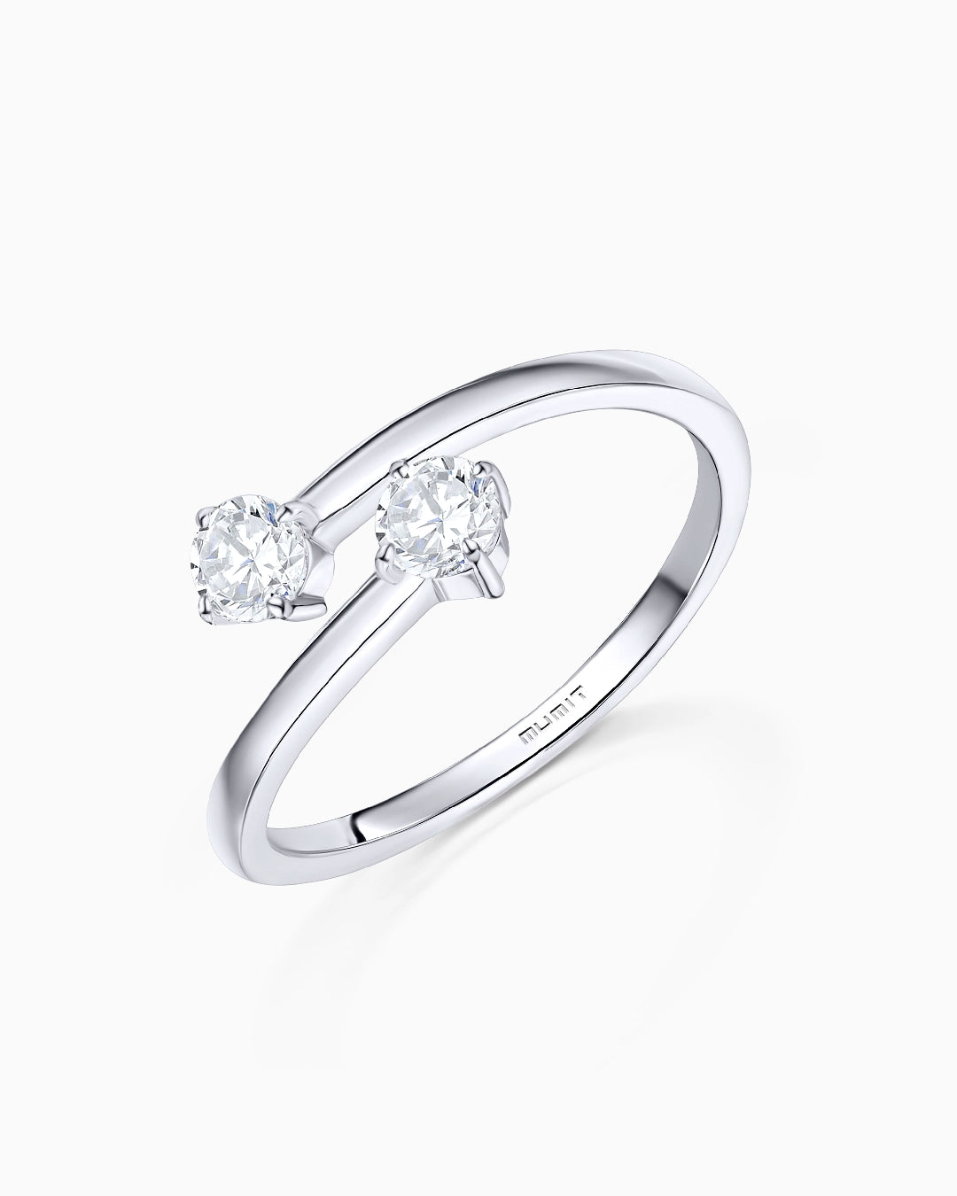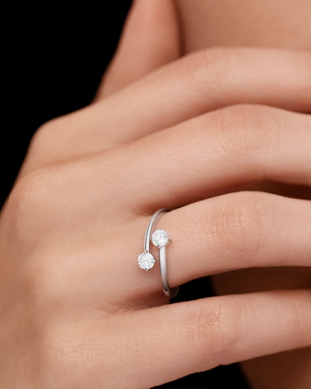 Sortija Paris & Helen de diamantes elaborada en oro blanco de 18 Kt. Esta sortija de espíritu vanguardista fue diseñada para simbolizar la naturaleza inseparable del amor verdadero, inspirada por una de las parejas de enamorados más conocida de la historia. Su estética depurada y minimalista es una reinterpretación del clásico anillo 'Tú y yo', reflejada en un juego de líneas oblicuas que se aproximan sin llegar a juntarse. De esta forma, sus espectaculares diamantes de talla brillante permanecen unidos a pesar de la distancia, sostenidos por una atracción tan magnética e irresistible como la romántica historia de amor del príncipe Paris y Helena de Troya que le da nombre. Una joya altamente simbólica que resulta perfecta para el día a día gracias a un diseño equilibrado y una silueta depurada. La sortija Paris & Helen está disponible en dos versiones adicionales de 0,18 y 0,25 quilates.