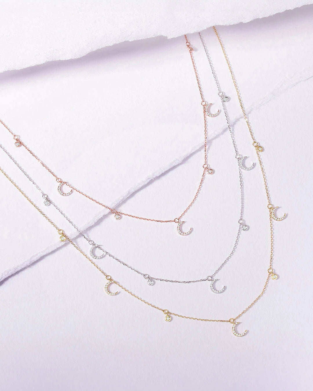 Gargantilla Moon Diamonds en oro amarillo de 18 Kt y diamantes. Siente como la absoluta protagonista de la noche reluce más resplandeciente que nunca en tu cuello. La Gargantilla Moon Diamonds incorpora tres delicadas y relucientes lunas de diamantes (quilataje total de 0,15 Cts.) que se reflejan la luz con cada movimiento. Elaborada en oro amarillo de 18 Kt, y también disponible en oro blanco y rosa, esta encantadora gargantilla, te enamorará por su extrema delicadeza y elegancia. Deja que se convierta en una de tus joyas favoritas.