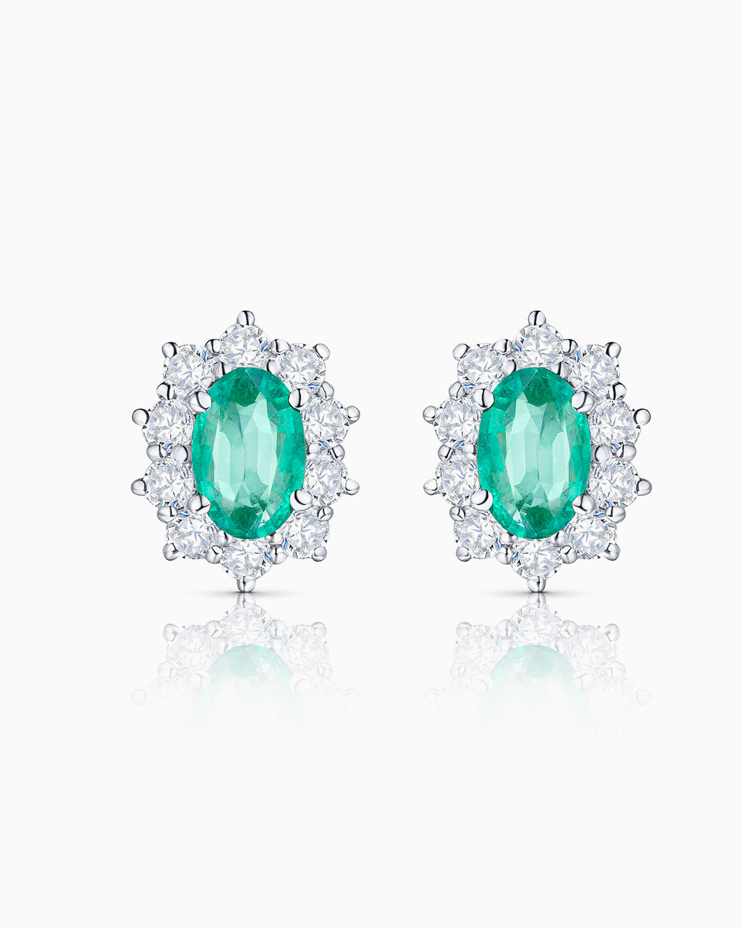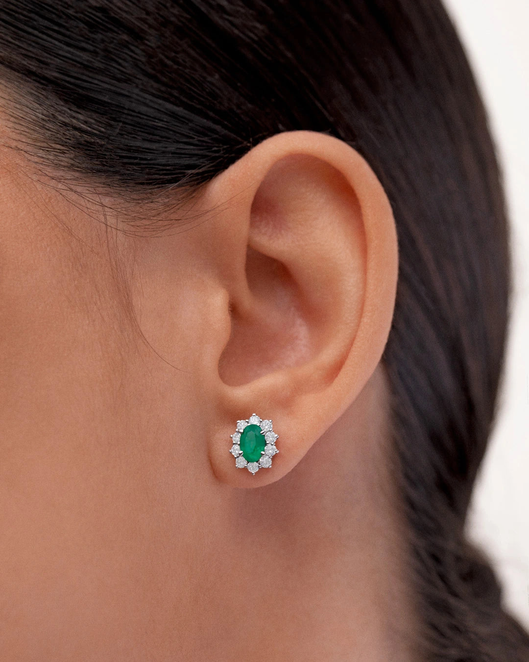 Pendientes Irem de esmeraldas ovales centrales y orla de diamantes sobre montura de oro blanco de 18 Kt. Irem, inspirada en la esencia de un jardín celestial. Los tesoros naurales y los frutos de la creatividad humana se encuentran en la pureza de la composición de la colección Irem. Una colección a través de la cual el universo Mumit se convierte en un paisaje lleno de color y destellos. Los pendientes Irem representa un jardín de esmeraldas, su gema central, una magnífica esmeralda de 0,55 quilates en talla oval contrasta con la delicada orla de diamantes. Cada uno de los diamantes que dan forma a este sublime diseño han sido minuciosamente escogidos por su brillo, color y pureza dando lugar a una pieza de alta joyería. Unos singulares pendientes con un toque de elegancia sin igual, ideal para día como para noche.Los pendientes Irem están disponibles en una versión adicional con zafiro central.