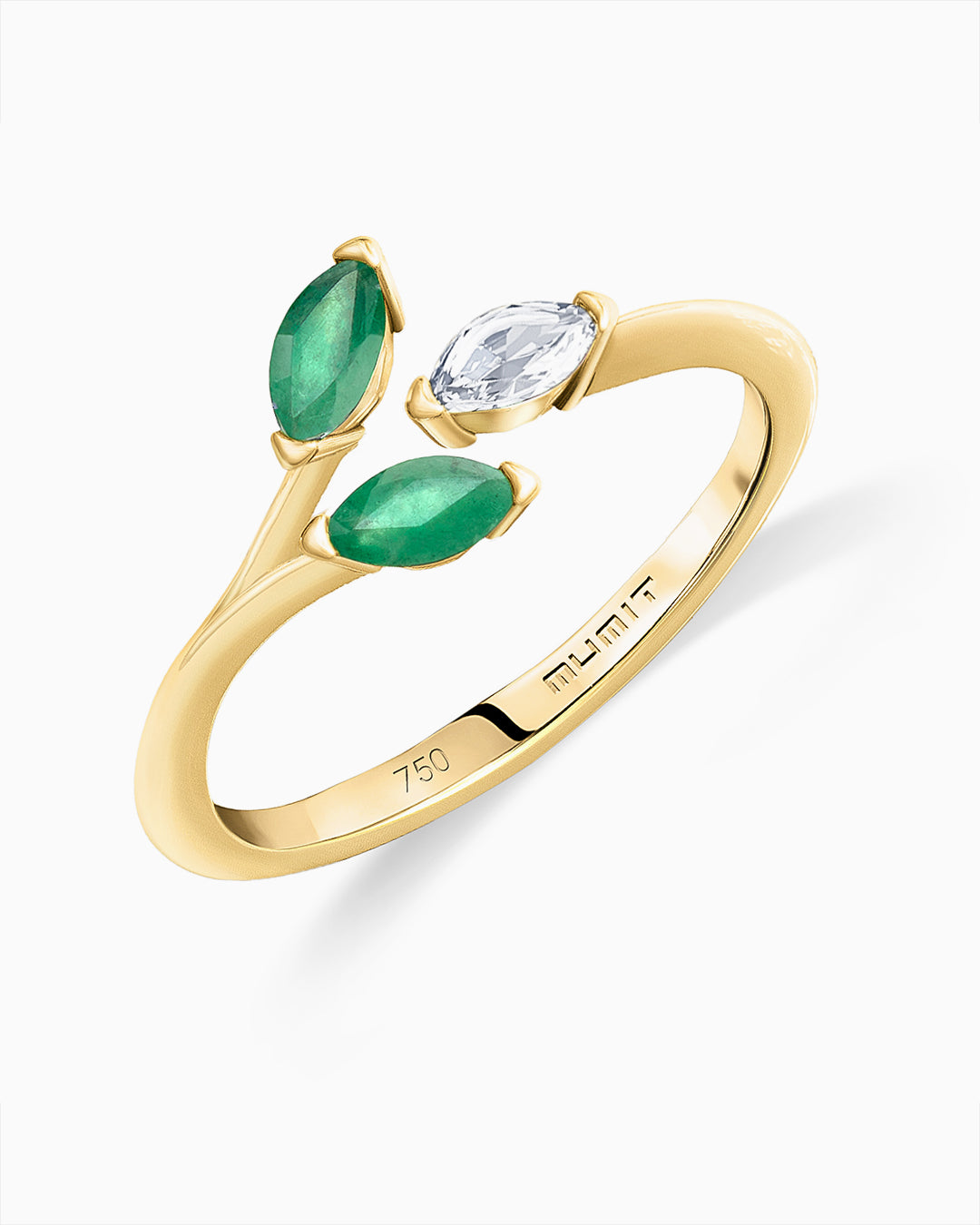 Sortija Filipa de esmeraldas y diamantes en talla marquesa engastados en oro amarillo de 18 Kt. La sortija Filipa se trata de un original y único diseño creado por el equipo de diseño de Mumit en colaboración con la influencer Lucía Bárcena. Esta delicada sortija encierra un momento único simbolizando el nacimiento de su primera hija Filipa, cada uno de sus detalles es totalmente simbólico. Su diseño, caracterizado por dos esmeraldas en talla marquesa de elevada pureza, representan los dos padres que abrazan y protegen al bebé representado a través del diamante central de talla marquesa. Una pieza de alta joyería diseñada para simbolizar el momento más importante, un sentimiento engastado en oro amarillo de 18 Kt.