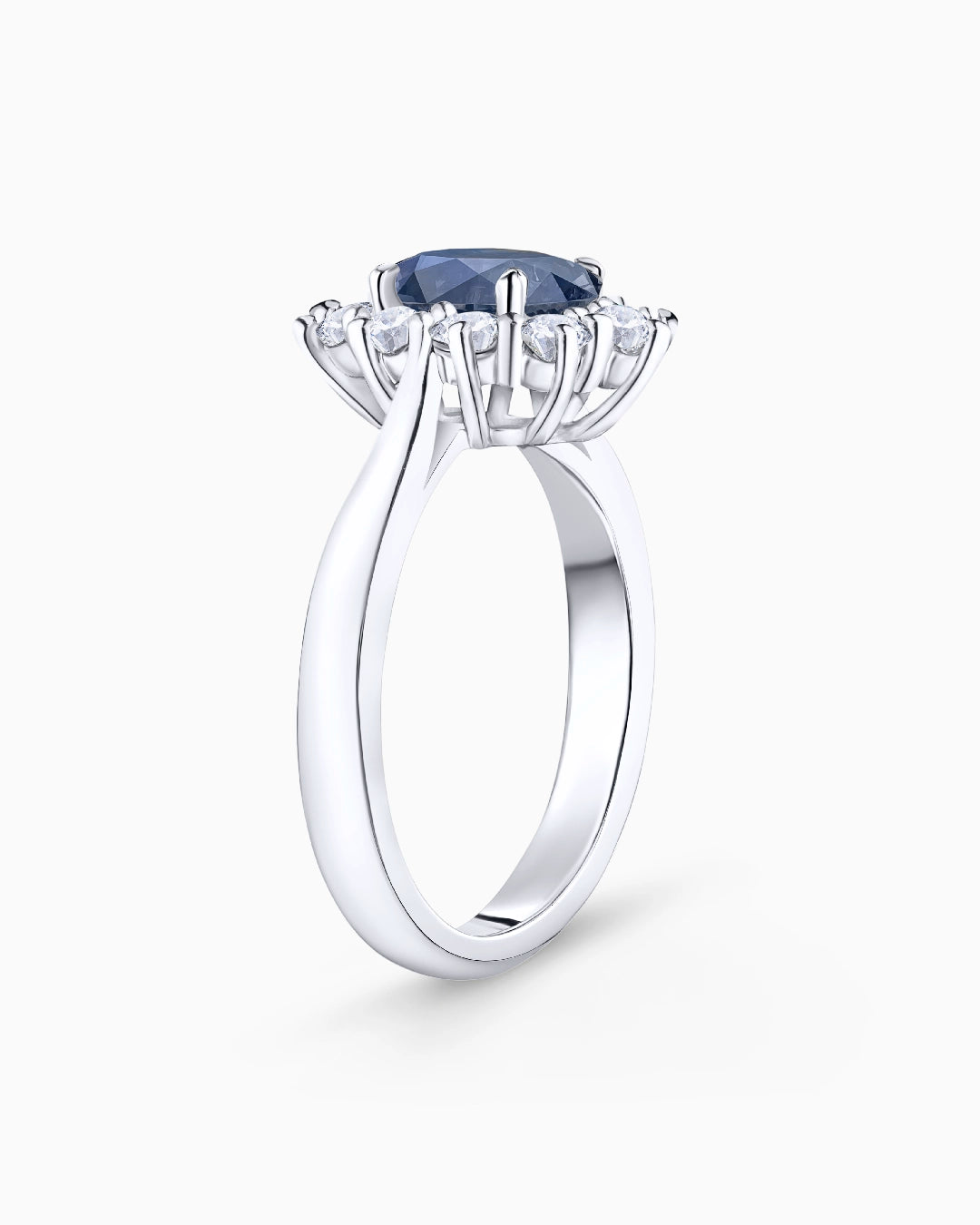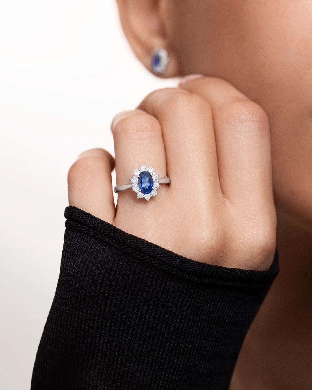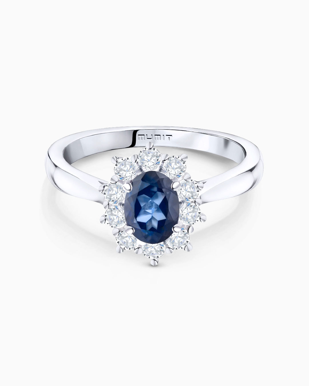 Sortija Irem de zafiro oval central y orla de diamantes sobre montura de oro blanco de 18 Kt. Ire...