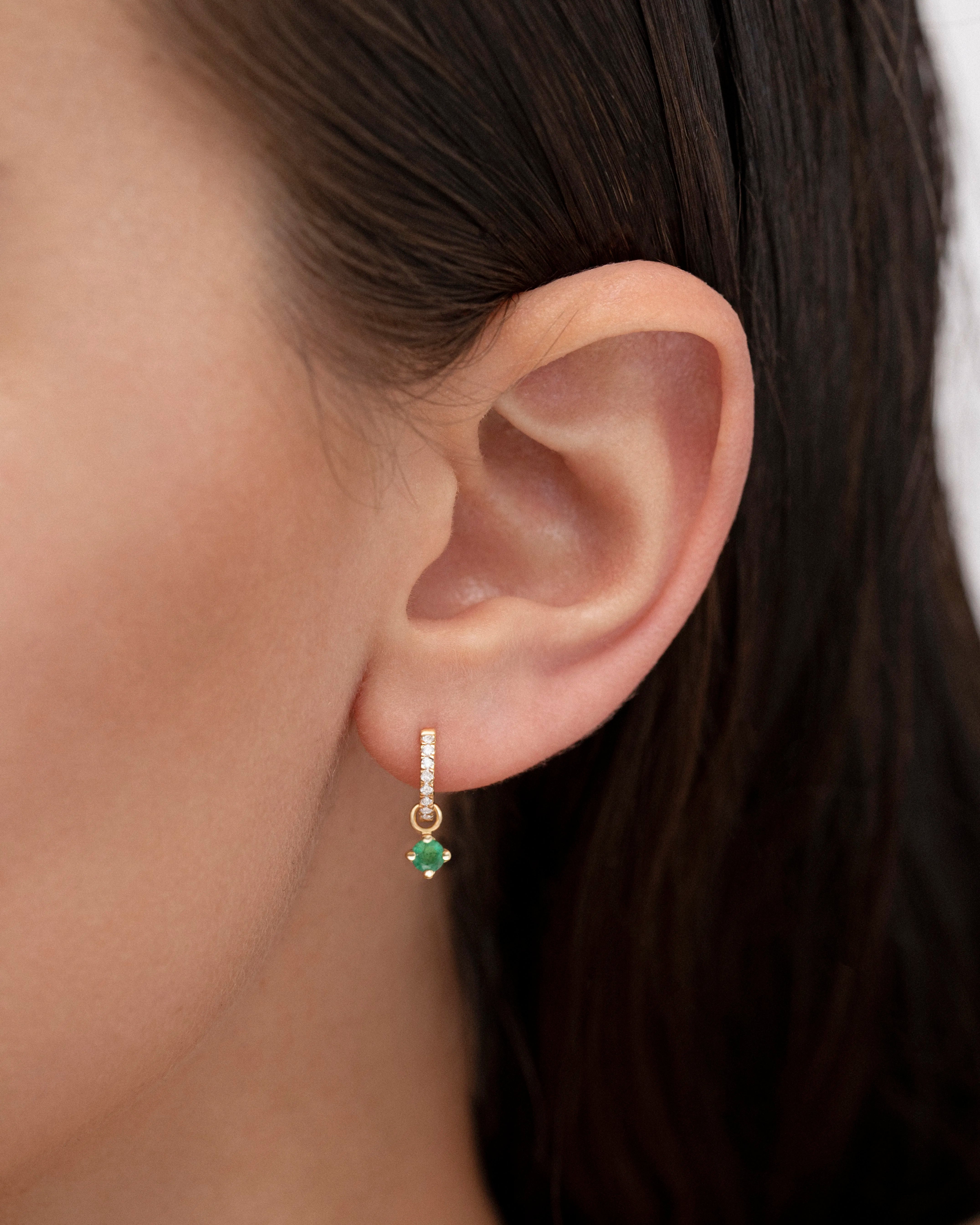 Charm para pendiente de aro Eternity Colors Circle de esmeralda engastado en oro amarillo de 18 Kt. Una preciosa esmeralda en talla brillante se convierte en el centro de esta delicada y original joya de oro perteneciente a la colección Eternity Colors. El arrebatador verde de la esmeralda te hará perderte en la belleza de este espectacular complemento para tu look. Al igual que los demás Charms by Mumit, combina con los pendientes Petite Diamonds Aro, Pendientes Eternity Colors Aro y Piercings Aro Punk.