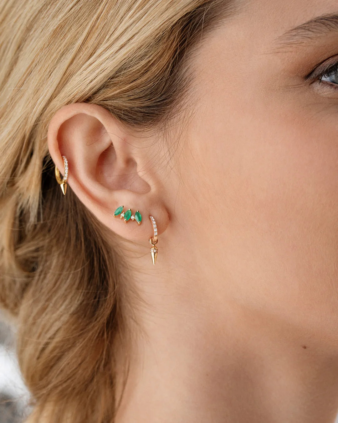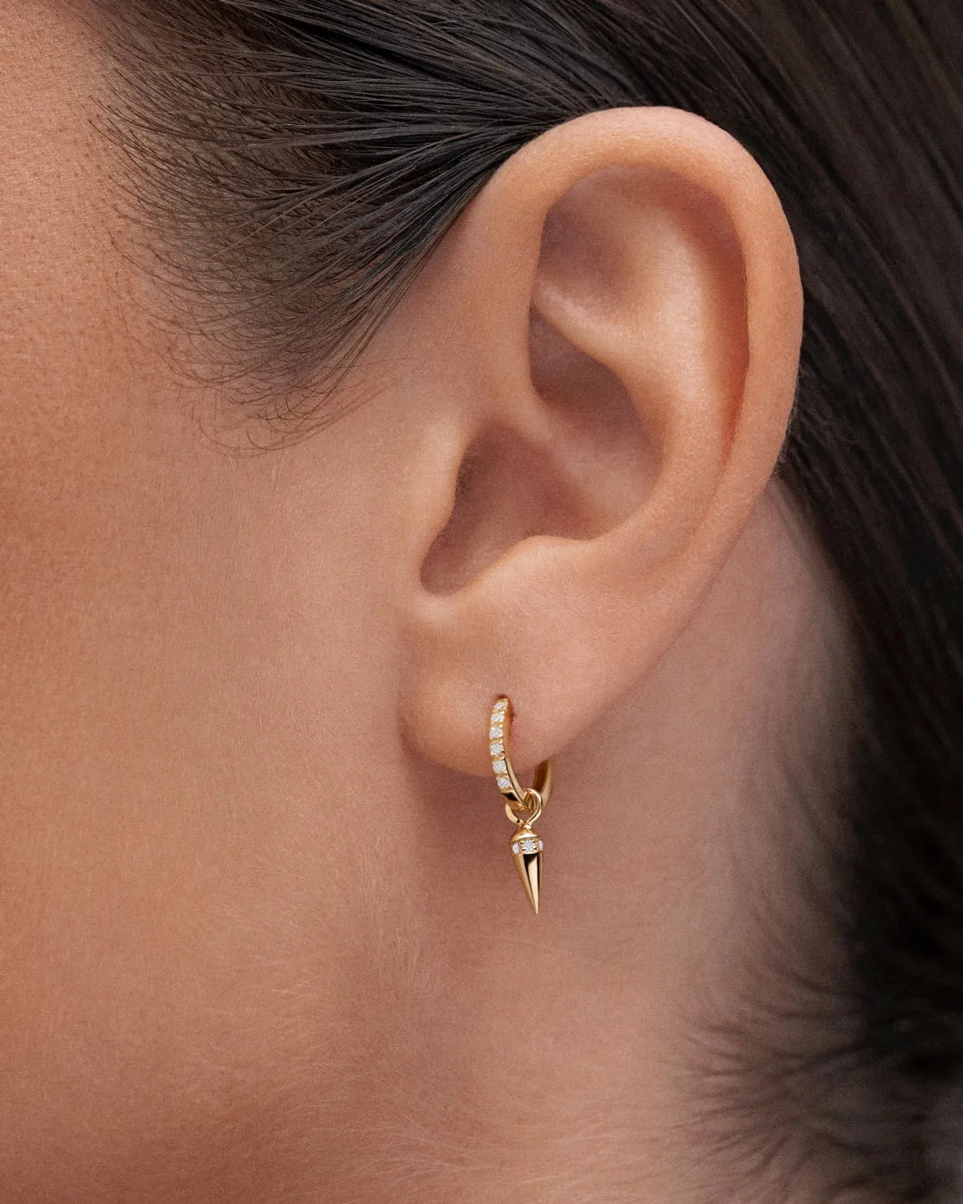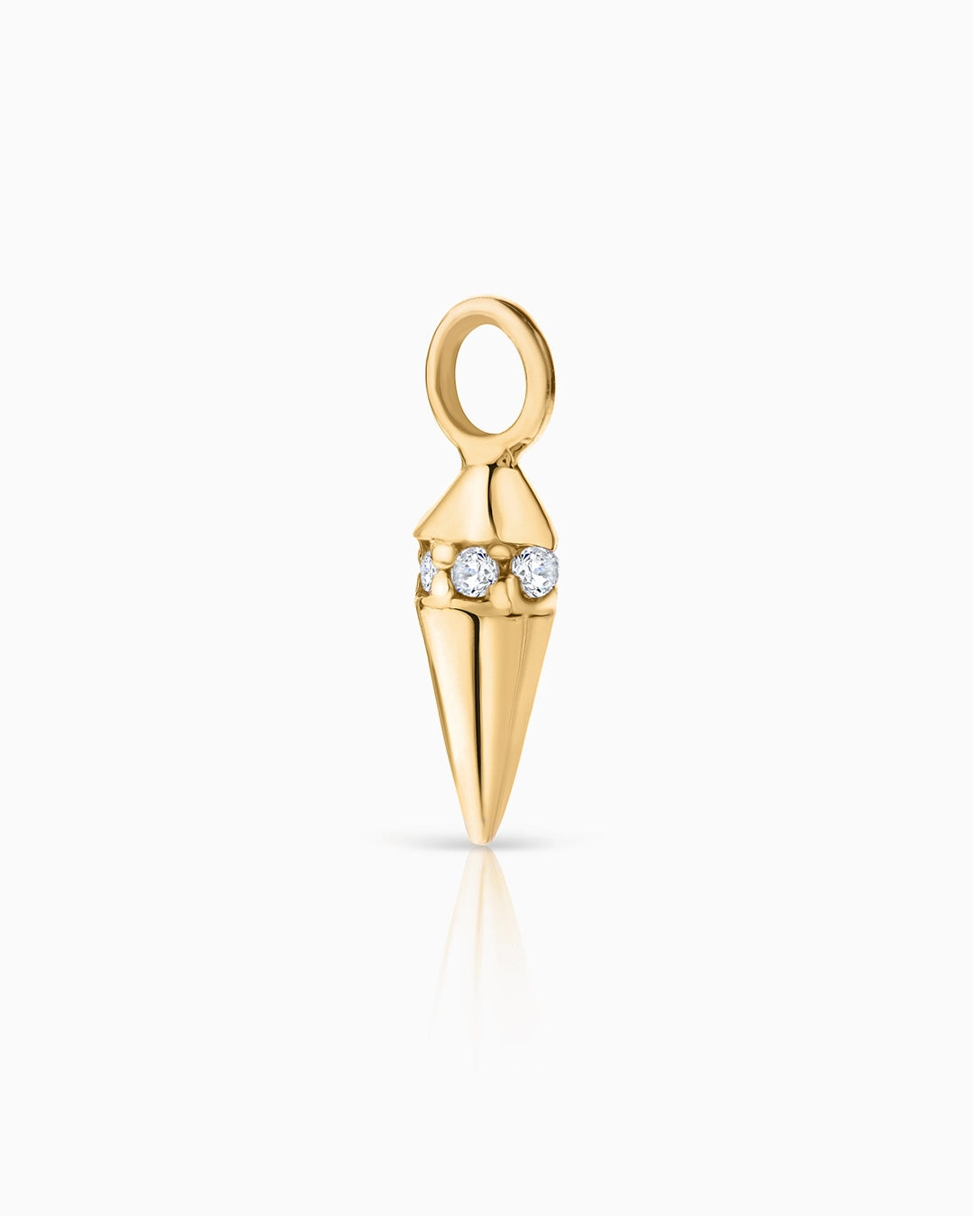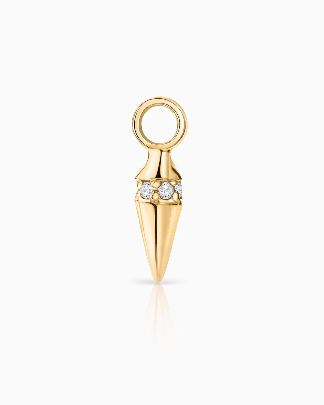 Charm para pendiente de aro Punk de diamantes elaborado en oro amarillo de 18 Kt. Su forma ligeramente afilada le aportará el toque 'punk' que quieres para tu oreja si buscas una joya original y atrevida. Los diamantes en talla brillante que incorpora, logran junto a su diseño único una fusión entre elegancia y modernidad que te enamorará. También disponible en oro rosa y blanco, combina a la perfección con los pendientes Petite Diamonds Aro, Pendientes Eternity Colors Aro y Piercings Aro Punk.