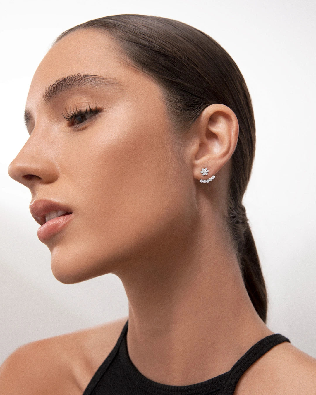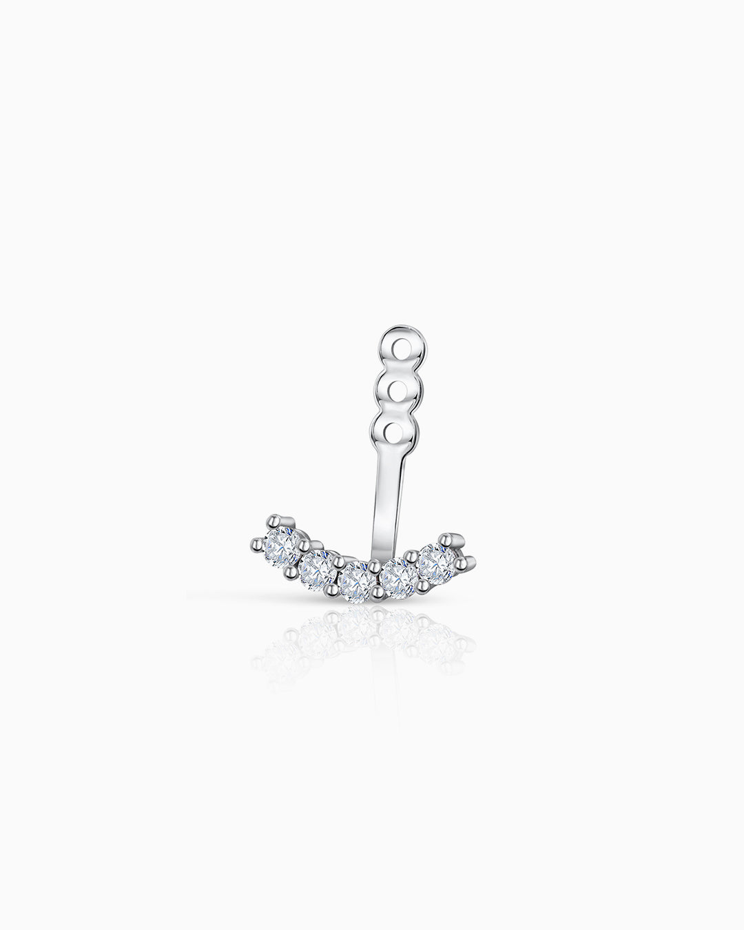 Ear Jacket Sunrise de diamantes engastados en oro blanco de 18 Kt. Original y contemporáneo, una joya diseñada para ensalzar la belleza del lóbulo aportando un toque de luz sin igual. Su diseño evoca los primeros rayos del amanecer, cuenta con cinco diamantes que recorren la forma del lóbulo para crear ese efecto de luz tan buscado. Este ear jacket es perfecto para combinar con cualquier pendiente de la colección, cuenta con tres posiciones ofreciendo infinidad de posibilidades de ajuste. Ideal para llevarse tanto en lóbulo como en cartílago gracias a su perfecto tamaño y ajuste. Este ear jacket se vende en unidades individuales y sin pendiente, ofreciendo la posibilidad de combinación con cualquier otra pieza.