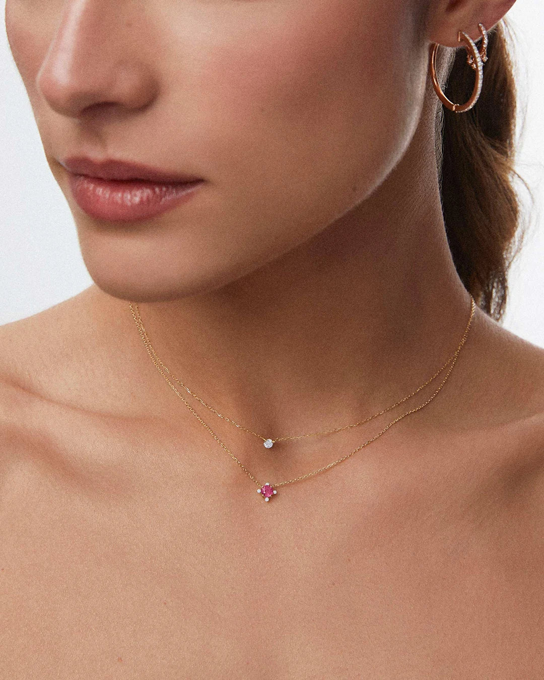 Gargantilla Crown de rubí en oro amarillo de 18 Kt. Un diseño con una exquisita interpretación minimalista de las imponentes gemas que daban vida a las joyas de La Corona. Una joya llena de color y brillo, la perfecta fusión entre elegancia y modernidad cuyo protagonista es su gema central custodiada por cuatro diamantes en talla brillante. Crown, una colección cargada de elegancia moderna que representa pasado y presente a través de su brillo.La gargantilla Crown está disponible en oro amarillo de 18 Kt y en varias versiones, con gema central en talla marquesao brillante y con rubí, esmeralda o zafiro.