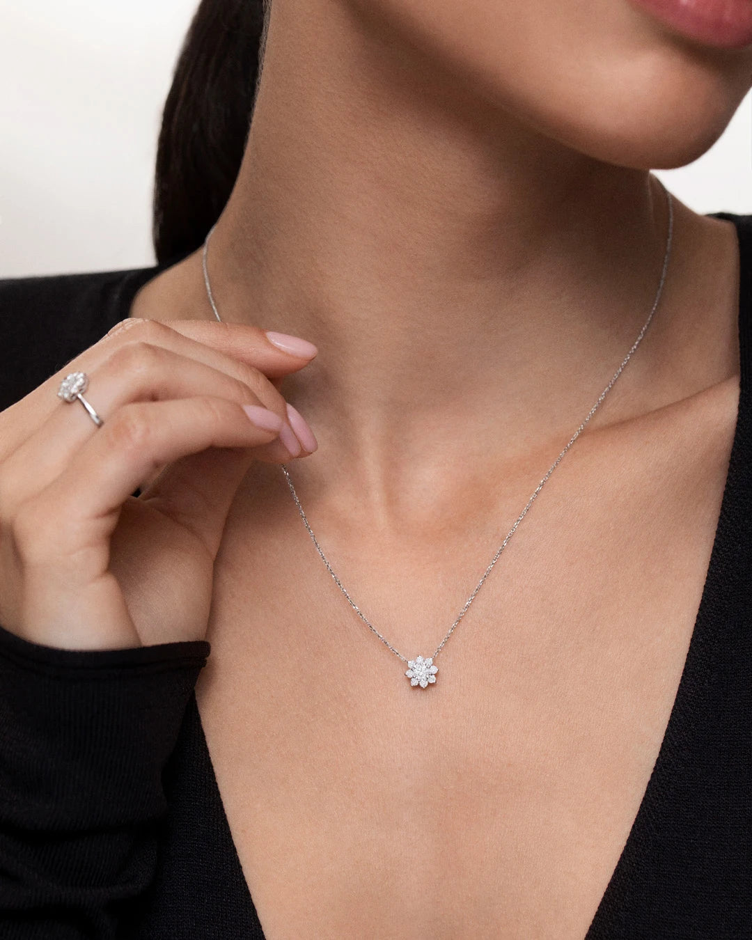 Gargantilla Rosette Solitaire con diamante central montado en oro blanco de 18 Kt. La gargantilla Rosette Solitaire protagoniza nuestra colección más especial. Las delicadas gotas de agua, el reflejo de la luz del amanecer en un jardín de rosas. El brillo de la mañana y las sensibles formas de los pétalos de rosa dotan de personalidad a una colección que celebra la belleza de la naturaleza. Una gargantilla tan original como elegante, formada por una maravillosa roseta central que evoca la forma de los pétalos de rosa abranzando un delicado diamante de talla brillante de un quilataje total de 0,20 quilates. Una pieza de alta joyería a través de la cual los brillantes aportan un giro único haciendo de ésta, una pieza ideal para cualquier ocasión. Perfecta para combinar con las demás piezas de la colección Rosette. La gargantilla Rosette está disponible en tres versiones adicionales de 0,07, 0,15 y 0,34 quilates.