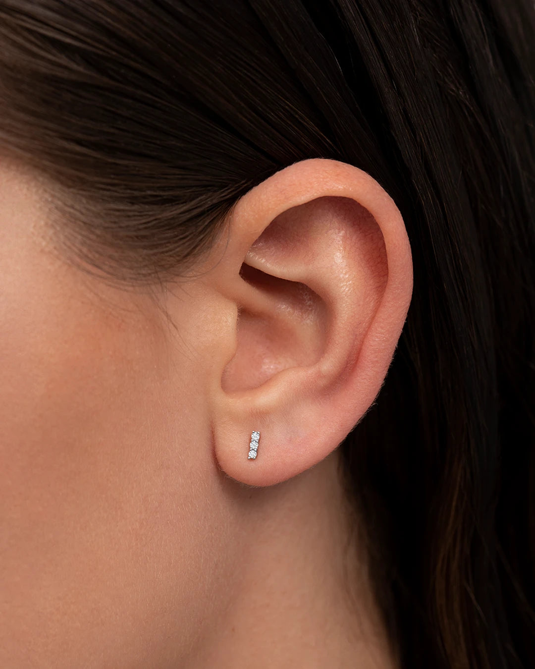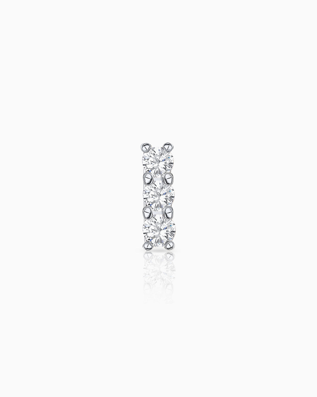 Pendiente Piercing Line Diamonds elaborado en oro blanco de 18 Kt. Un original pendiente tipo piercing diseñado para elevar cualquier ear look con un toque de elegancia y de luz. Siguiendo las líneas depuradas de la colección Line, una delicada barrita de tres diamantes en talla brillante crean la forma de este pendiente. Un sutil destello de elegancia diseñado desde el punto de vista de la versatilidad, perfecto para adaptarse a cualquier localización de la oreja. Si lo deseas, puedes pedirlo con un cierre especial de rosca para piercing en el menú desplegable superior (este extra tiene un coste adicional de 6€).El pendiente piercing Line Diamonds está disponible en tres versiones, oro amarillo, blanco y rosa de 18 Kt. ¡Únete a la tendencia de moda y crea tu ear look con Mumit!.