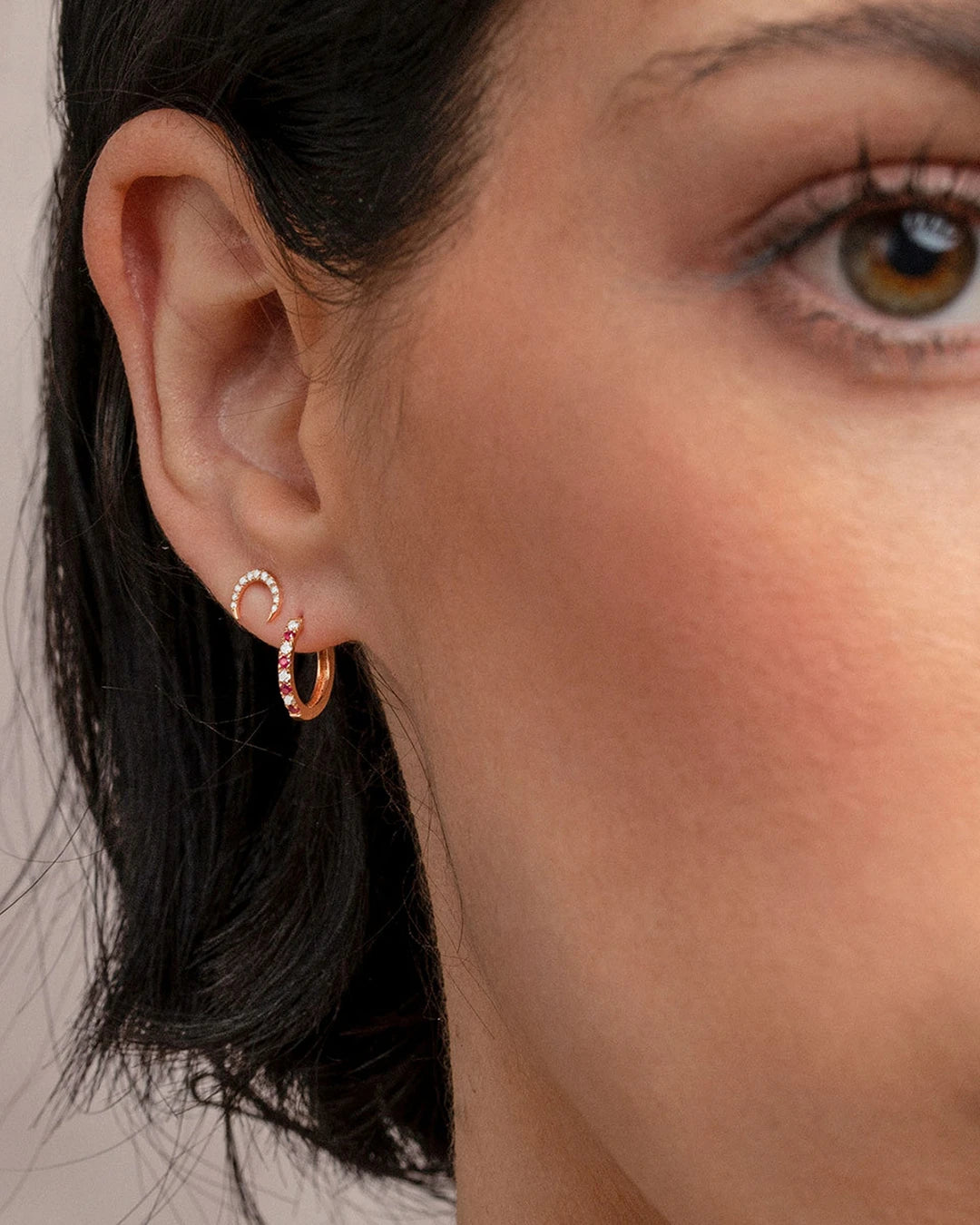 Pendiente Piercing Luna Moon Diamonds elaborado en oro rosa de 18 Kt. Un delicado pendiente tipo piercing diseñado para elevar cualquier ear look y hacerlo tuyo. En estos pendientes, los diamantes son minuciosamente montados en forma de media luna en estado menguante evocando las distintas formas celestes que forman esta mágica colección. Cuentan con el tamaño perfecto para convertirse en un básico de tu día a día, adaptándose a la perfección al agujero en que prefieras llevarlos. Si lo deseas, puedes pedirlo con un cierre especial de rosca para hélix o cartílago, puedes pedirlo en el menú (este extra tiene un coste adicional de 6€). ¡Únete a la tendencia de moda y revoluciona tu ear look con Mumit!