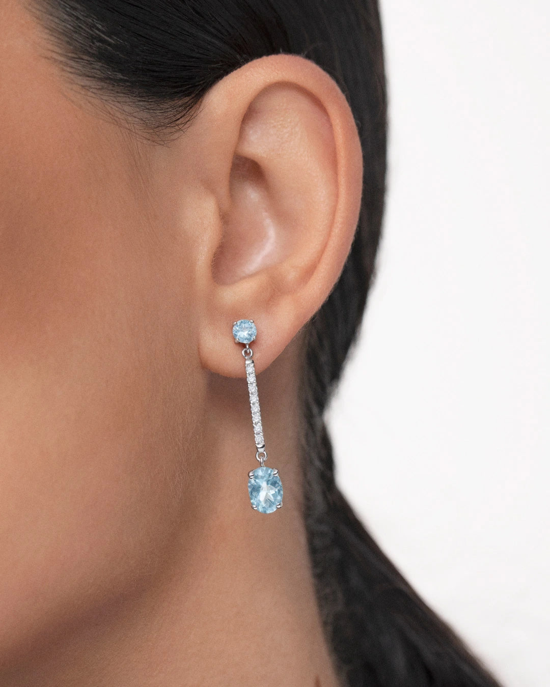 Excepcionales pendientes Aqua de aguamarinas y diamantes engastados en oro blanco de 18 Kt. Una joya inspirada en los destellos del agua del mar que, a través de su diseño, juega con los contrastes de los diamantes y las aguamarinas. Dos aguamarinas naturales en talla brillante y oval se unen en una delicada barra de diamantes montados en pavé, creando un movimiento capaz de eclipsar cualquier mirada. Su cierre de presión les aporta seguridad y confort, haciendo de este pendiente una joya ideal para cualquier ocasión. Unos pendientes que son todo destellos, el 'algo azul' que te acompañará toda la vida.