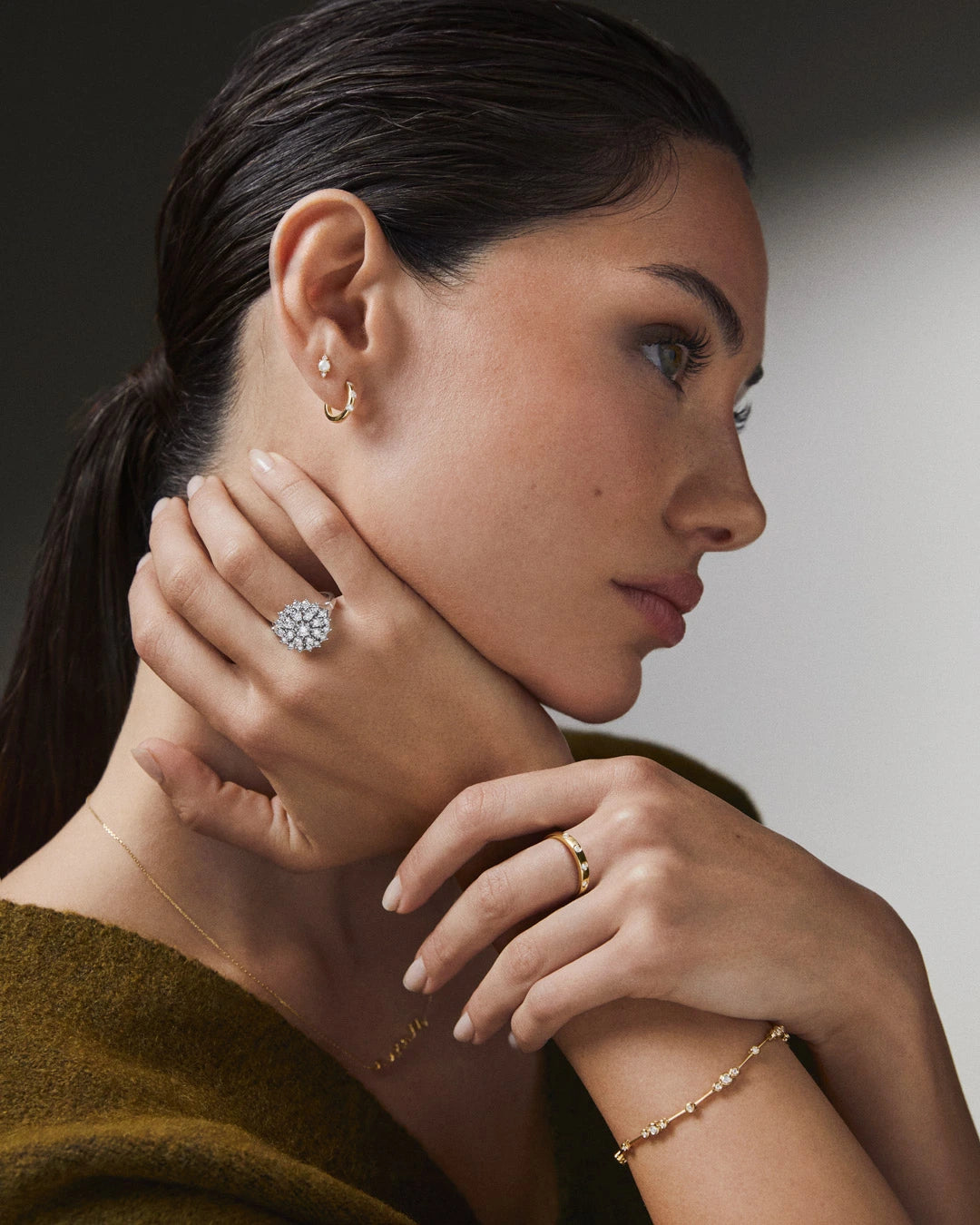 El cinturón de Orión es uno de los puntos más reconocibles del firmamento, una alineación de tres estrellas que ha guiado a navegadores y visionarios durante siglos. Los pendientes Orion se inspiran en la simetría y el simbolismo de esta conocida constelación, capturando su esplendor por medio de tres diamantes naturales que han sido cuidadosamente seleccionados por su pureza y brillo. Gracias a una versión especial del engaste a nivel que expone la parte superior de la piedra, la luz atraviesa los diamantes desde múltiples ángulos, potenciando su resplandor natural y logrando un efecto óptico que realza su tamaño. La ausencia de garras de esta innovadora montura resulta en un acabado depurado y minimalista, perfecto para elevar cualquier estilismo con su esencia fresca y sofisticada. Una joya atemporal que refleja la majestuosidad de la bóveda celeste.