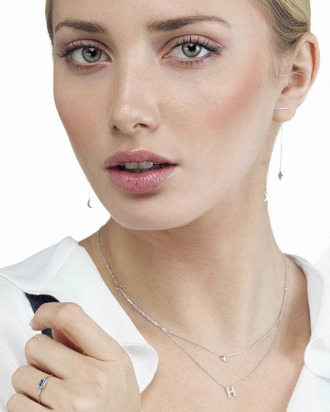 Pendientes Petite Diamonds Luna y Estrella en oro blanco de 18 Kt. Estos pendientes combinan dos de las últimas tendencias en joyería, un diseño minimalista y las cadenitas que cuelgan por detrás del lóbulo. Formados por una barrita de diamantes de la que cuelgan de forma delicada una luna y una estrella a dos alturas. Ideales para llevar tanto en el primero como en el segundo agujero, además también permiten la opción de retirar las cadenas para llevarse como una barrita simple, creando diferentes looks.