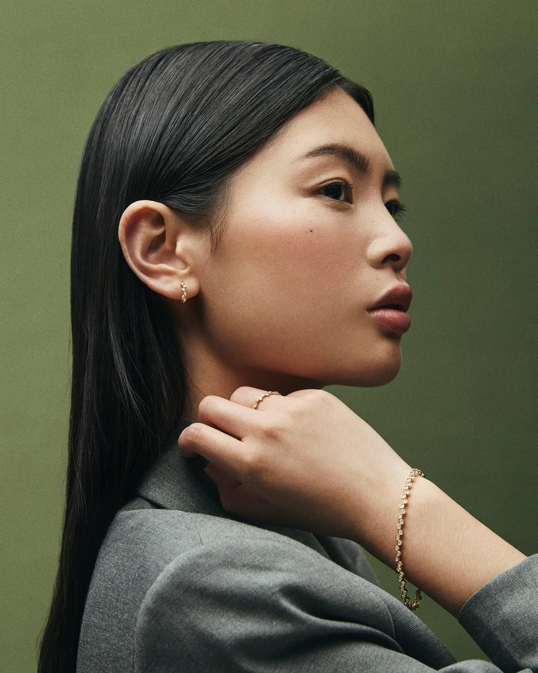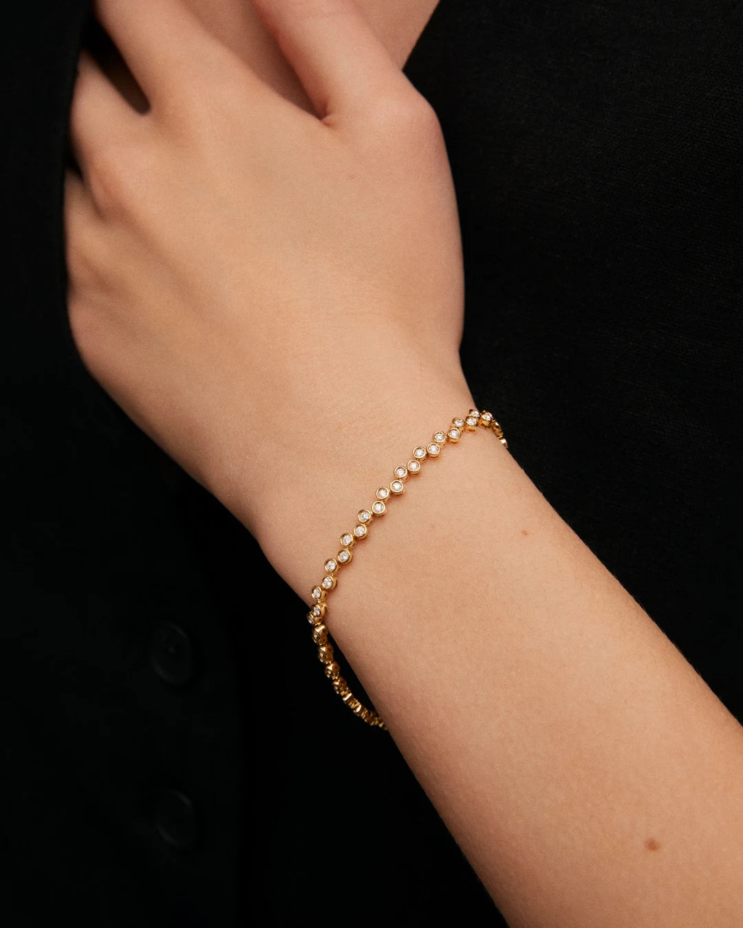 La pulsera Origine Croisée de Mumit rinde homenaje al bisel, la primera técnica de engaste de la tradición orfebre. Su diseño estilo rivière se distingue por un patrón alterno de diamantes en bisel que parece fluir sin interrupción, logrando un equilibrio perfecto entre técnica y creatividad. Las formas redondeadas que caracterizan este tipo de engaste refuerzan la continuidad del diseño y, al mismo tiempo, aportan un toque moderno inconfundible. Como si de un hilo de luz se tratara, la pureza del oro de 18 kt y el brillo de los diamantes naturales se unen en una declaración de sofisticación que trasciende las tendencias. Una pieza imprescindible que celebra el legado de la joyería fina, reinterpretándolo por medio de una estética refinada y contemporánea.