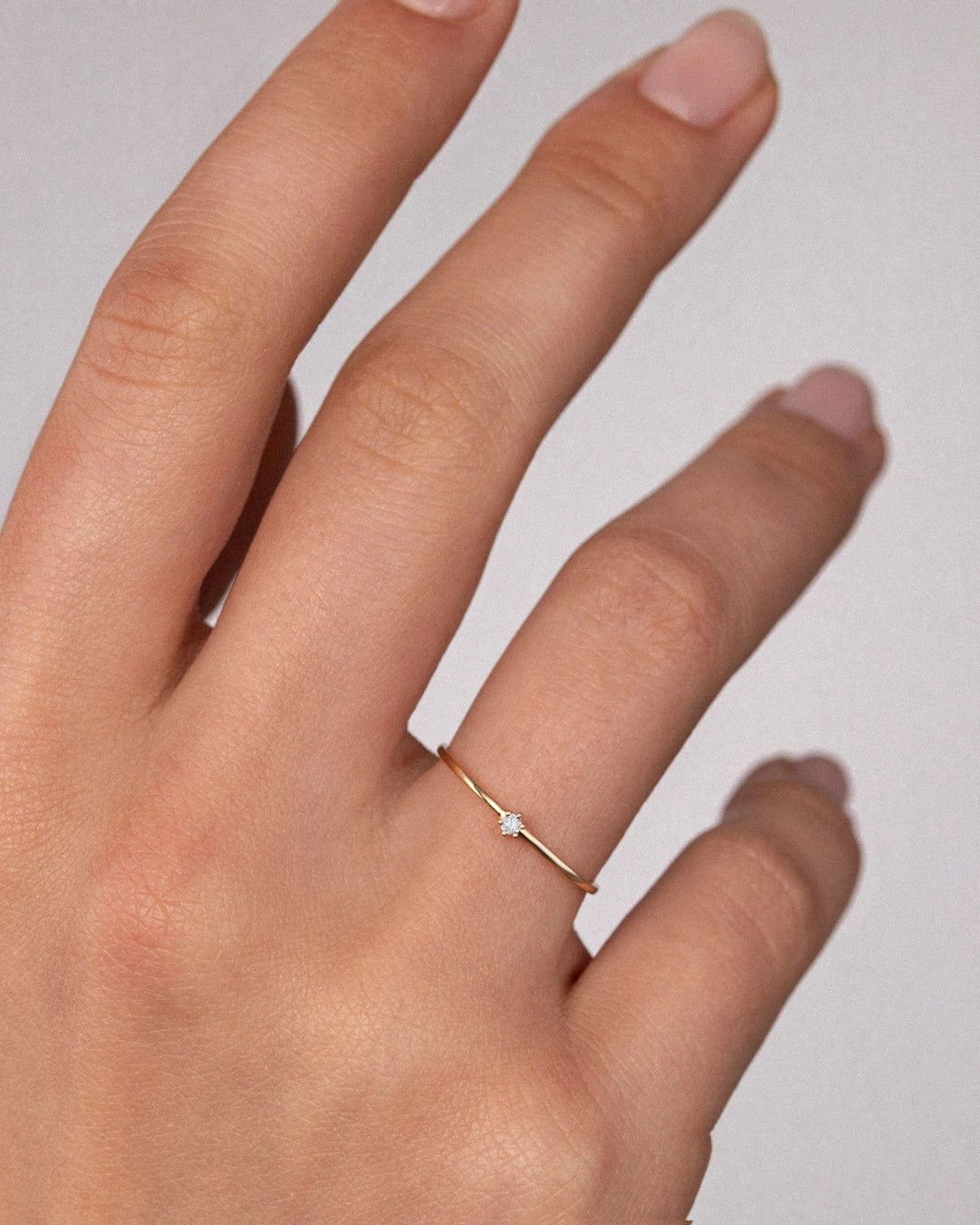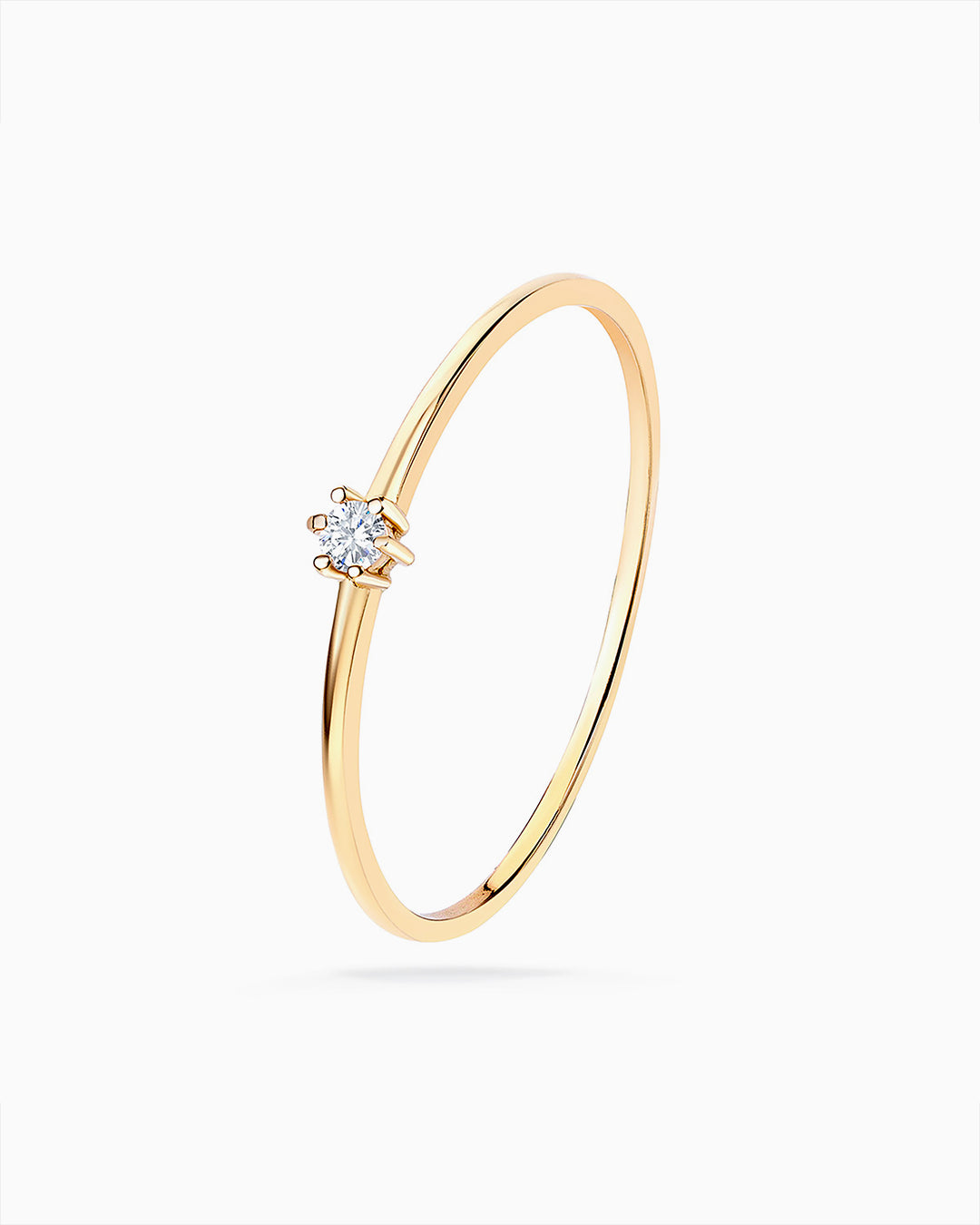 Solitario Petite Diamonds. Sortija tipo solitario de diamante en montura de seis garras elaborada en oro amarillo de 18 Kt. Su delicado y fino diseño hacen de esta maravillosa joya un básico para llevar en cualquier ocasión, este solitario se convertirá en el fondo de joyero que estabas buscando. Un diamante de 0,025 quilates engarzado en una preciosa montura de seis garras, es el detalle que aporta a esta joya su toque característico de exclusividad y elegancia. El solitario Petite Diamonds será el compañero inseparable de todas tus sortijas.El solitario Petite Diamonds está disponible en tres versiones, oro amarillo, rosa y blanco de 18 Kt.