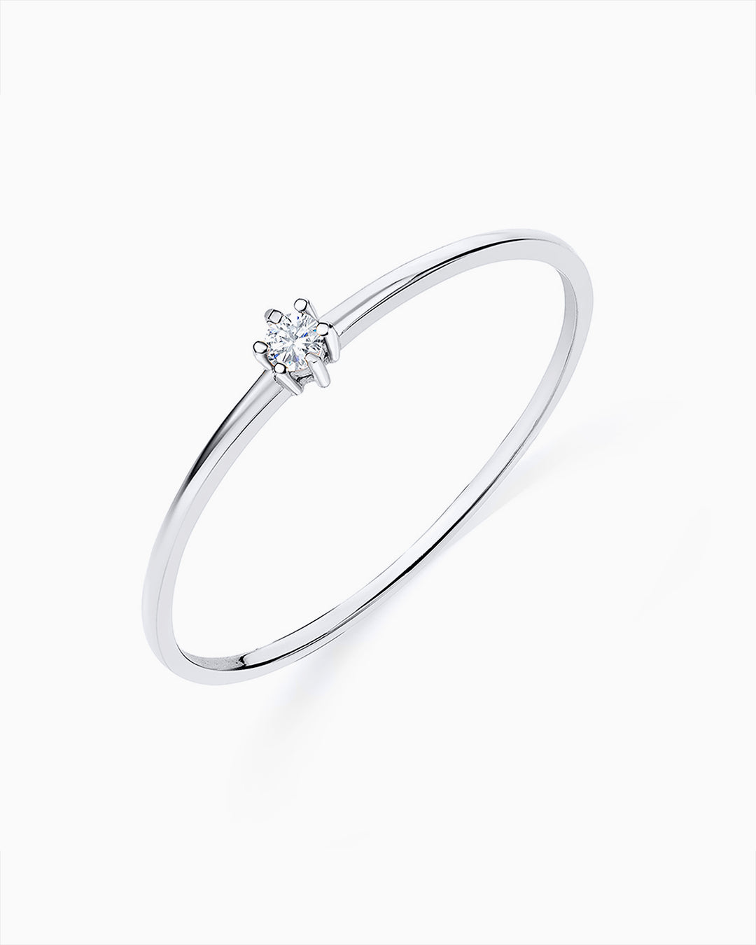 Solitario Petite Diamonds. Sortija tipo solitario de diamante en montura de seis garras elaborada en oro blanco de 18 Kt. Su delicado y fino diseño hacen de esta maravillosa joya un básico para llevar en cualquier ocasión, este solitario se convertirá en el fondo de joyero que estabas buscando. Un diamante de 0,025 quilates engarzado en una preciosa montura de seis garras es el detalle que aporta a esta joya su toque característico de exclusividad y elegancia. El solitario Petite Diamonds será el compañero inseparable de todas tus sortijas.El solitario Petite Diamonds está disponible en tres versiones, oro amarillo, rosa y blanco de 18 Kt.