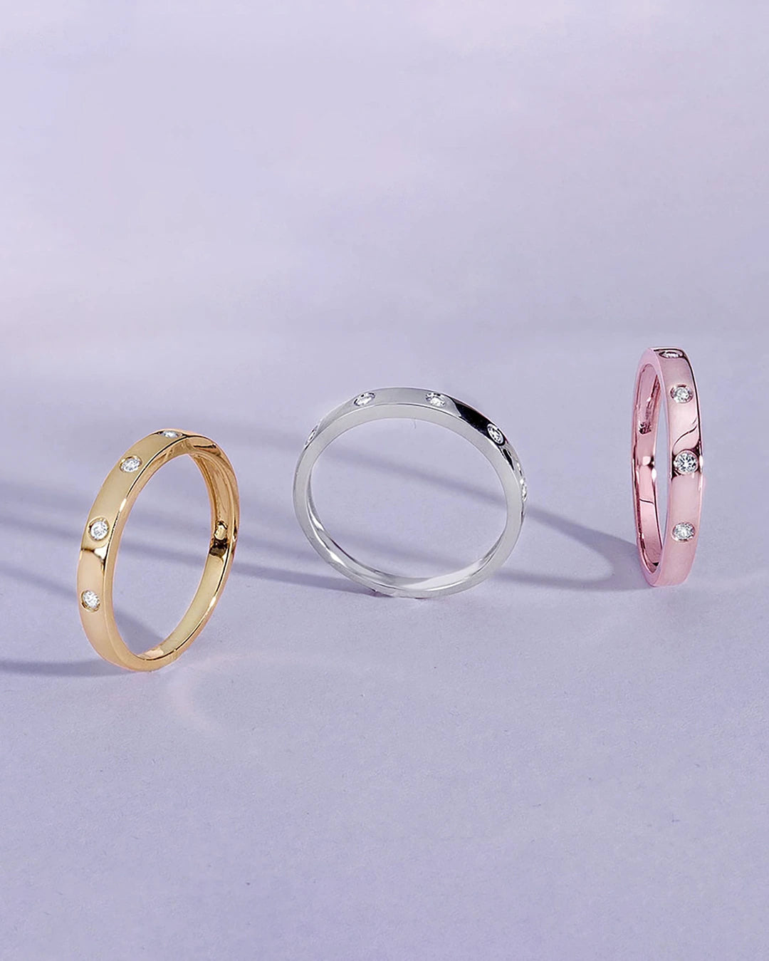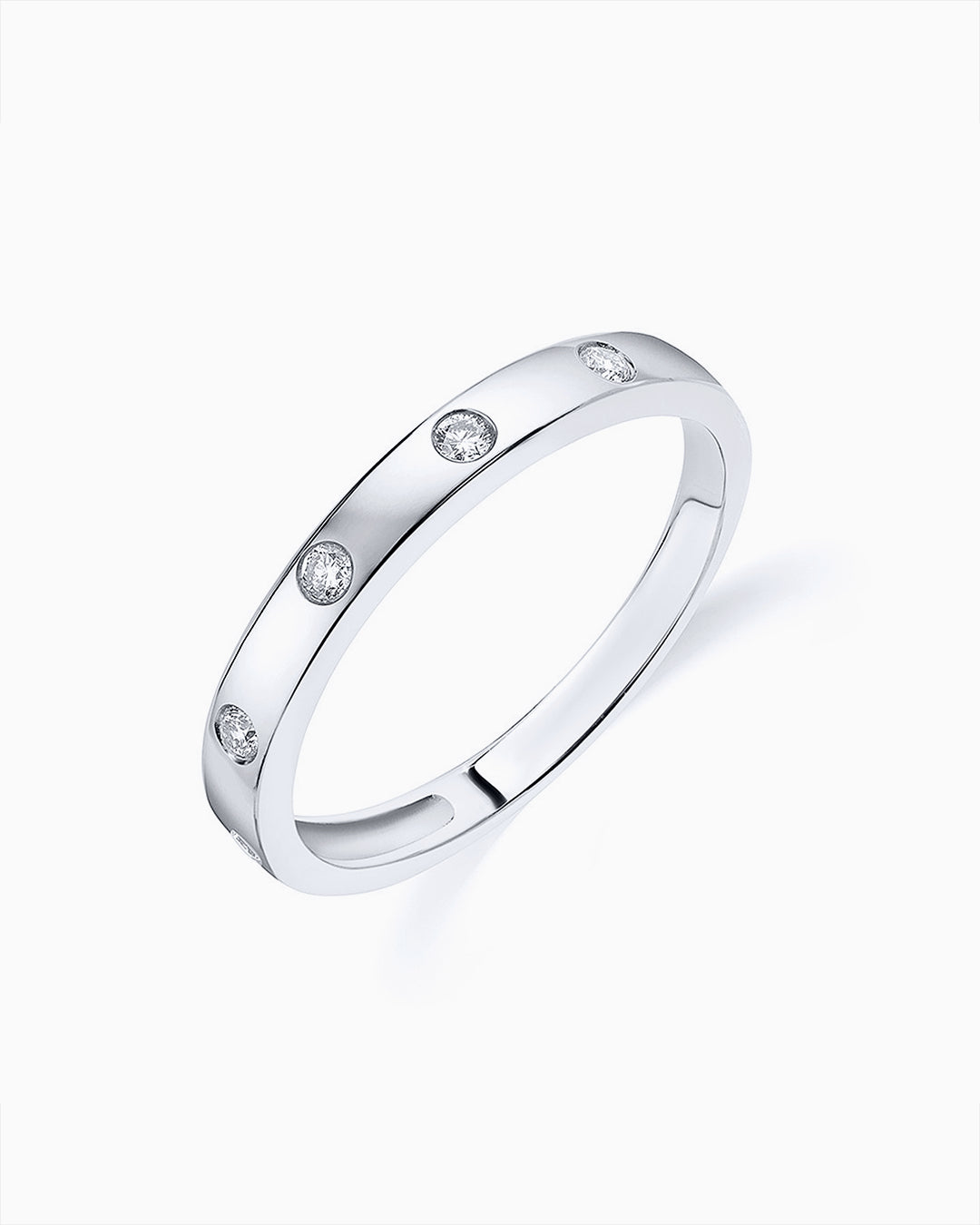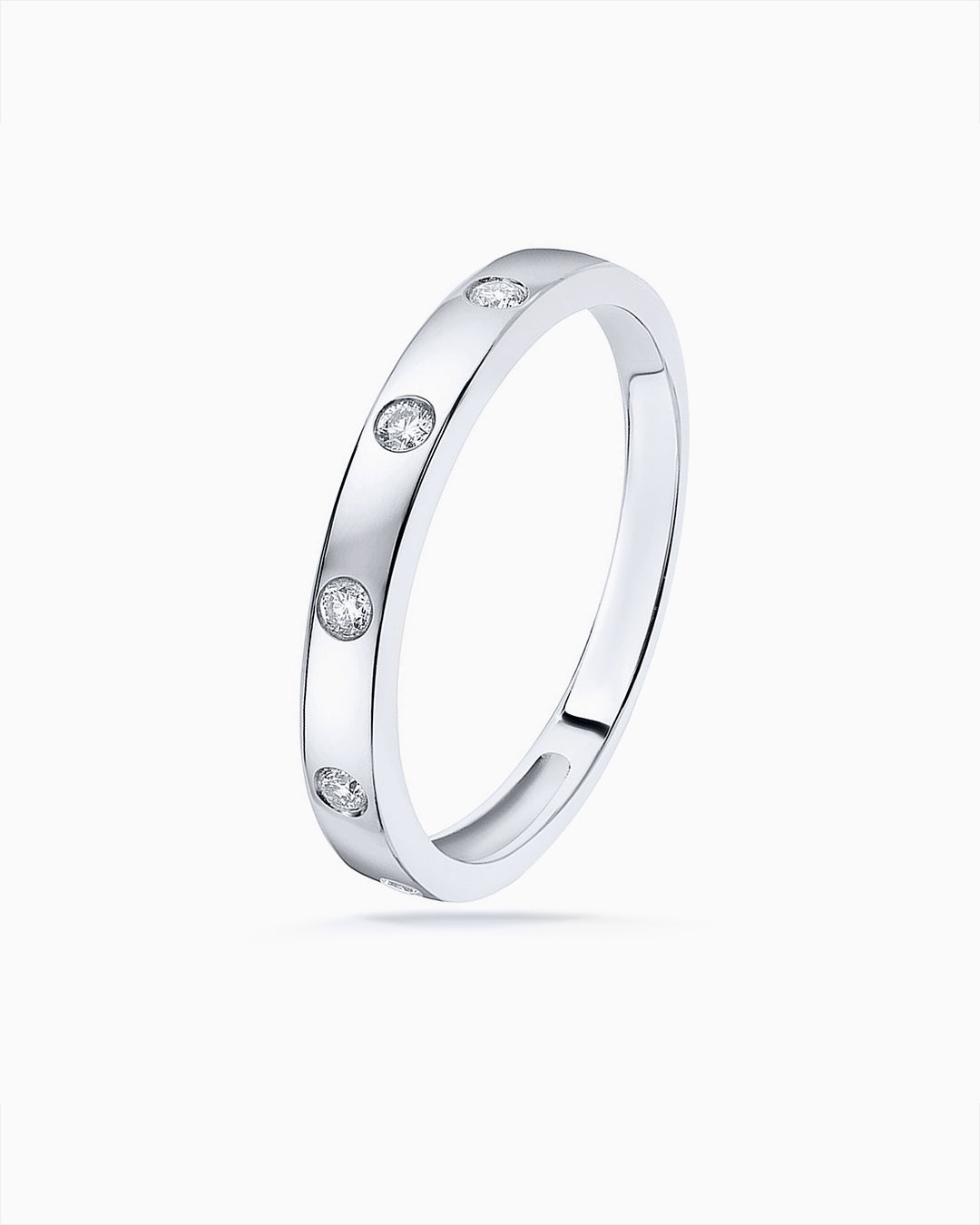 Sortija Allied de diamantes en montura de oro blanco de 18 Kt. Tierna y actual, la sortija Allied fusiona la apariencia de alianza con un toque moderno gracias a su anchura característica y los diamantes que la forman. Se trata de una sortija muy versátil diseñada para convertirse en una alianza moderna y original, así como, en un regalo de aniversario que no olvidarás. El toque mágico lo aportan los seis diamantes en combinación con el oro blanco, lo que hace de esta joya una sortija única que captará todas las miradas.La sortija Allied también está disponible en oro rosa de 18 Kt y en oro amarillo de 18 Kt, para que elijas la que mejor se adapta a tu estilo.
