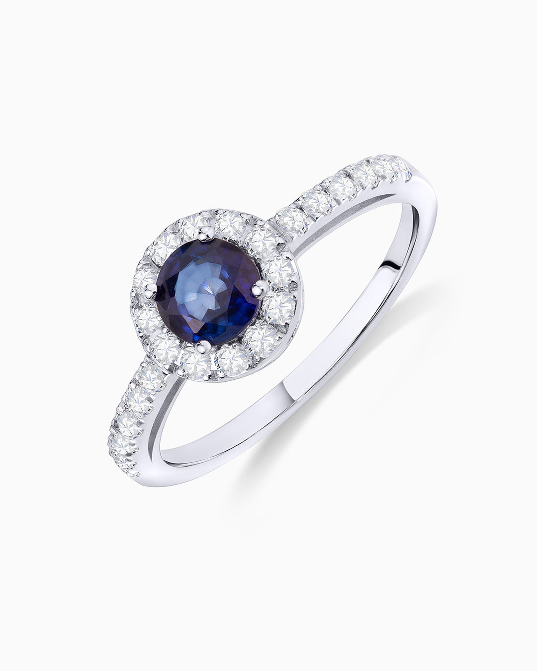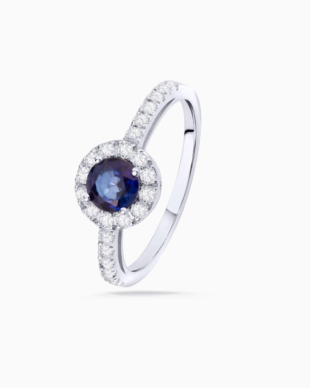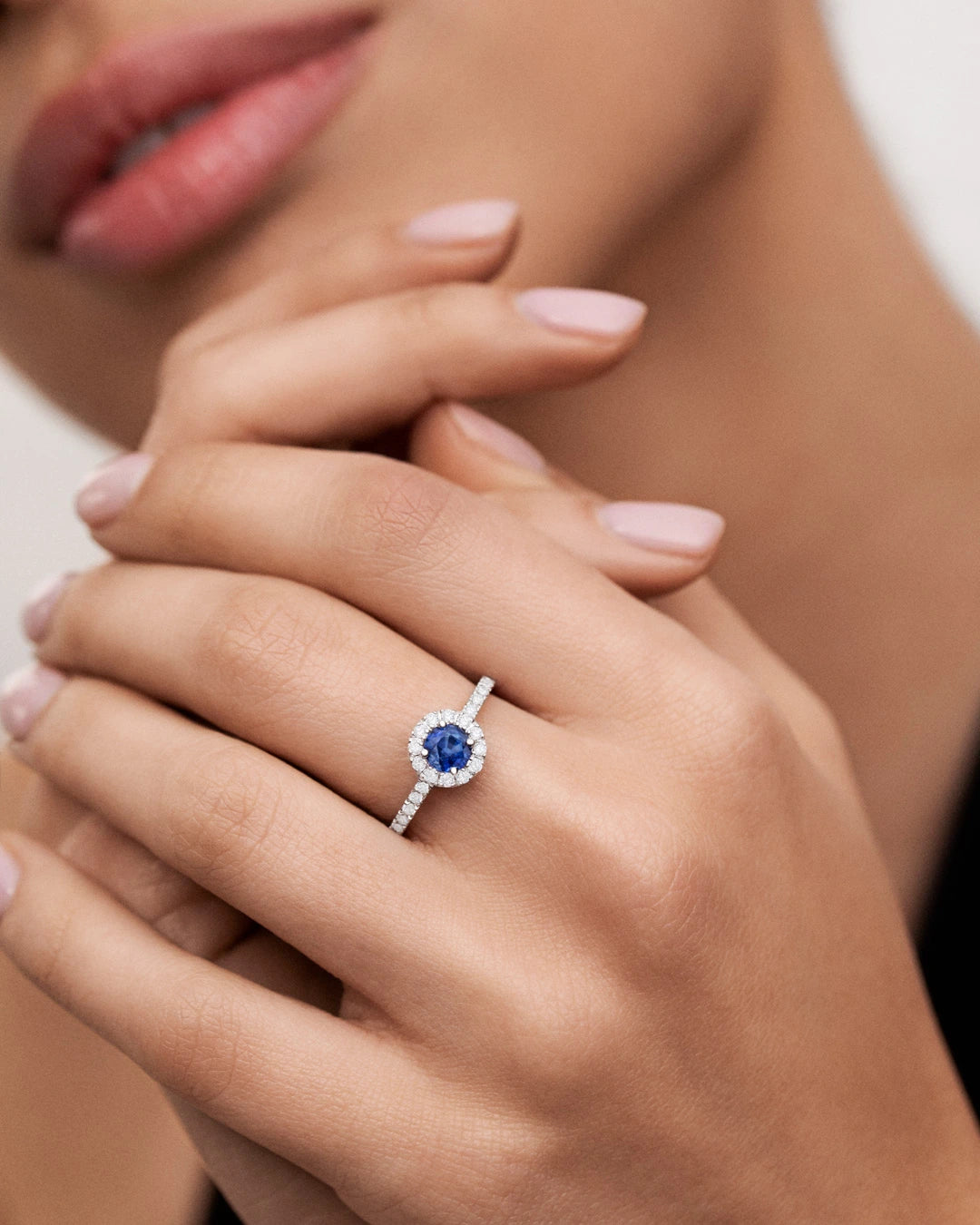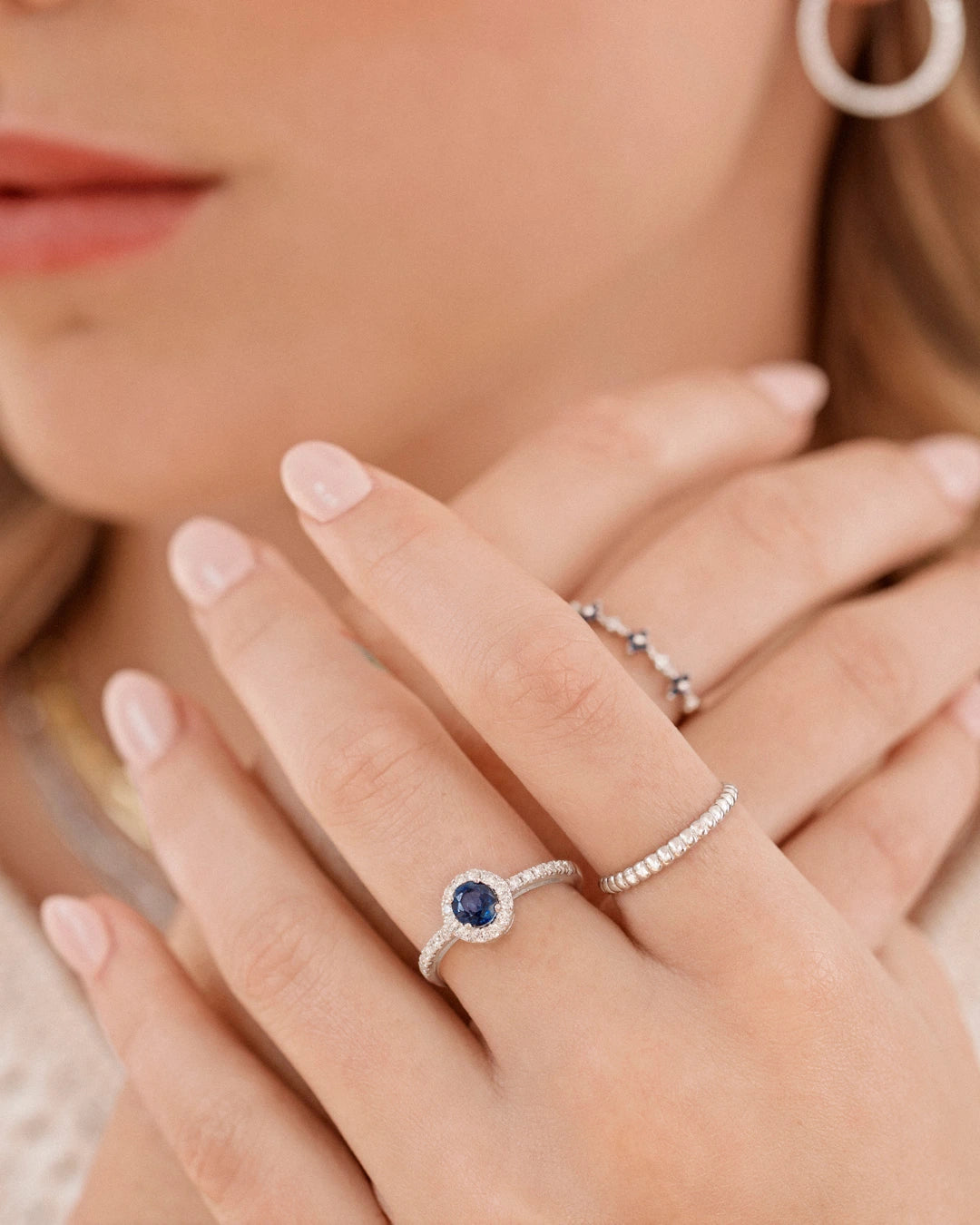 Sortija Anette de Zafiro y Diamantes en oro blanco de 18 Kt. Saber hacer y diseño se fusionan en una joya única de belleza y elegancia atemporal. Un toque de color que combina con todos los estilos, donde destaca su zafiro central rodeado por una corona de diamantes en talla brillante. Joya combinable con pendientes y gargantilla de la misma colección.