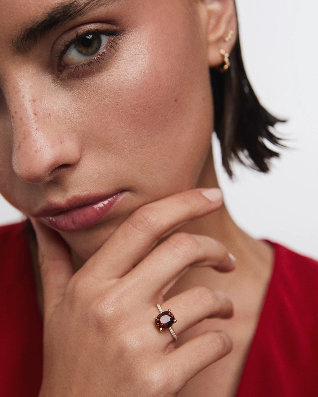 Inspirada en los diferentes tonos del amanecer, la colección Aurora evoca la belleza del cielo al alba: irrepetible, como cada turmalina. La compleja estructura cristalina de estas gemas da lugar a matices propios e inconfundibles, imposibles de replicar. Las joyas de la colección celebran estas propiedades únicas a través de un diseño depurado que cede todo el protagonismo a las turmalinas. En la sortija Aurora, la gema central presenta un rango de rojos que abarca desde las tonalidades más suaves hasta las más intensas. El engaste de cuatro garras, discreto y elegante, realza la transparencia de la turmalina y permite que cada faceta maximice la singularidad de su color. Siguiendo la misma estética, el pavé de diamantes del brazo aporta un sutil toque de brillo que resalta las características únicas de la gema sin saturar la delicadeza de la pieza. Minimalista y sofisticada a partes iguales, Aurora invita a descubrir el lado más exclusivo de la naturaleza.