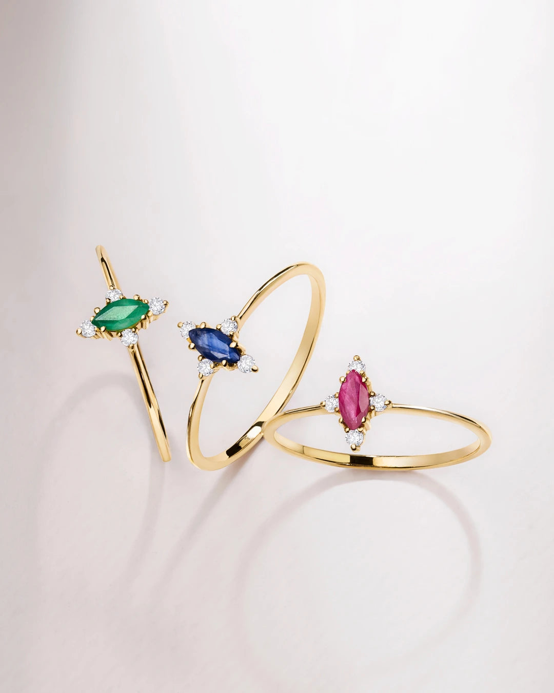 Sortija Crown Marquise de Zafiro en Oro Amarillo de 18 Kt. Inspirada en la historia de la realeza que se mantiene viva a través del brillo de las joyas más preciadas, las coronas y tiaras reales. Las piezas de la colección Crown son una exquisita interpretación minimalista de las imponentes gemas que daban vida a las joyas de La Corona. Una joya llena de color y brillo, la original sortija Crown Marquise es la perfecta fusión entre elegancia y modernidad en una joya cuyo protagonista es un magnético zafiro en talla marquesa custodiado por cuatro diamantes en talla brillante. Una colección cargada de elegancia moderna que representa pasado y presente a través de su brillo. Las sortijas Crown están disponibles en oro amarillo de 18 Kt y en varias versiones, con gema central en talla marquesa u oval y con rubí, esmeralda o zafiro.