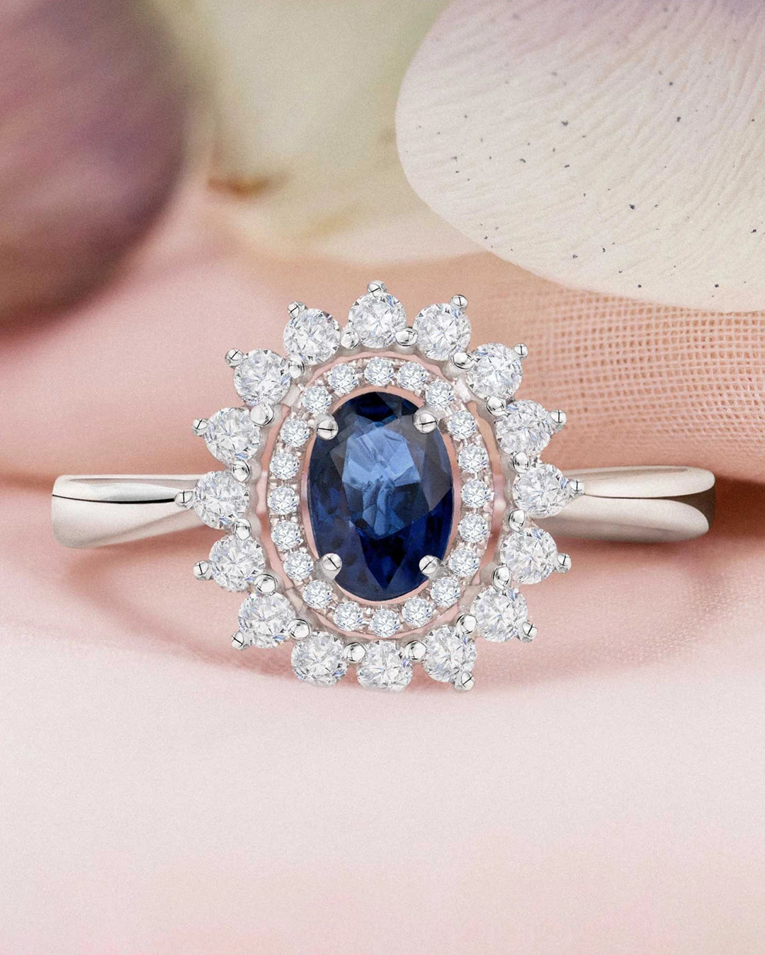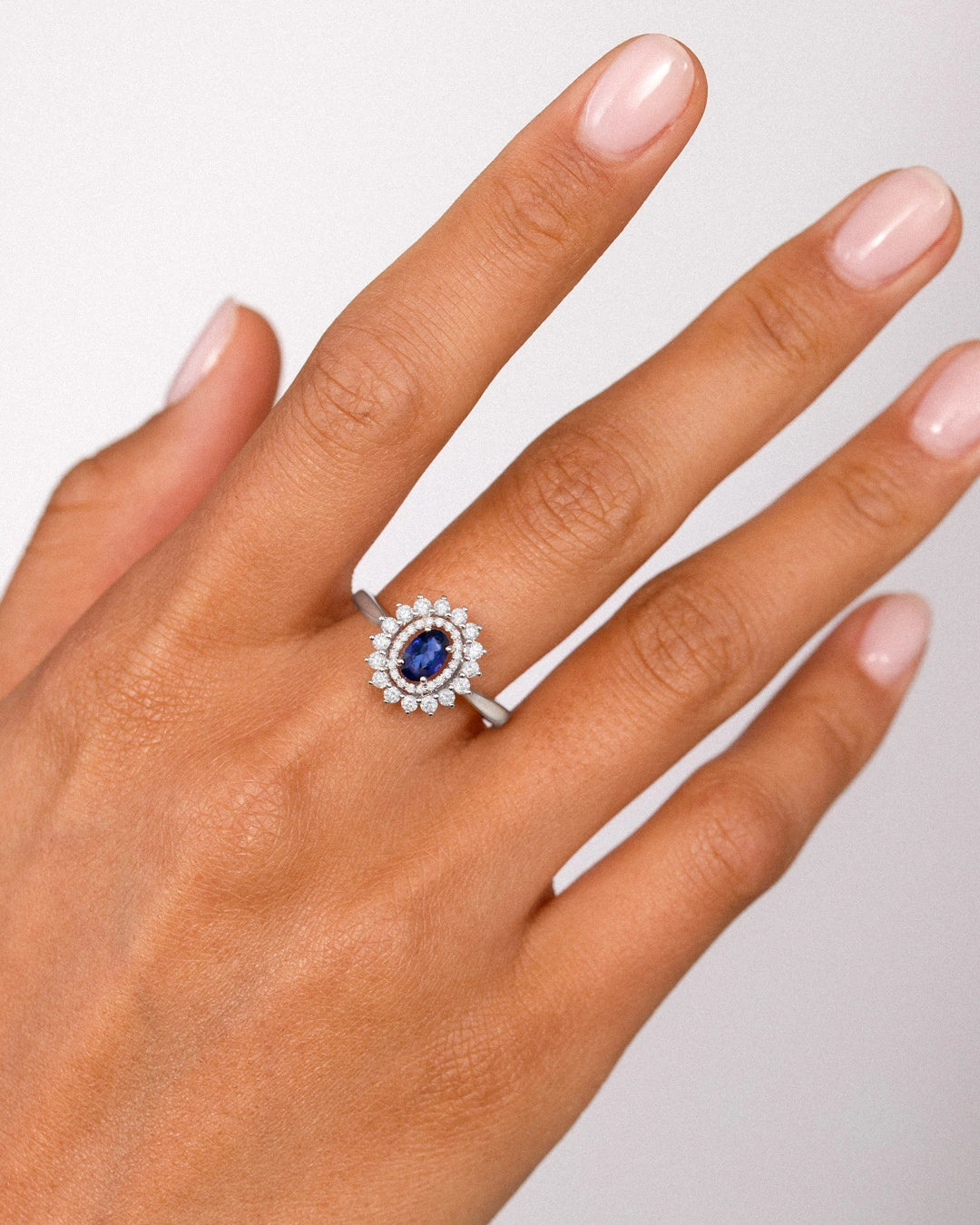 Sortija Gala de zafiro central en talla oval y diamantes sobre montura de oro blanco de 18 Kt. La...