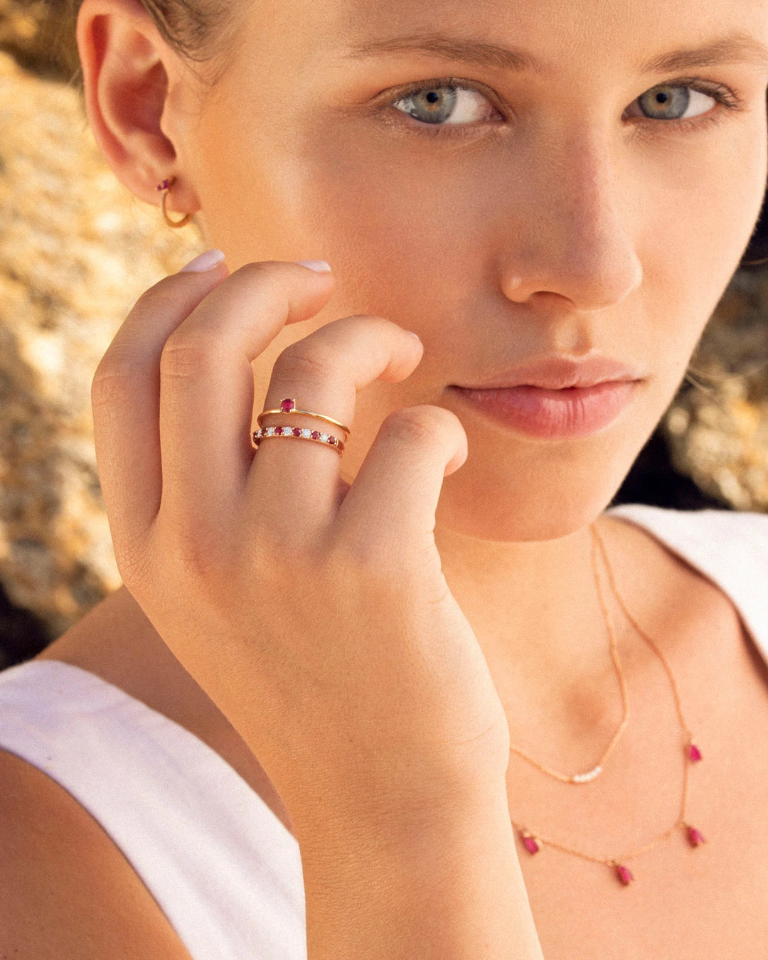 Sortija media alianza Milett elaborada en oro rosa de 18 Kt con rubíes y diamantes. Cuando una joya tiene el poder de trascender las palabras surgen piezas mágicas. La nueva colección Milett se inaugura con cuatro sortijas que aúnan color, delicadeza y elegancia. La sortija media alianza Milett de rubíes y diamantes ha sido diseñada para llevarse sola o combinada con las demás sortijas de la colección, creando un juego de colores único y personal. Esta sortija representa una reinvención de la media alianza en cinco sublimes colores. ¿Qué significado guardará la tuya?La sortija media alianza Milett está disponible en cinco versiones en oro amarillo, rosa y blanco de 18 Kt y diferentes combinaciones de gemas y diamantes.