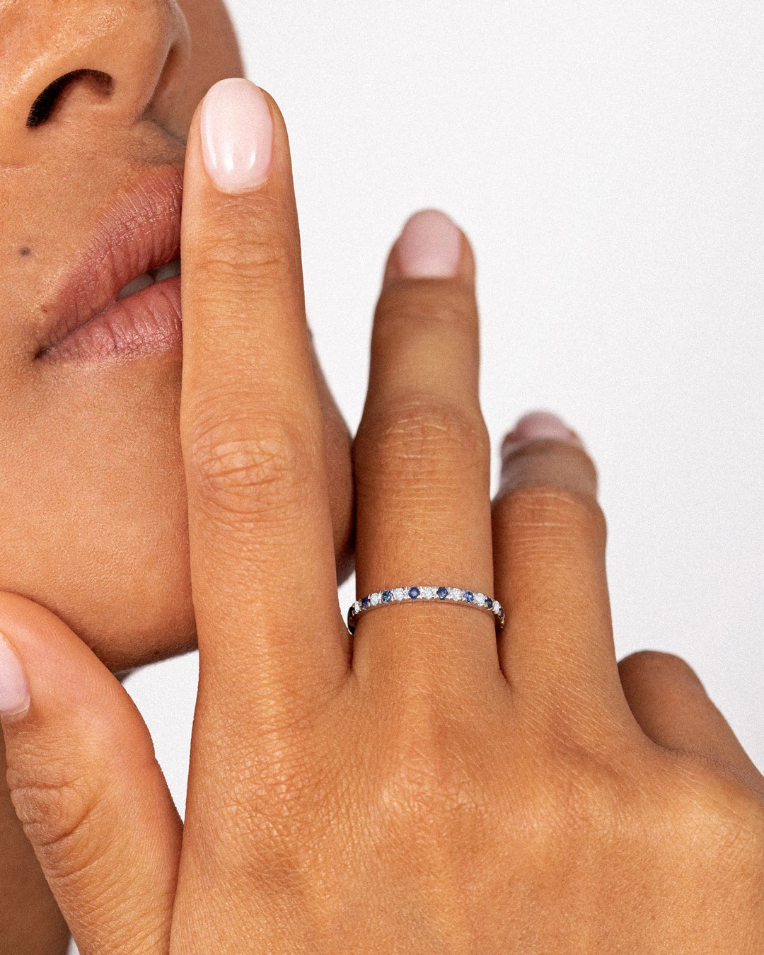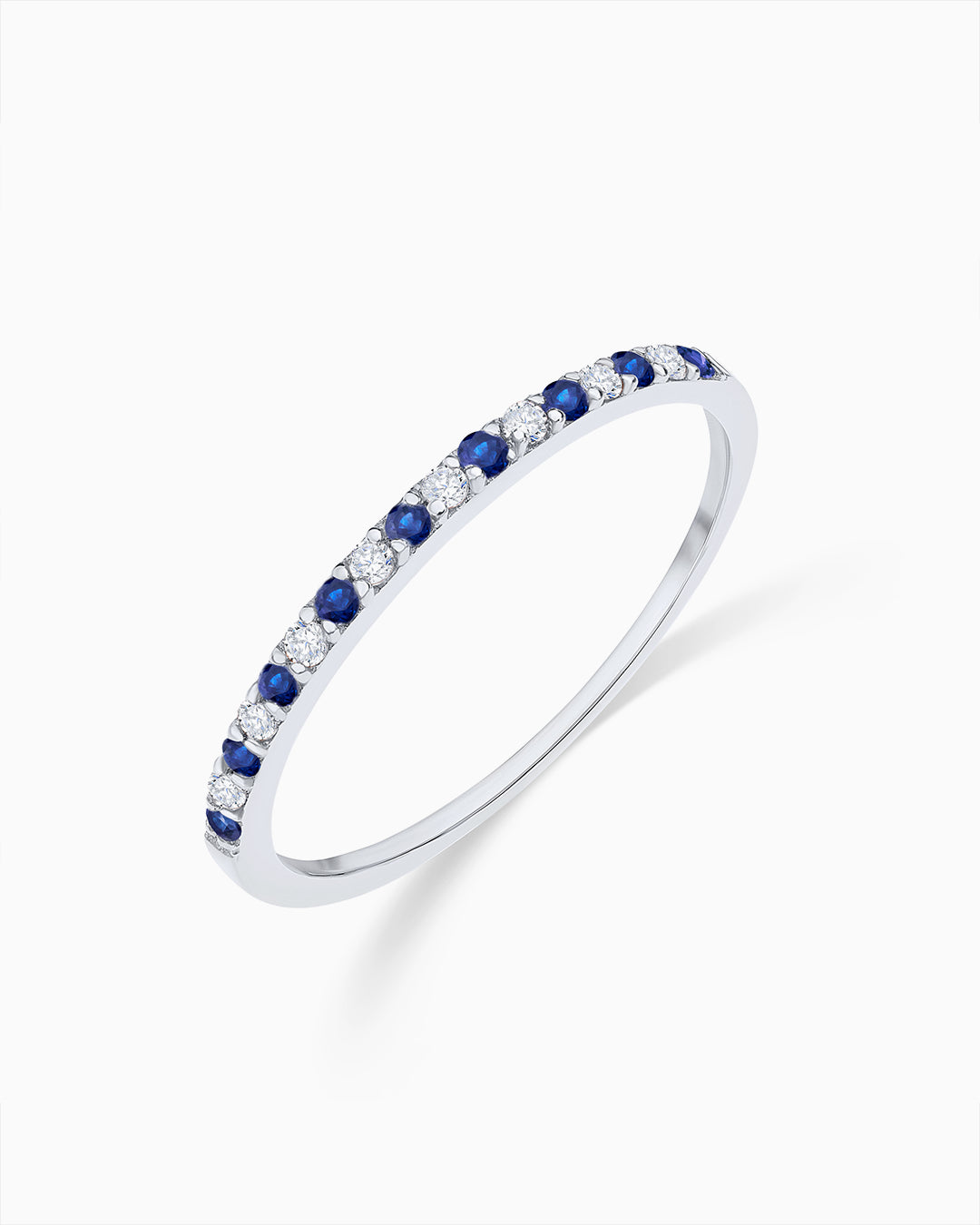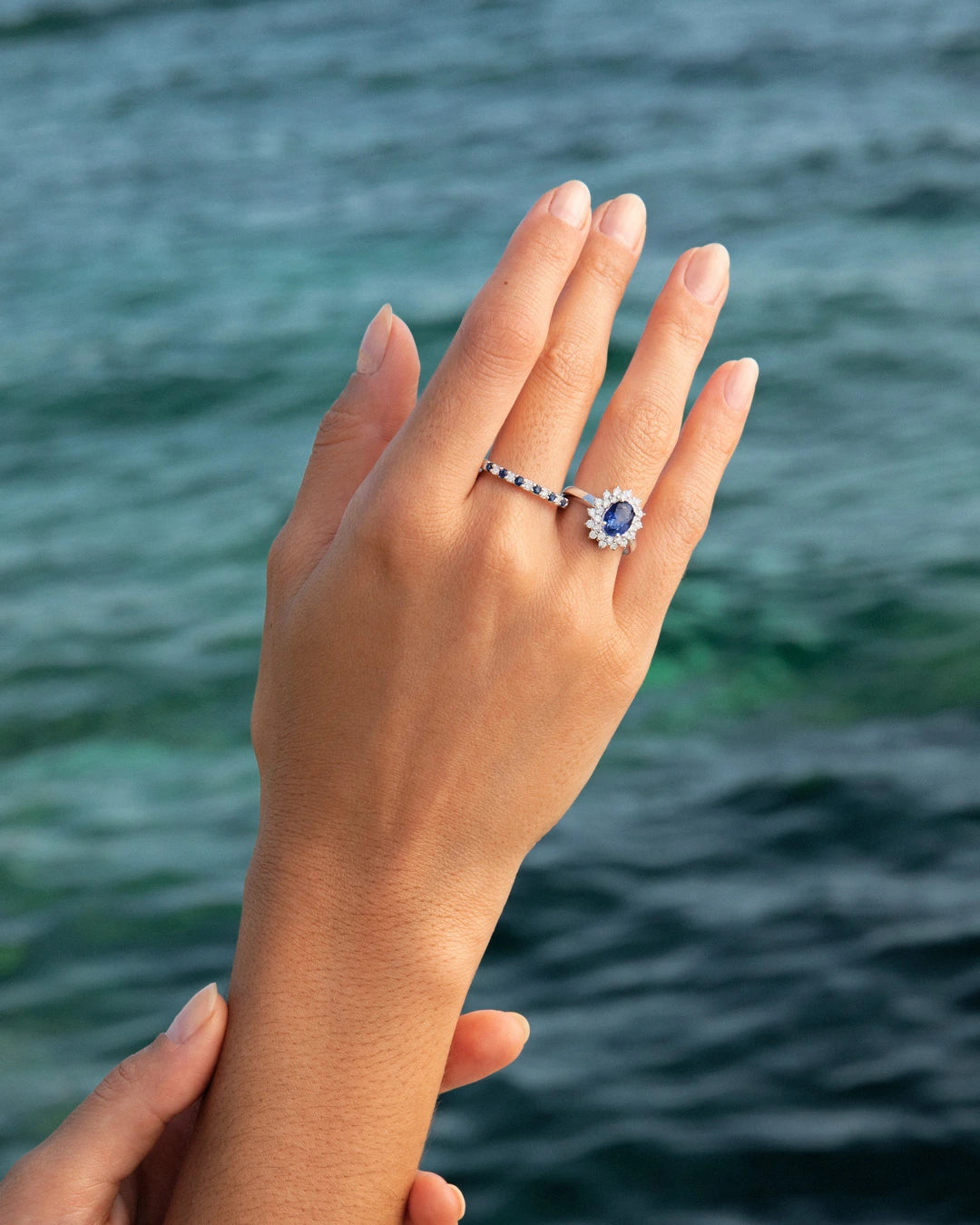 Sortija media alianza Milett elaborada en oro blanco de 18 Kt con zafiros y diamantes. Cuando una...