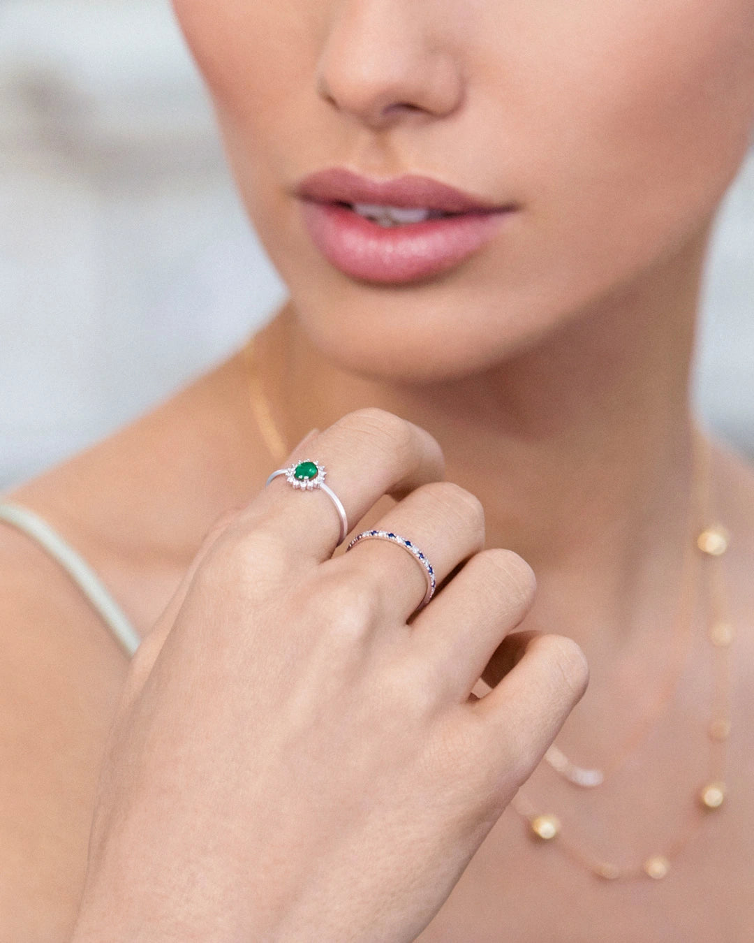 Sortija media alianza Milett elaborada en oro blanco de 18 Kt con zafiros y diamantes. Cuando una joya tiene el poder de trascender las palabras surgen piezas mágicas. La nueva colección Milett se inaugura con cuatro sortijas que aúnan color, delicadeza y elegancia. La sortija media alianza Milett de zafiros y diamantes ha sido diseñada para llevarse sola o combinada con las demás sortijas de la colección, creando un juego de colores único y personal. Esta sortija representa una reinvención de la media alianza en cinco sublimes colores. ¿Qué significado guardará la tuya?La sortija media alianza Milett está disponible en cinco versiones en oro amarillo, rosa y blanco de 18 Kt y diferentes combinaciones de gemas y diamantes.