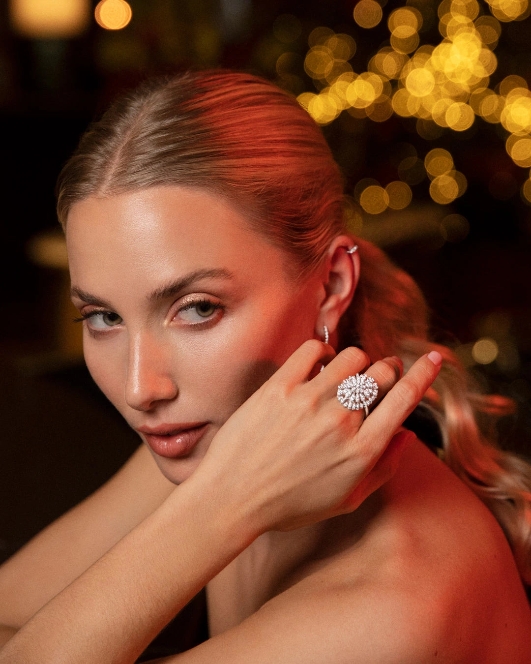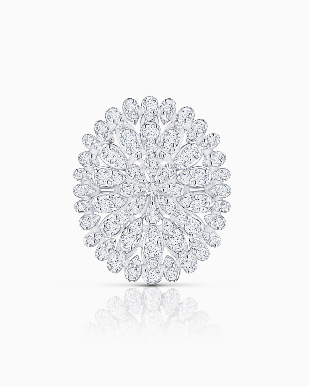 Sortija Nala de diamantes engastados en montura de oro blanco de 18 Kt. La sortija Nala es una pieza diseñada para irradiar belleza pura y divinidad. Elaborada a partir de una minuciosa selección de diamantes naturales en talla brillante, su grado de pureza da lugar a una luminosidad única. Su diseño se distingue por una original roseta de tres halos que evoca el hechizo de una constelación, confiriéndola una personalidad única a esta original sortija. Una pieza de alta joyería tan excepcional como deslumbrante, creada para capturar recuerdos y hacerlos eternos. Imposible no dejarse atrapar por su arrebatadora belleza.