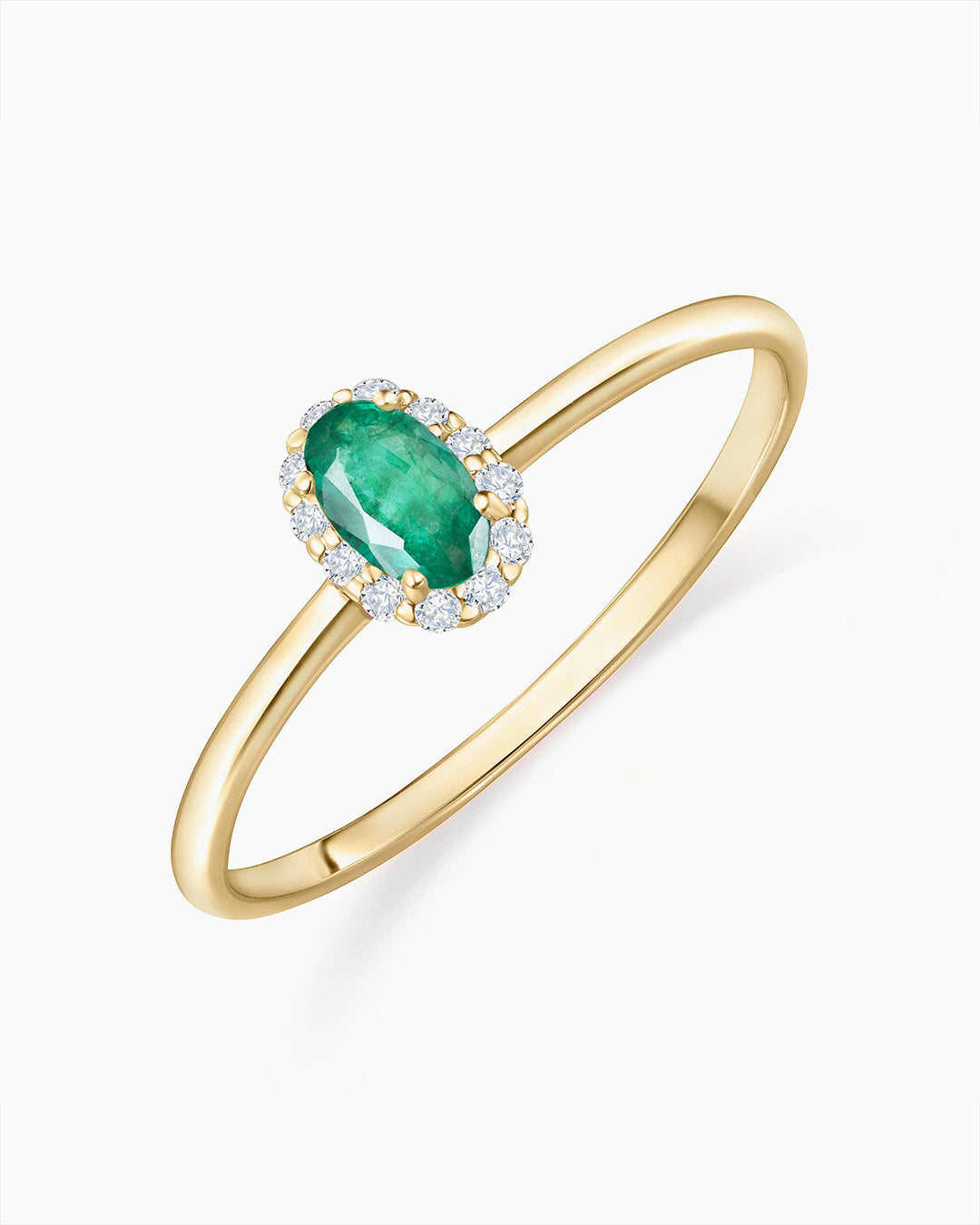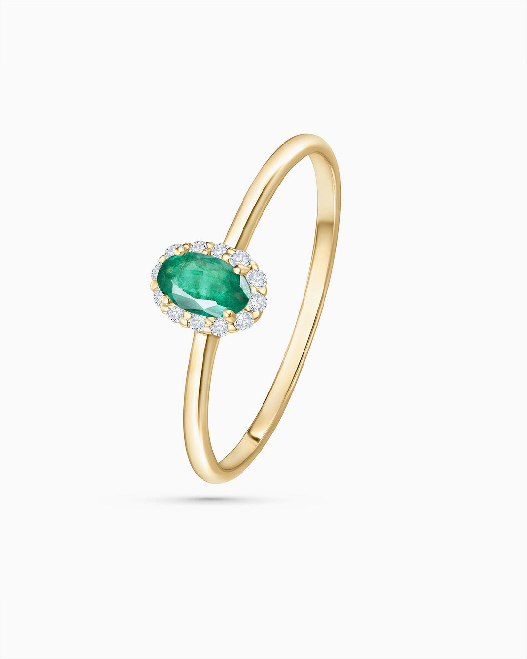 Sortija Nina de esmeralda central en talla oval y diamantes sobre montura de oro amarillo de 18 Kt. Nina es una pequeña gran revolución, una delicada obra de arte inspirada en una joya icono en su versión más petite. Esta sortija fusiona a la perfección el espíritu audaz que caracteriza cada diseño Mumit con el saber hacer plasmado en su elaborada montura. Cuenta con una esmeralda central en talla oval coronada por una delicada orla de diamantes minuciosamente escogidos para elevar su belleza, creando así un juego de luz y color. Una pequeña revolución perfecta para tu día a día, deja que Nina revolucione tu joyero.La sortija Nina está disponible en cuatro versiones, en oro rosa, blanco y amarillo con esmeralda, zafiro, rubí, aguamarina o zafiro rosa central.