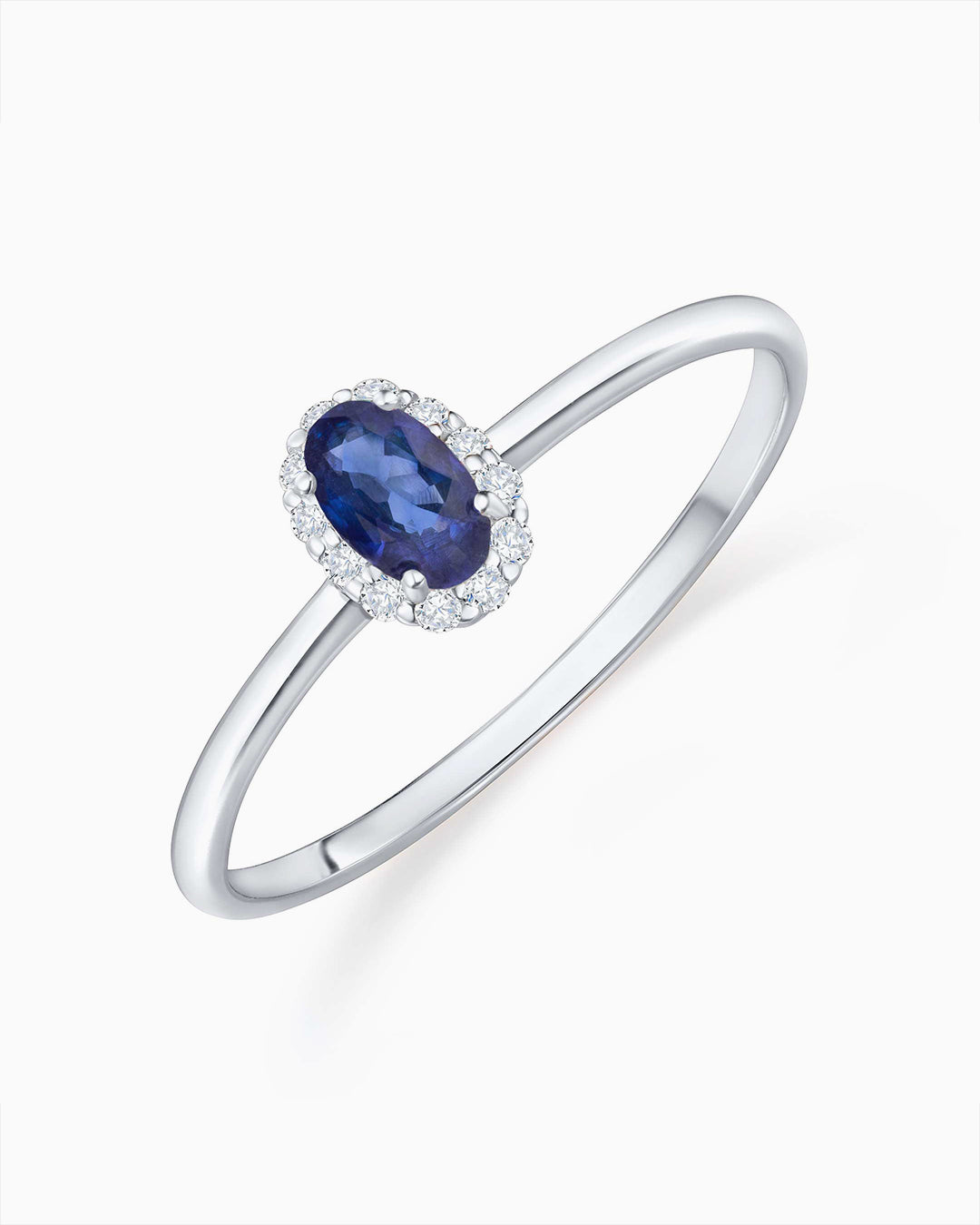 Sortija Nina de zafiro central en talla oval y diamantes sobre montura de oro blanco de 18 Kt. Ni...