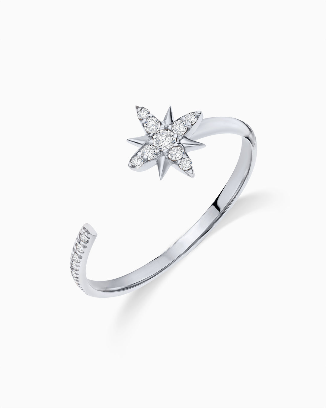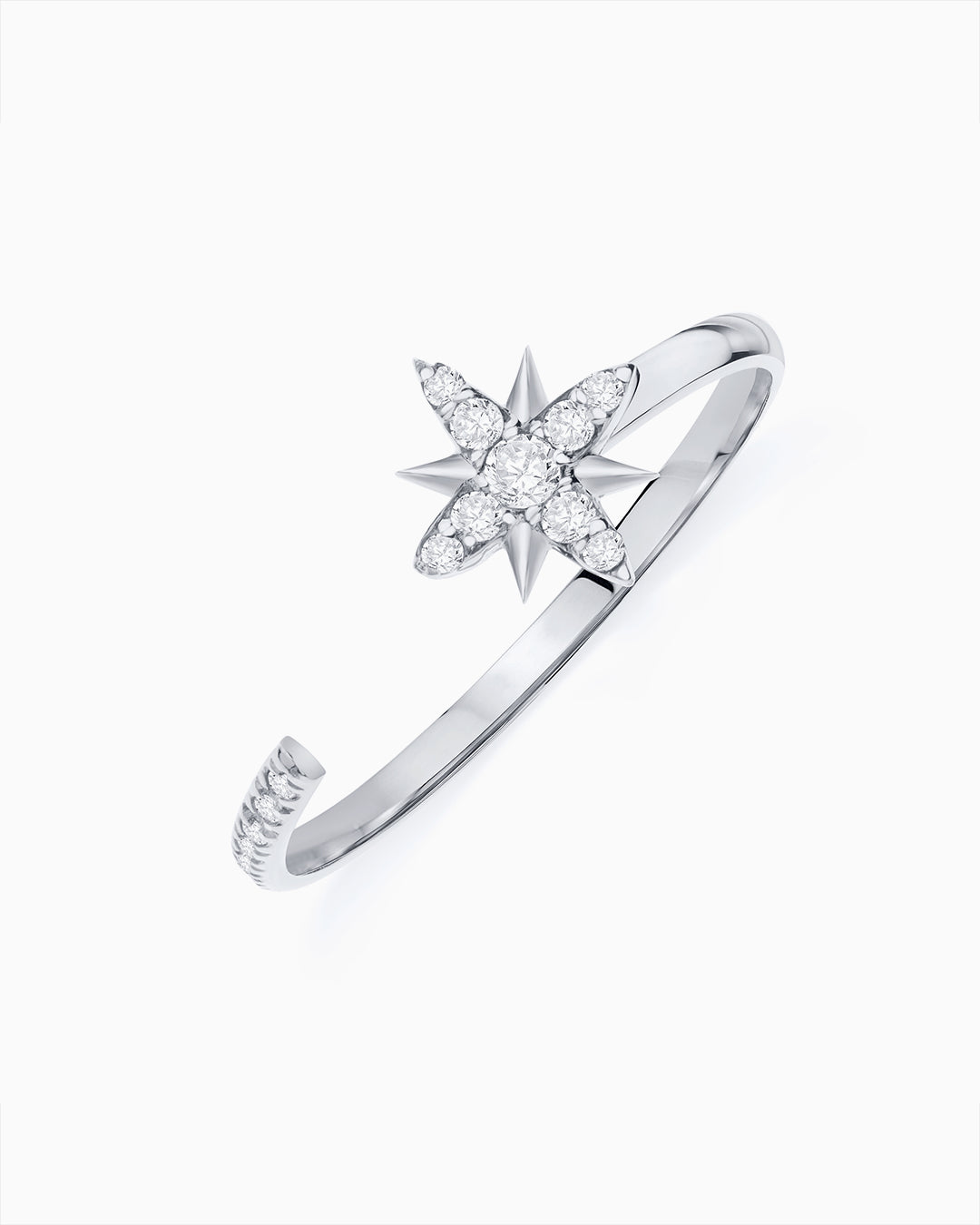 Sortija Rosa de los Vientos Open de diamantes montados en oro blanco de 18 Kt. La sortija Rosa de los Vientos Open completa la colección inspirada en el tradicional símbolo marinero reinterpretado a través de la esencia que caracteriza todas las joyas Mumit. Se trata de una sortija de estilo torques en la que en un extremo se encuentra el símbolo de la Rosa de los Vientos y en el extremo contrario un exquisito pavé de diamantes. Los diamantes, minuciosamente montados crean la forma de su flor de lis central, la pincelada final de una joya que brilla con luz propia. Al igual que todos los elementos de la colección, esta original sortija evoca la apertura de un horizonte jamás explorado.La sortija Rosa de los Vientos Open está disponible en dos versiones, oro rosa y blanco de 18 Kt.