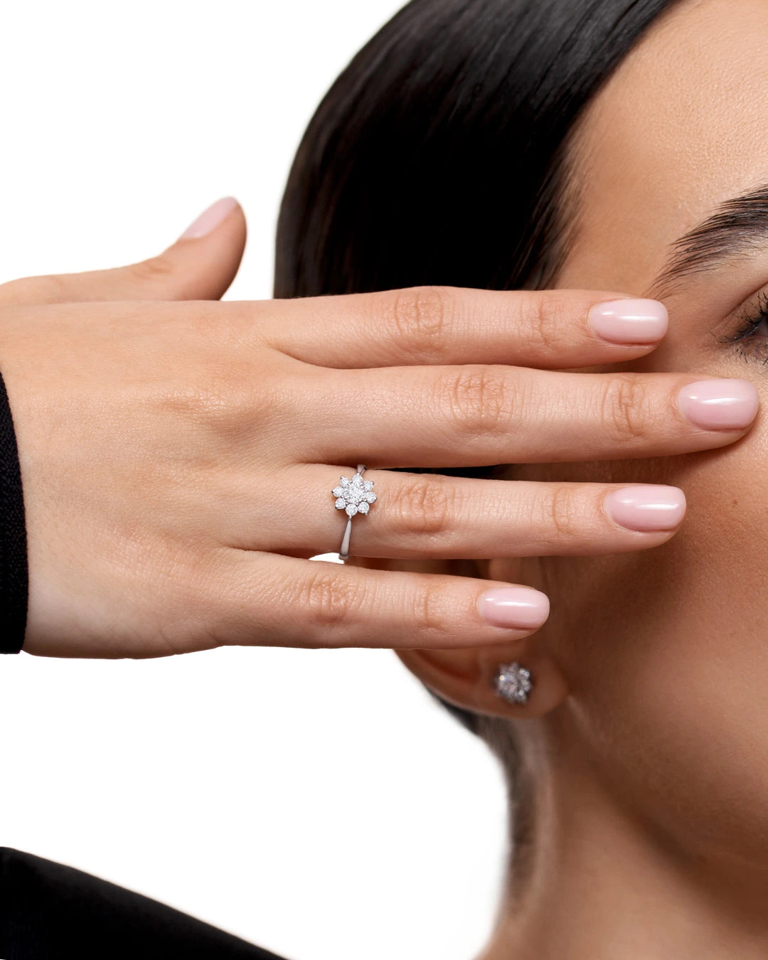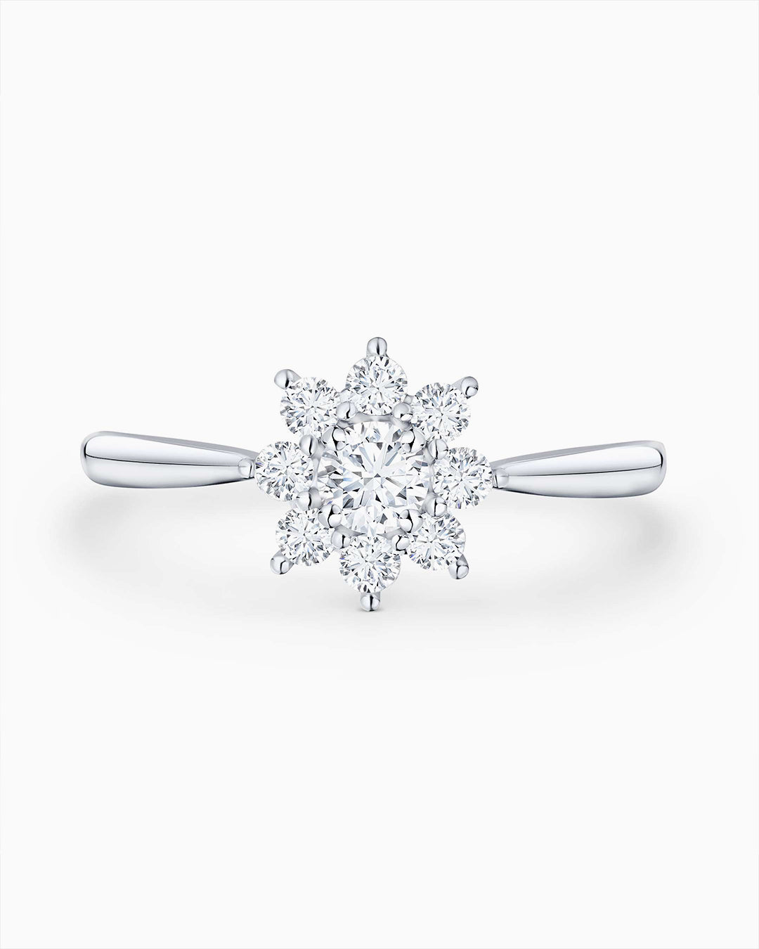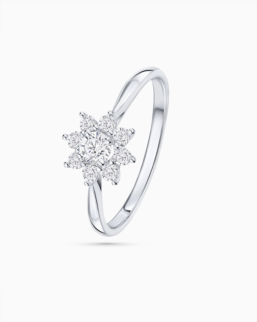 Sortija Rosette Solitaire con diamante central montado en oro blanco de 18 Kt. La sortija Rosette Solitaire protagoniza nuestra colección más especial. Las delicadas gotas de agua, el reflejo de la luz del amanecer en un jardín de rosas. El brillo de la mañana y las sensibles formas de los pétalos de rosa dotan de personalidad a una colección que celebra la belleza de la naturaleza. Una sortija tan original como elegante, formada por una maravillosa roseta central que evoca la forma de los pétalos de rosa. Una pieza de alta joyería a través de la cual los brillantes aportan un giro único haciendo de ésta, una pieza ideal para cualquier ocasión. Perfecta para combinar con las demás piezas de la colección Rosette.La sortija Rosette Solitaire está disponible en dos versiones adicionales de 0,34 y 0,75 quilates.