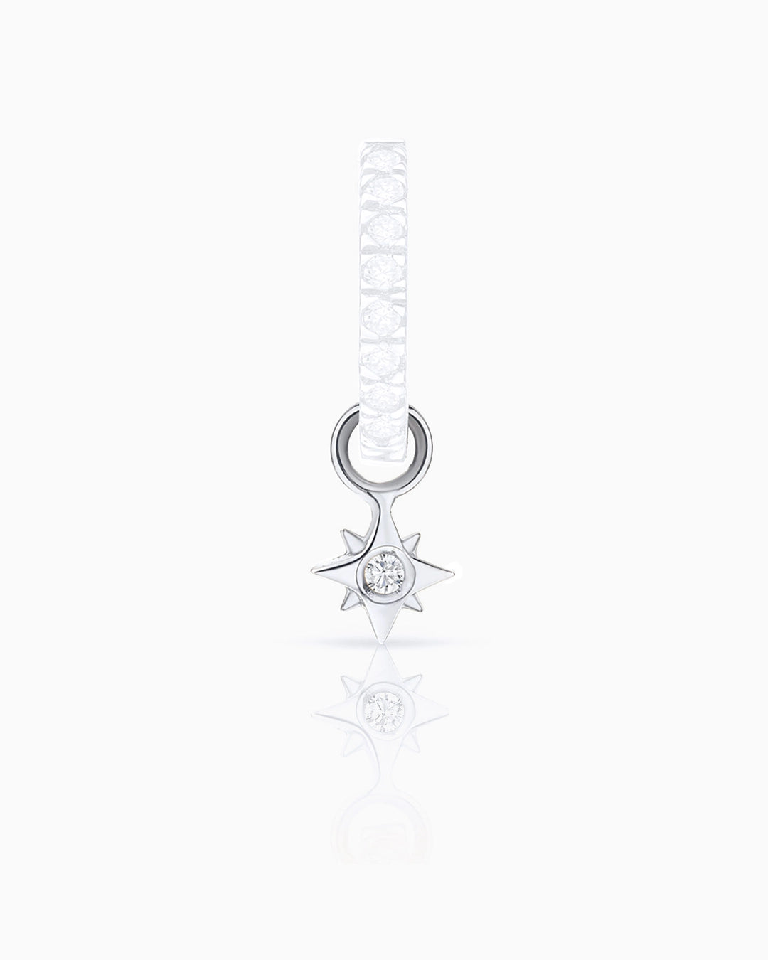 Espectacular charm Rosa de los Vientos para pendiente de aro en oro blanco de 18 Kt. Esta joya te cautivará desde el primer momento en que pongas tus ojos en ella, con la finura de su diseño que incorpora un inmaculado diamante en talla brillante, de extrema pureza. La Rosa de los Vientos y su bellísima forma y pequeño tamaño te enamorarán. Combina a la perfección con los pendientes Mumit Petite Diamonds Aro, Pendientes Eternity Colors Aro y Piercings aro Punk.