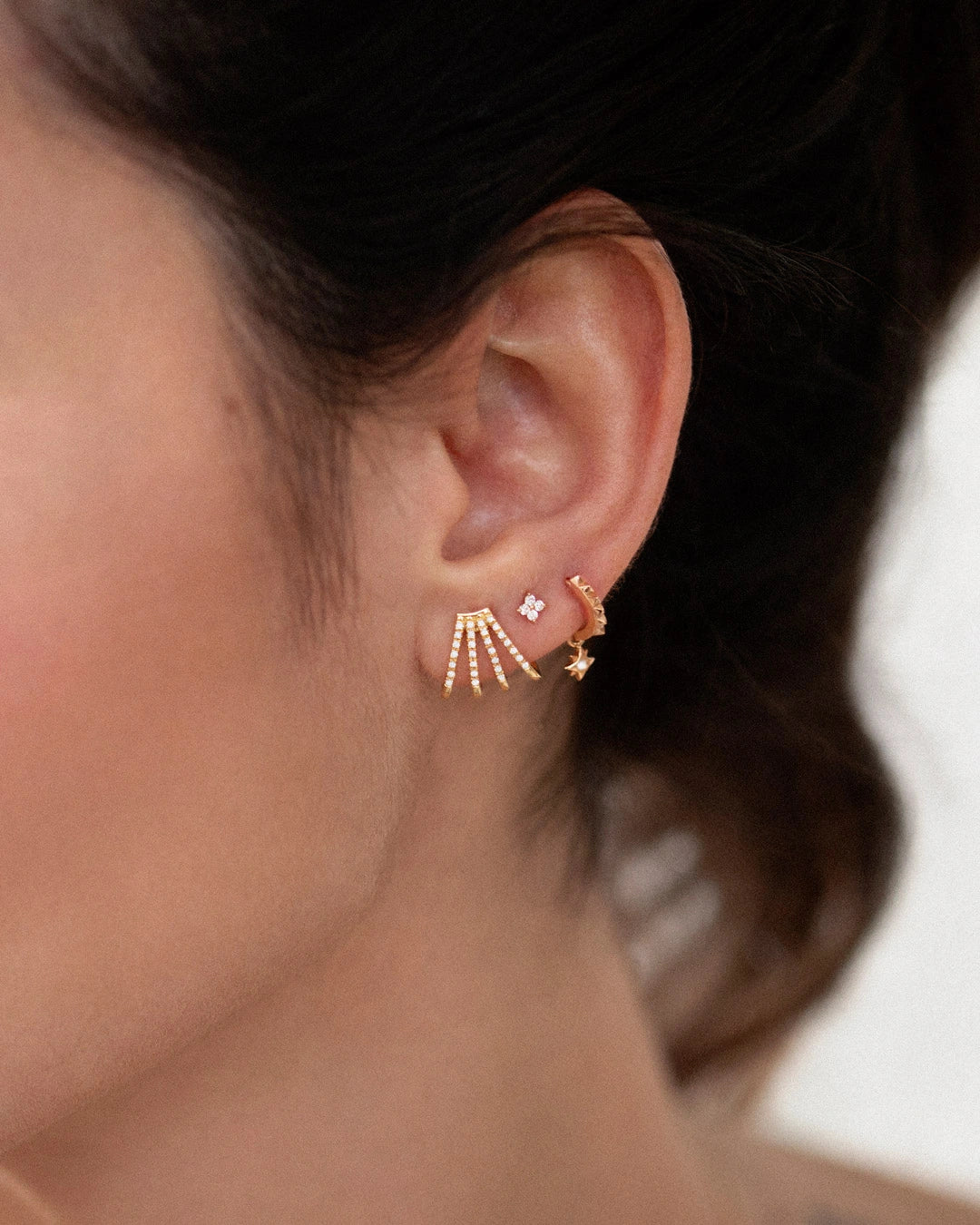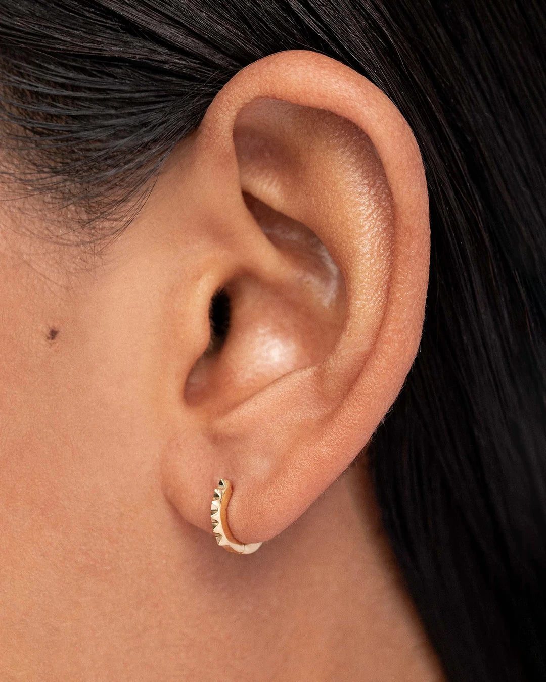 Pendiente tipo piercing de aro Punk elaborado en oro amarillo de 18 Kt. Este piercing es el toque 'punk' que estabas buscando para tu oreja, ligero e ideal para no quitártelo nunca. Elaborado en oro amarillo de 18 Kt, su original diseño de sutiles pinchos en relieve le aporta un punto de modernidad que te enamorará. Cuenta con un diámetro de 7 mm lo que permite su ajuste en cualquier pendiente, además, incorpora un cierre tipo congo lo que facilita su puesta y adaptación a cualquier piercing.El pendiente piercing de aro Punk está disponible en tres versiones, oro amarillo, rosa y blanco de 18 Kt. ¡Únete a la tendencia de moda y crea tu ear look con Mumit!.
