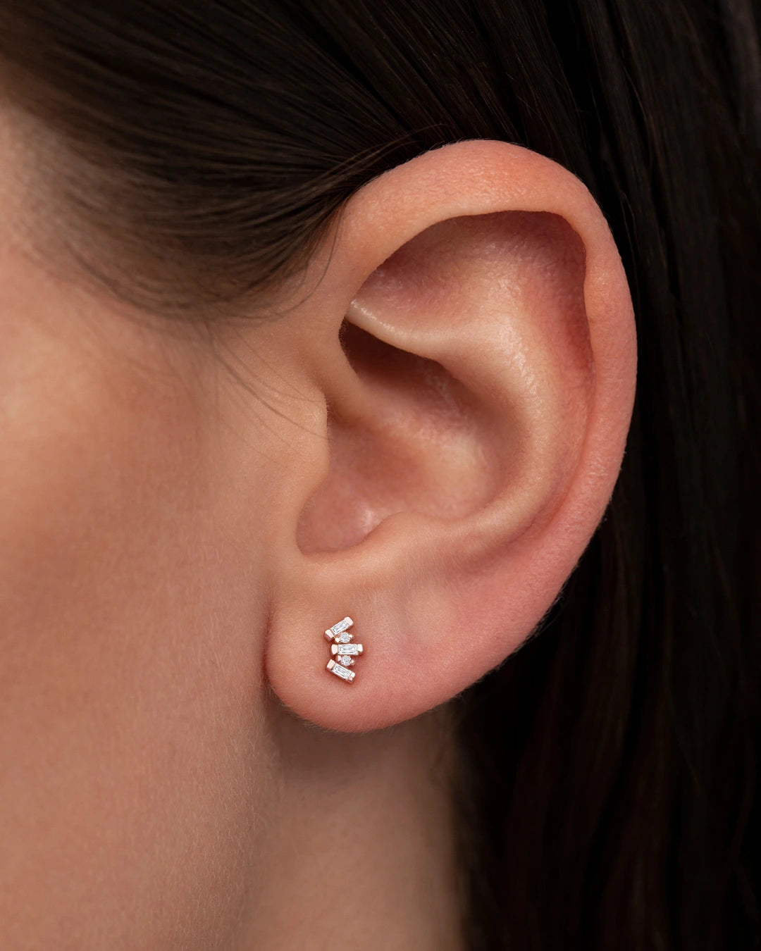 Pendiente Piercing Isabelle de Diamantes en oro rosa de 18 Kt. El piercing ideal para aportar un toque de magia a tu oreja. Su sofisticado diseño refleja cómo trepa por el lóbulo de la oreja, una delicada y brillante escalera formada por una combinación de diamantes en talla baguette y en talla brillante. Posee un cierre de presión o tuerca de mariposa situado en la parte central del piercing para que resulte tan cómodo como bonito. Se trata de un piercing que siempre se mantendrá en la posición correcta gracias a su forma y a su cierre. El complemento perfecto para cualquier ear look. Si lo deseas, puedes pedirlo con un cierre especial de rosca para hélix o cartílago, puedes pedirlo en el menú superior (este extra tiene un coste adicional de 6€).El pendiente piercing Isabelle está disponible en tres versiones, oro rosa, amarillo y blanco de 18 Kt.