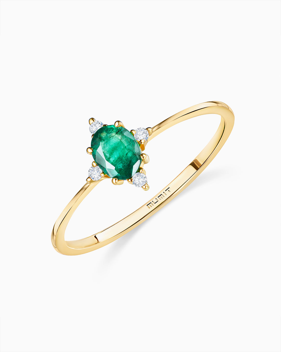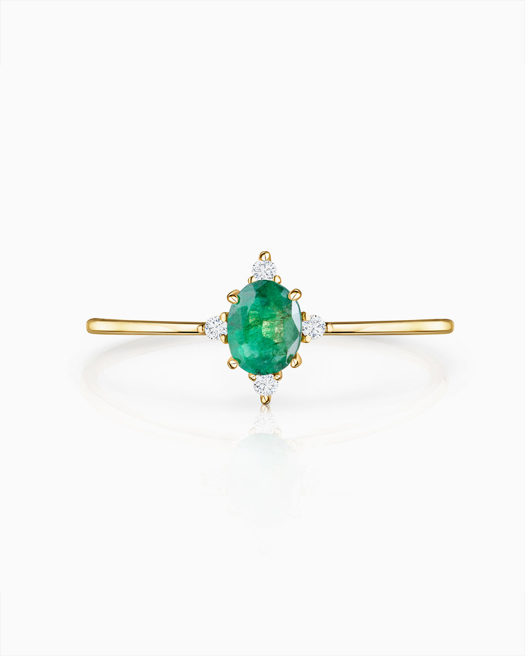 Sortija Crown Oval de Esmeralda en Oro Amarillo de 18 Kt. Inspirada en la historia de la realeza que se mantiene viva a través del brillo de las joyas más preciadas, las coronas y tiaras reales. Las piezas de la colección Crown son una exquisita interpretación minimalista de las imponentes gemas que daban vida a las joyas de La Corona. Una joya llena de color y brillo, la original sortija Crown Oval es la perfecta fusión entre elegancia y modernidad en una joya cuyo protagonista es una esmeralda en talla oval custodiada por cuatro diamantes en talla brillante. Una colección cargada de elegancia moderna que representa pasado y presente a través de su brillo. Las sortijas Crown están disponibles en oro amarillo de 18 Kt y en varias versiones, con gema central en talla marquesa u oval y con rubí, esmeralda o zafiro.