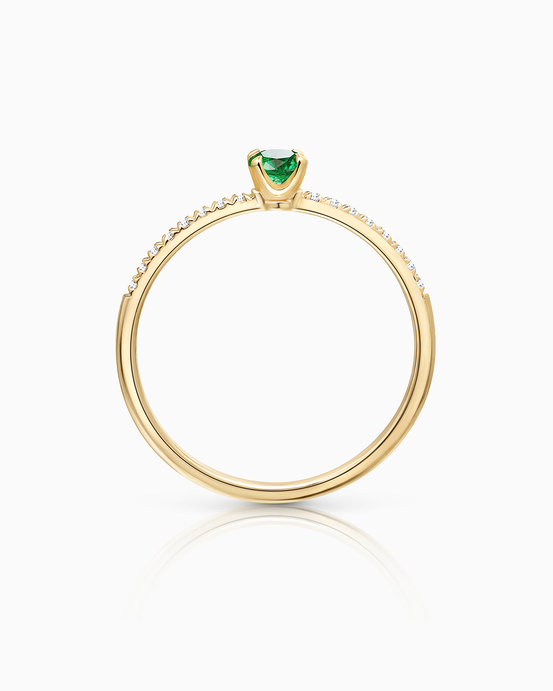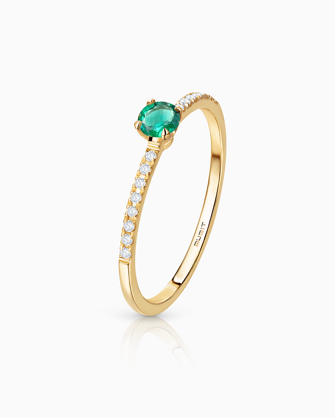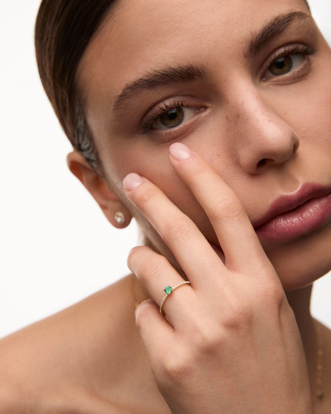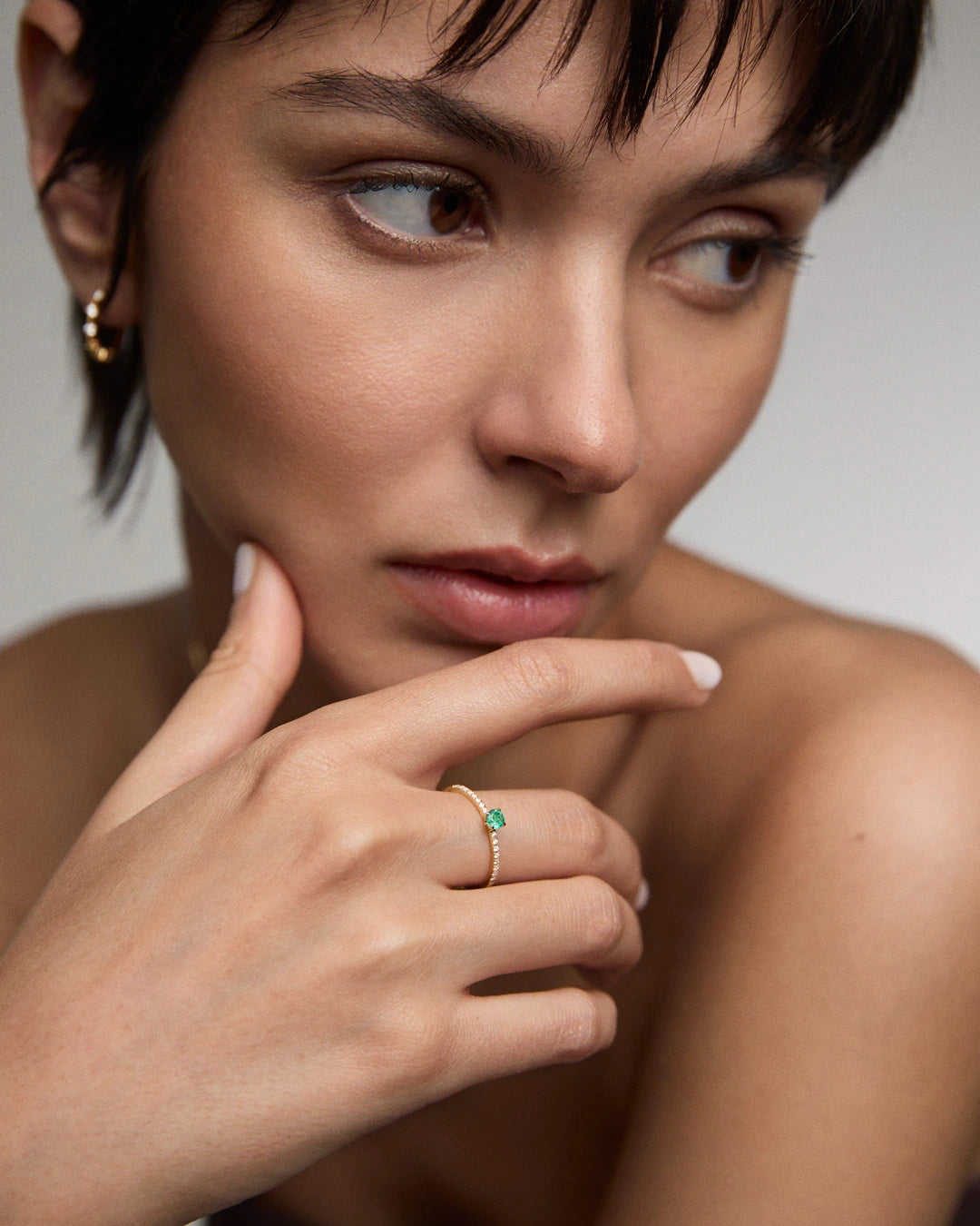 Fresca, alegre y sofisticada. Sylvie nace como una alternativa colorida y versátil al solitario tradicional. En el centro del diseño encontramos una exquisita esmeralda en talla brillante, acompañada por el brillo de un pavé de diamantes naturales que recorre el brazo de la pieza y ensalza la presencia de la gema central. La montura, elaborada en oro amarillo de 18 quilates, crea un contraste cálido que atrae la atención sin sobrecargar el conjunto. Concebida para añadir un exclusivo toque de color a cualquier colección de joyas, esta sortija resulta ideal para combinar con piezas de inspiración minimalista.