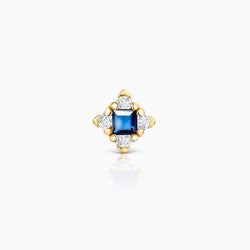 Crown Princess piercing earring in 18k yellow gold with diamonds and a central ruby. The history of royalty as told by the Crown Jewels is the inspiration behind our emblematic Crown collection. The pieces in this majestic collection reflect Mumit's minimalist take on the sublime gems that adorn royal crowns and tiaras. Colourful and bright, the design of the Crown Princess earring features a magnetic princess-cut central ruby nestled inside a diamond border for added sparkle. Add a touch of regal charm to your ear stack with the stunning fusion of elegance and innovation of our Crown Princess pieces. The Crown Princess piercing earring is available with three different gems: emerald, sapphire and ruby.If you wish, you can order it with a special bullet earring safety back ideal for helix or cartilage. This can be ordered from the drop-down menu above (this option has an additional cost of €6). Additionally, you can order a special flat back earring post (this option has an additional cost of €25). Join the piercing party and style your ears with Mumit!