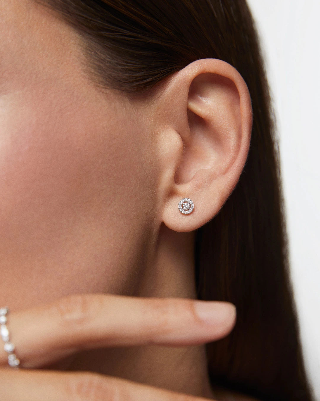 18k gold, diamonds and the glow of a starlit night. Mumit's Ariadne collection pays tribute to the stories we tell to make sense of the wonders of the night sky. Each piece features a central diamond surrounded by a floating halo, reminiscent of a delicate crown of stars. Discover its ethereal elegance and the legend behind it.