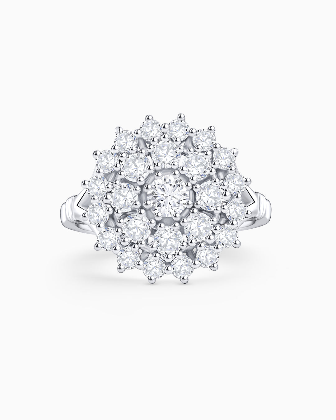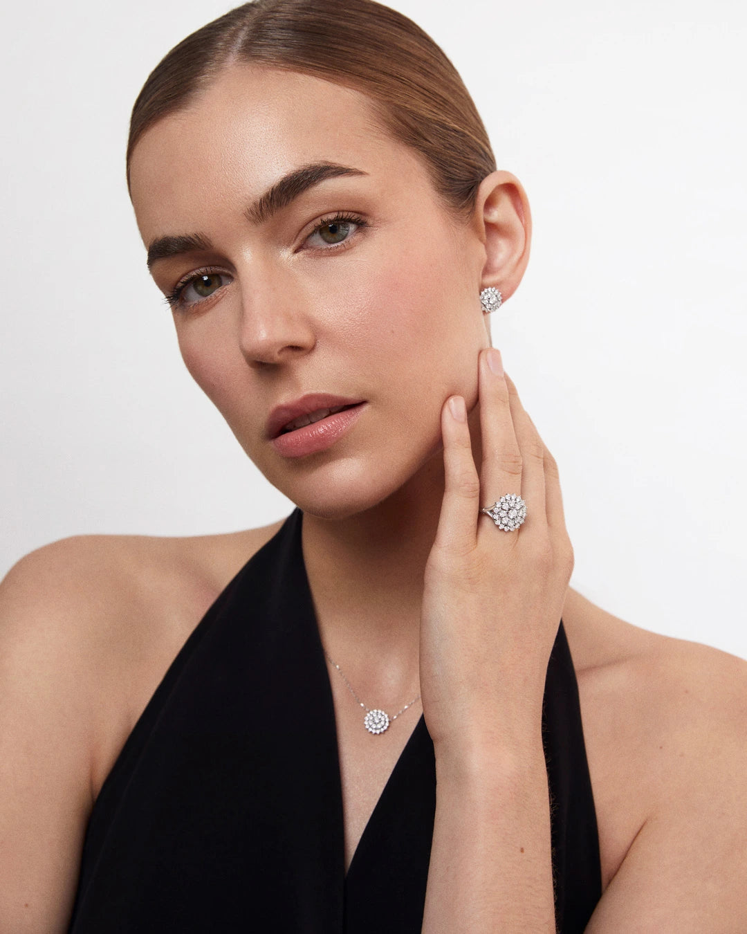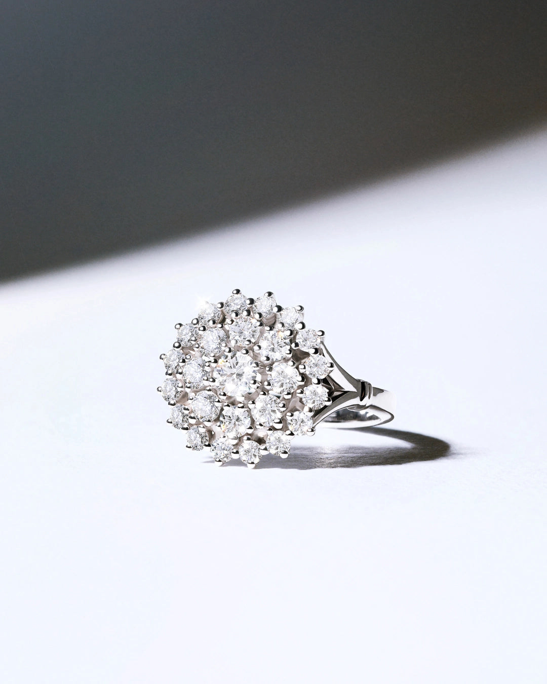 The Blossom ring takes its inspiration from the geometric patterns found in nature, particularly from the delicate perfection of flowers. The design is defined by 25 natural brilliant-cut diamonds, positioned in a concentric arrangement that creates depth and volume. The result is a sophisticated piece that comes to life with every movement, echoing the moment petals begin to unfurl. Each diamond is carefully set in delicate claws that enhance its radiance from every angle, highlighting the purity of each stone and the beauty of the design. As an enduring symbol of grace and transformation, Blossom is made for life’s most important moments.