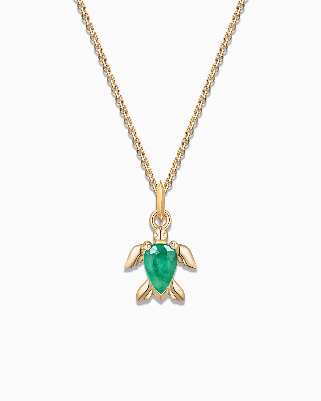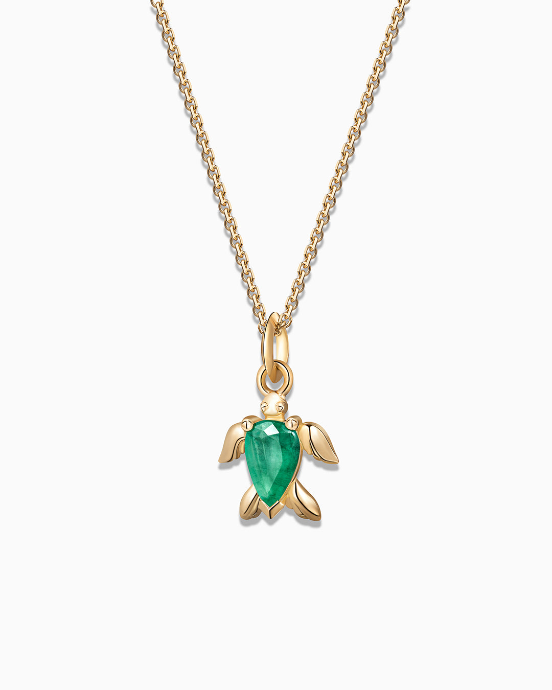 Small Turtle emerald charm pendant in 18k yellow gold. Each of Mumit's Luxury Charms offers an opportunity to connect with your memories, your deepest dreams, or unique aspects of your personality. Thanks to the durability of 18 karat gold, this small talisman that holds immense emotional value will accompany you for a lifetime. Moreover, the bail is a Mumit exclusive design, crafted to achieve a harmonious look when you combine multiple charms on the same chain. Start your own collection and explore the most personal side of the jewelry world. Turtles are a symbol of: longevity, persistence, reliability, stability, peace.