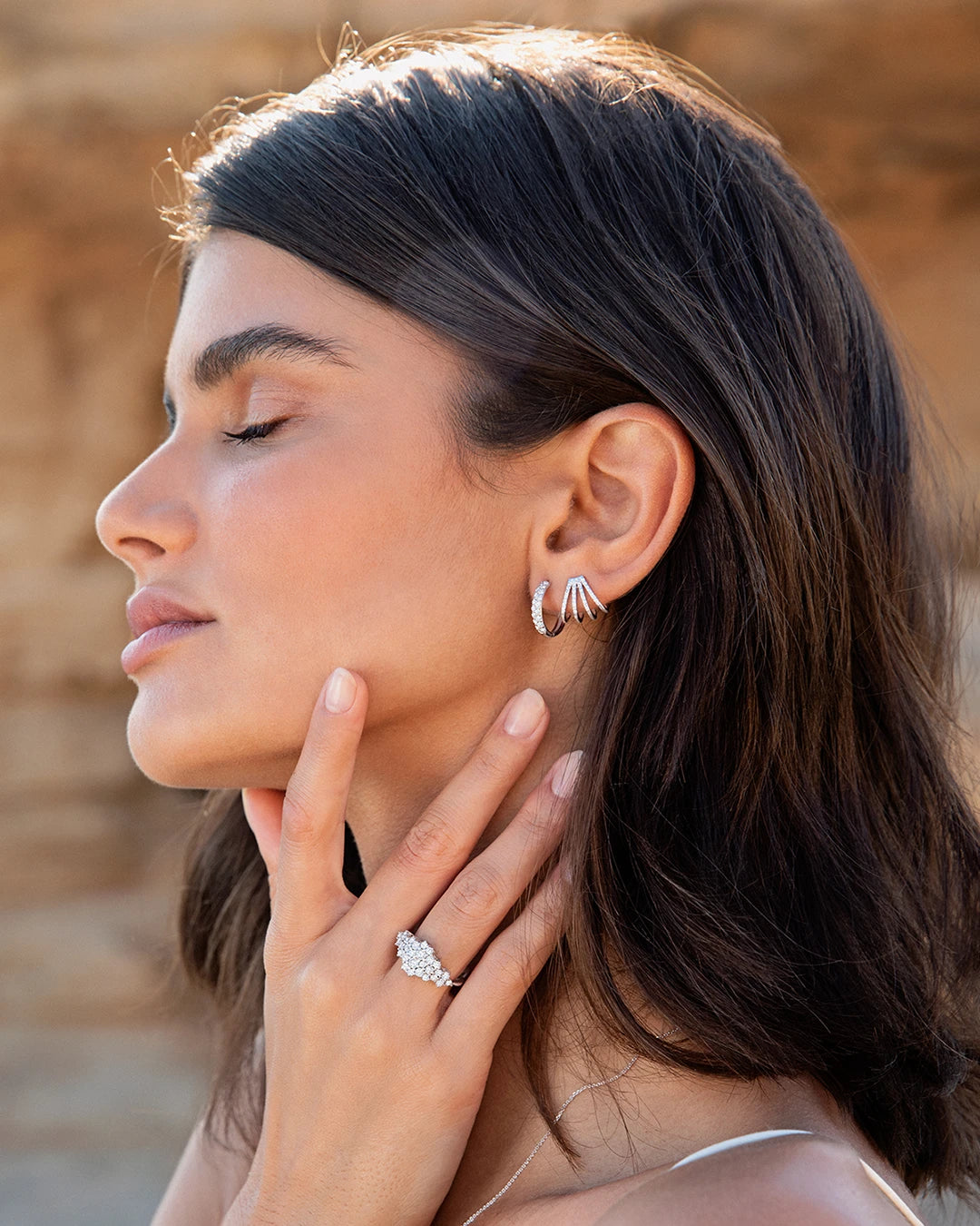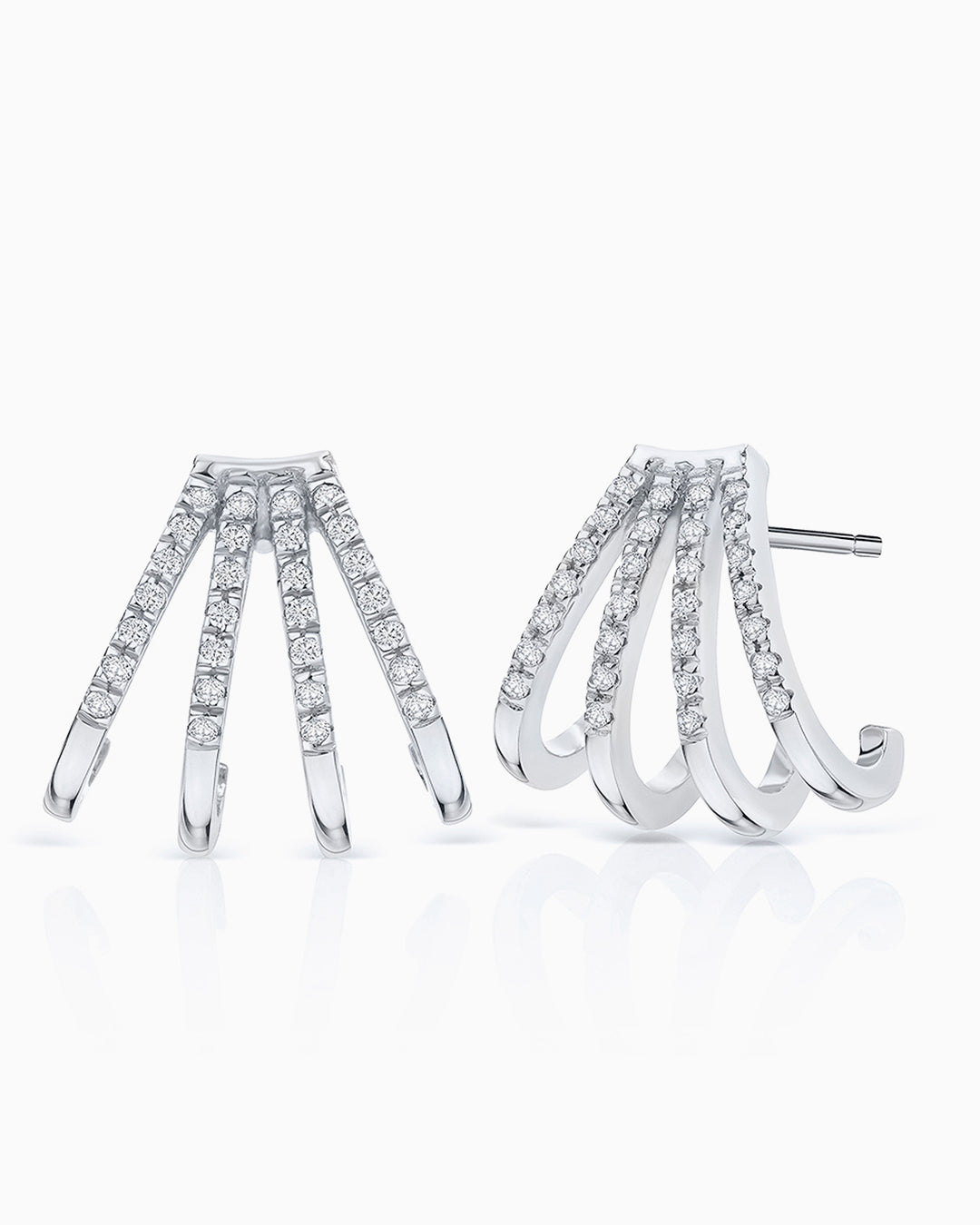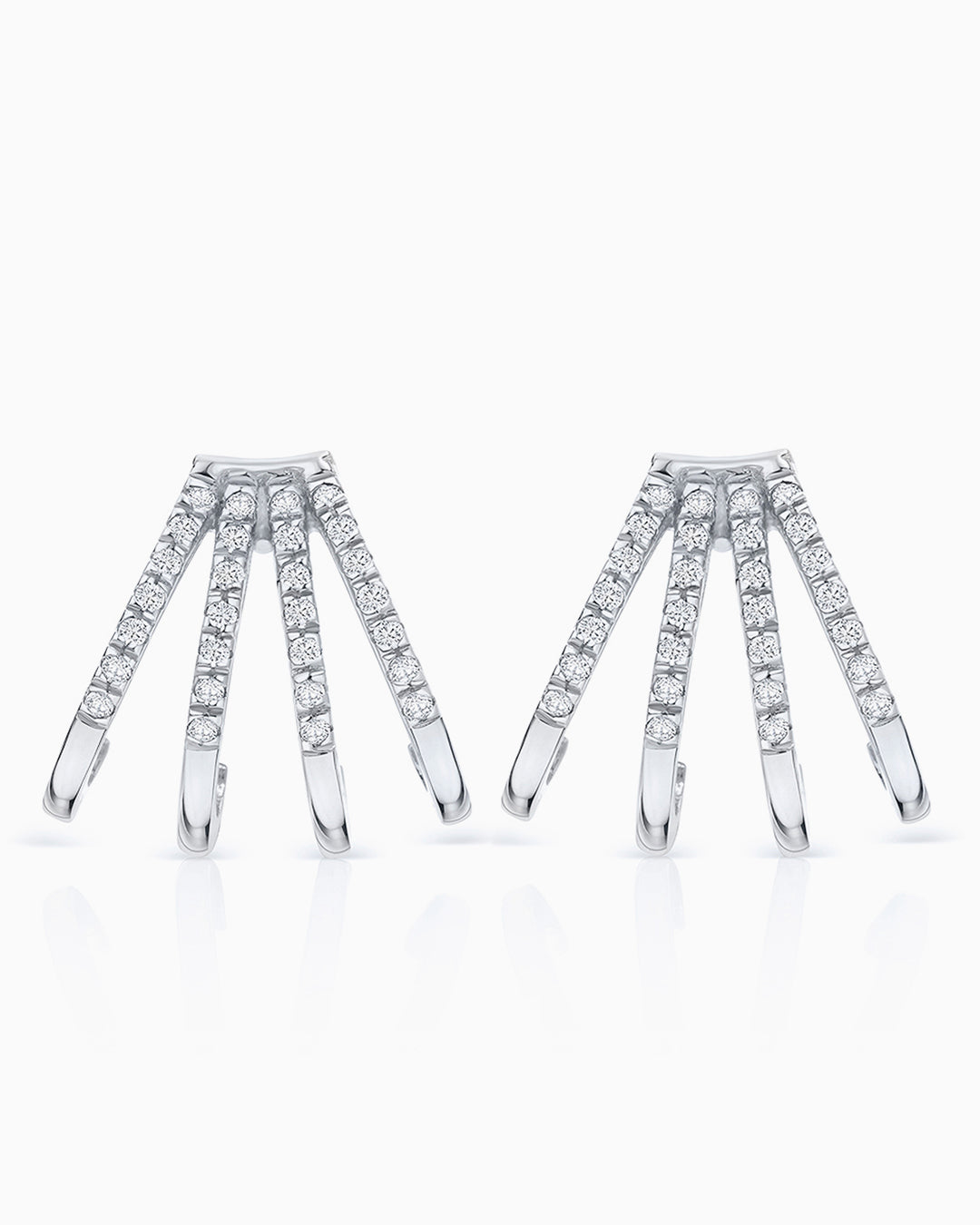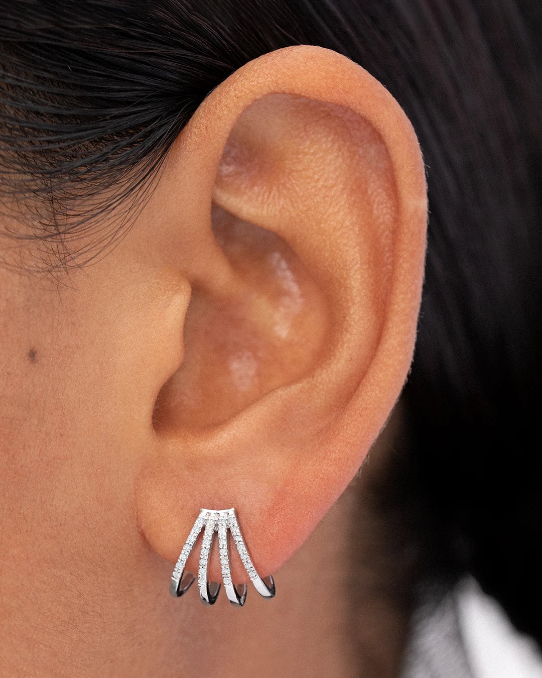 April diamond earrings set in delicate 18k white gold hoops. The revolution in fine jewelry is embodied in the design of the April diamond earrings. Their originality and authenticity make them fine jewelry the like of which you have never seen before. Inspired by the effect of multiple piercings in the ear, April earrings are the alternative you’ve been looking for if you only have one piercing in your earlobe. Four delicate micropavé diamond hoops have the perfect diameter to fit at any angle of the ear creating a unique effect. Bring the revolution in fine jewelry to your ear with elegance and originality.The April earrings are available in two versions, 18k yellow gold and white gold. Join the fashion trend and bring style to your ears with diamonds from Mumit!
